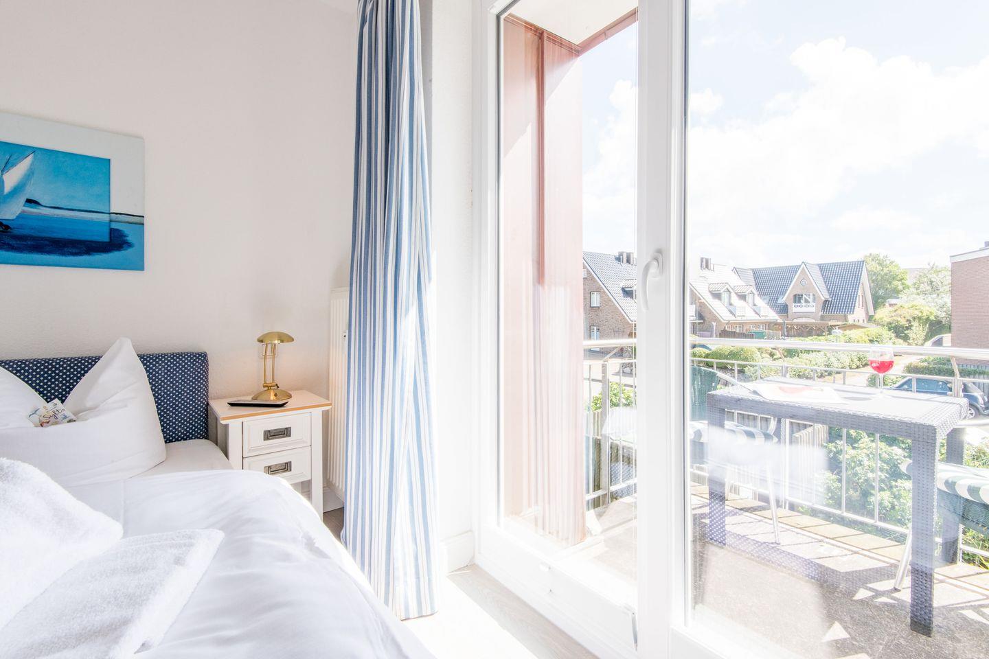 Das Schlafzimmer ist mit einem Doppelbett (2x 80x200 cm) und einem großzügigen Kleiderschrank ausgestattet und bietet direkten Zugang zum möblierten Balkon nach Osten – perfekt, um den Morgen gemütlich zu beginnen.