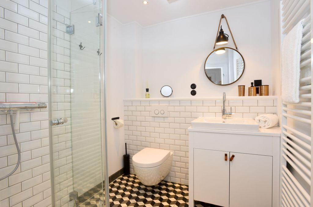 Die Wohnung verfügt über zwei moderne Badezimmer mit hochwertigen Duschen, WC, Föhn und Handtuchwärmer. Das zweite Badezimmer bietet zudem Tageslicht, was den Raum besonders freundlich und einladend macht.