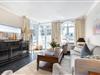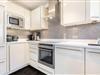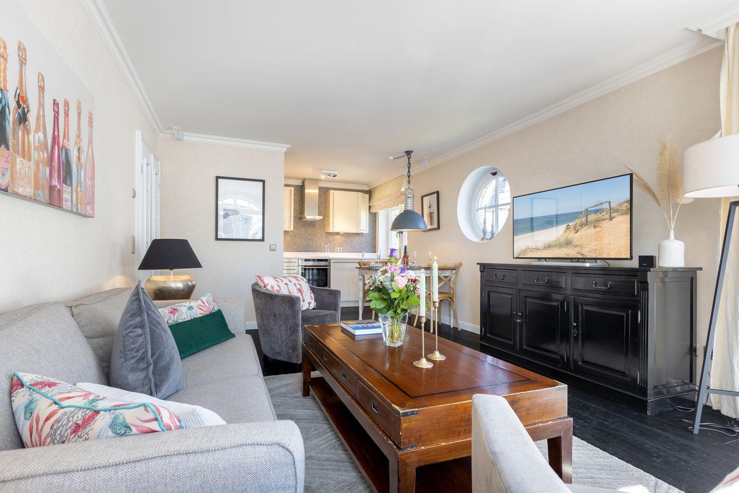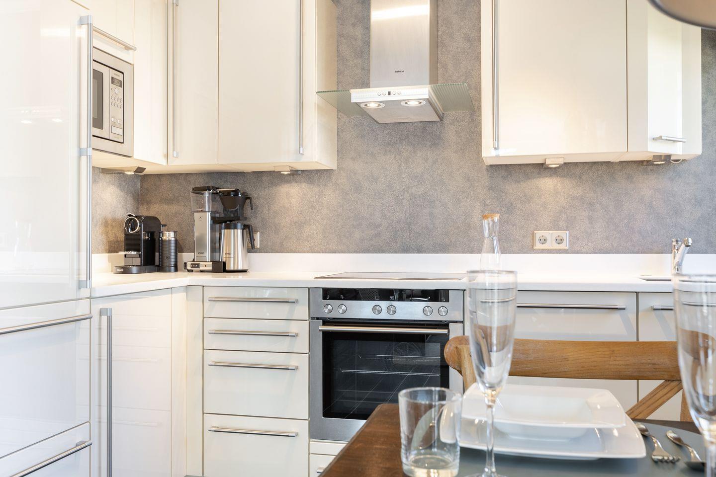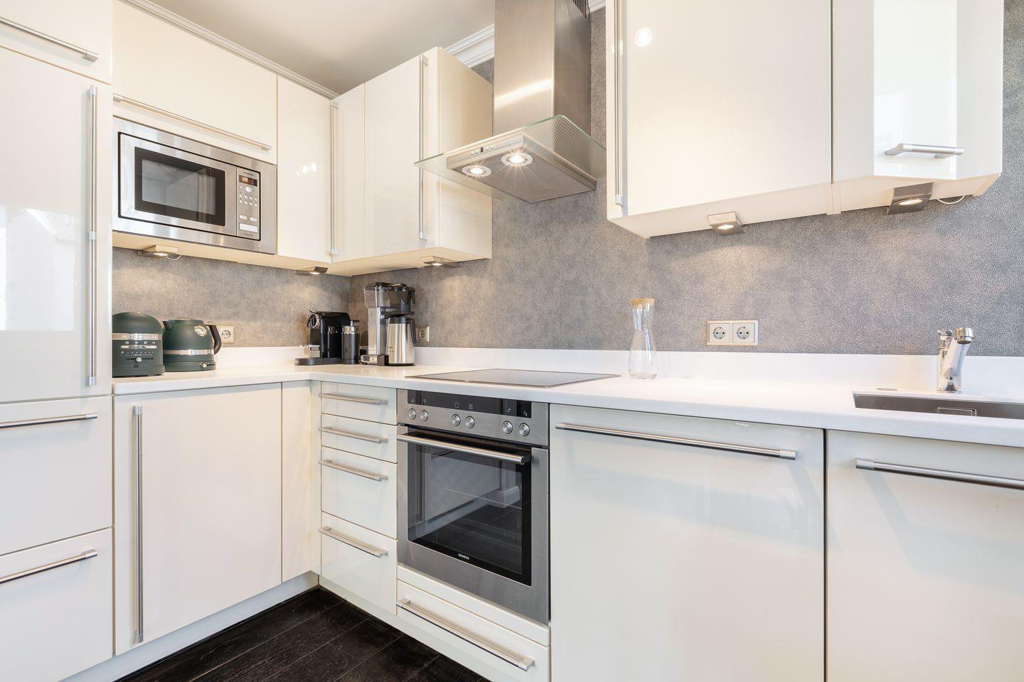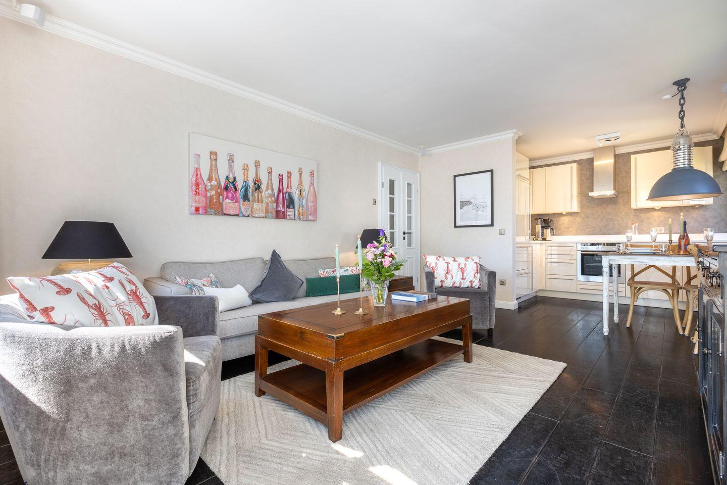Das geschmackvolle Wohnzimmer ist mit einem großen Sofa, zwei Sesseln und einem Esstisch für 4 Personen ausgestattet. Ein direkter Zugang zum möblierten Balkon nach Süden bietet eine perfekte Möglichkeit, die Sonne zu genießen. Die offene Küche ist elegant mit Marmor ausgestattet und bietet modernen Komfort mit Geschirrspüler, Backofen, Herd, Mikrowelle und DeLonghi-Espressomaschine mit Milchaufschäumer.
