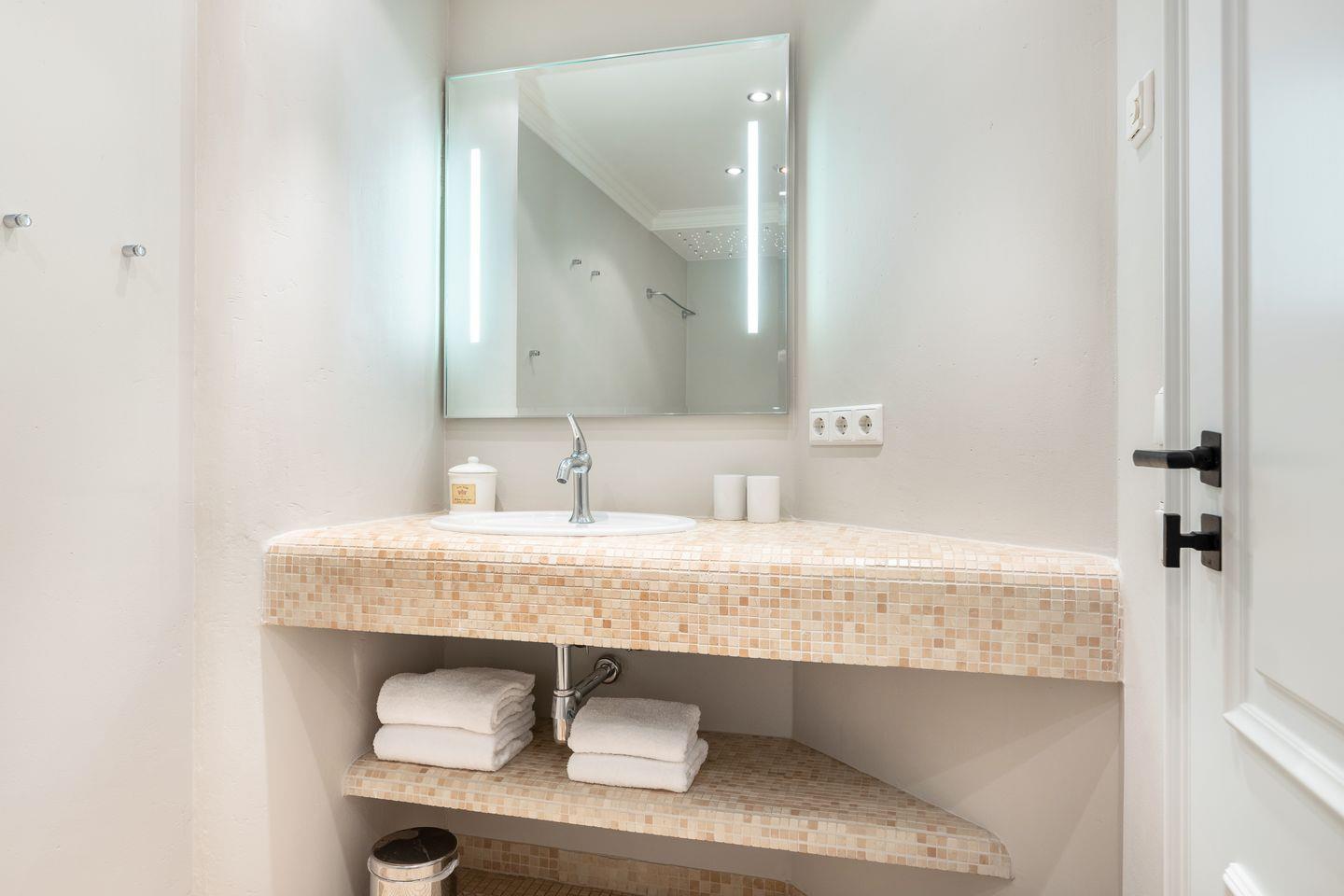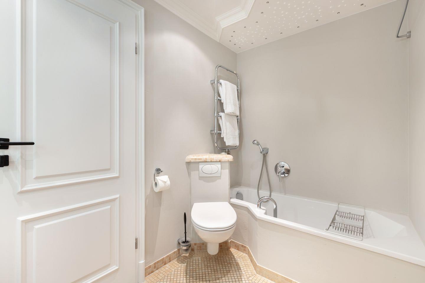 Die Badezimmer bieten optimalen Komfort: Ein Vollbad mit Badewanne, Lichttherapie, Handtuchwärmer, WC und Föhn sowie ein modernes Duschbad mit ebenerdiger Dusche, WC, Handtuchwärmer und Föhn.