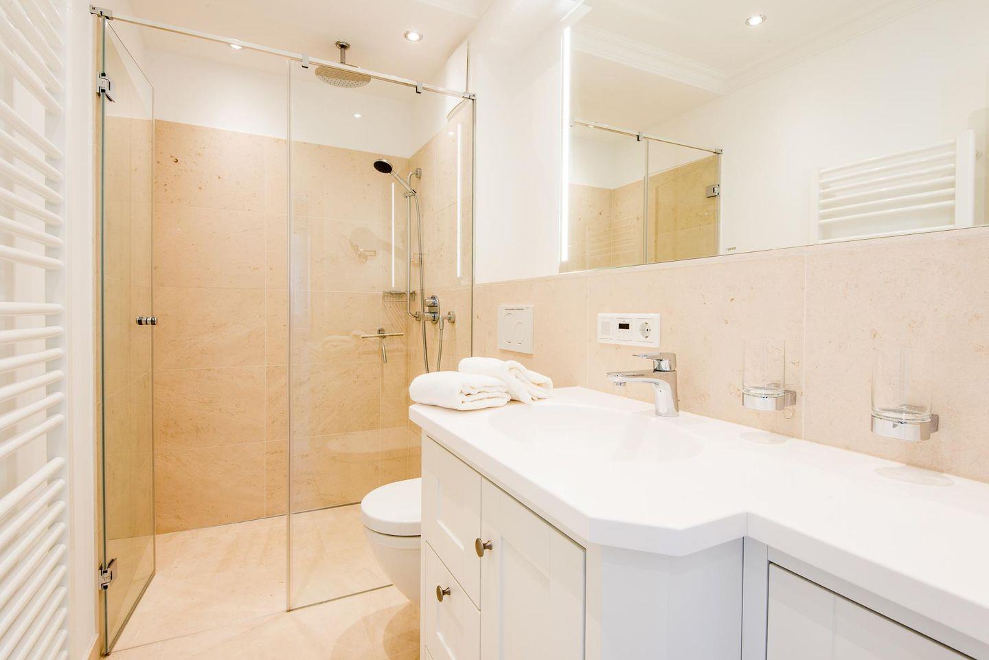 Das Badezimmer ist funktional und stilvoll eingerichtet, mit ebenerdiger Dusche, WC, Handtuchwärmer und Fön – ideal für einen entspannten Start in den Tag.