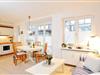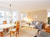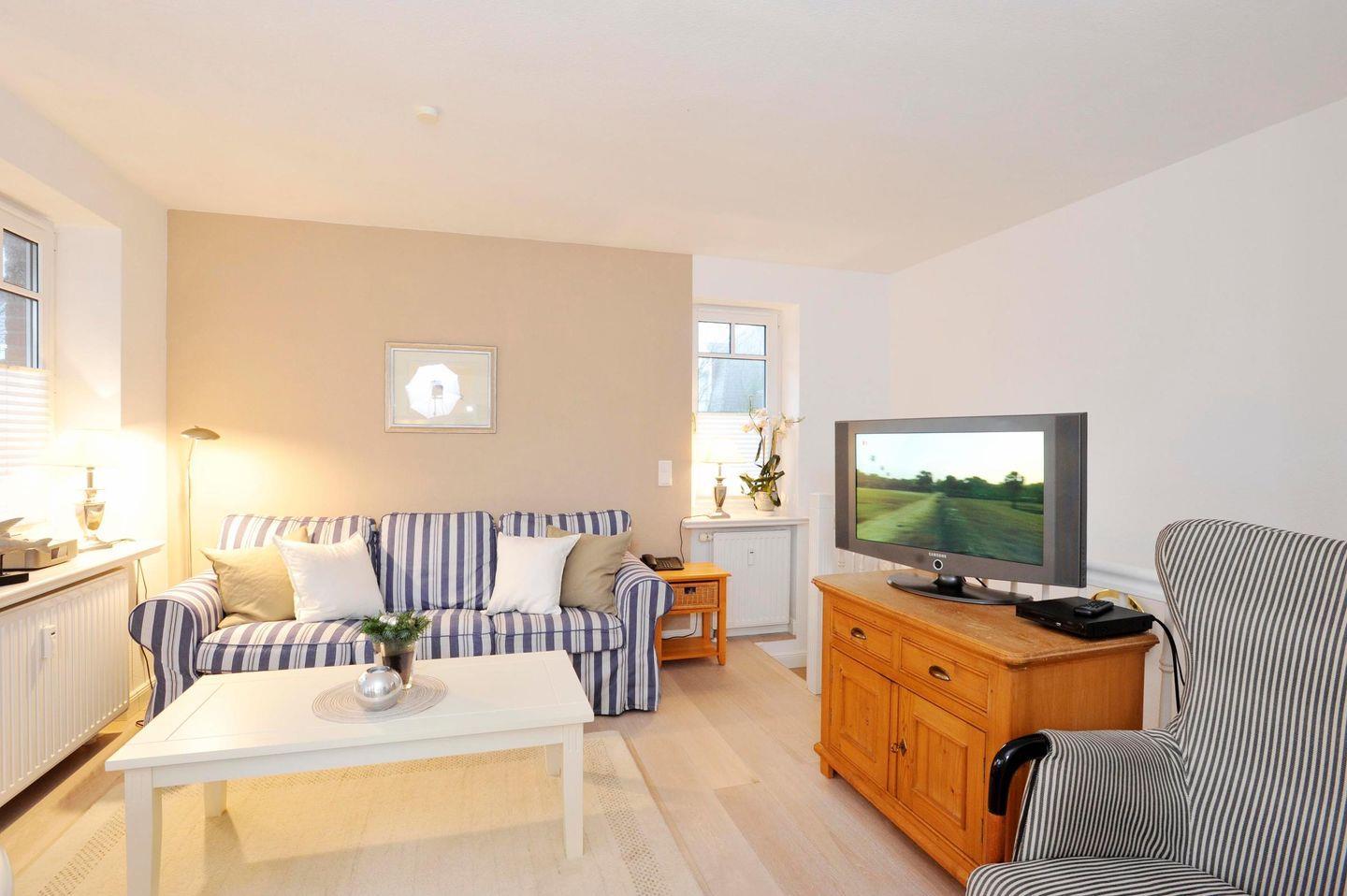 Das helle Wohnzimmer ist mit einem Sofa für drei Personen, einem Sessel, einem TV und einem Esstisch mit vier Stühlen ausgestattet. Von hier haben Sie direkten Zugang zur möblierten Westterrasse, die sich ideal für entspannte Stunden im Freien eignet.