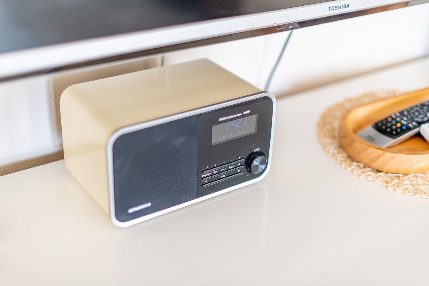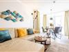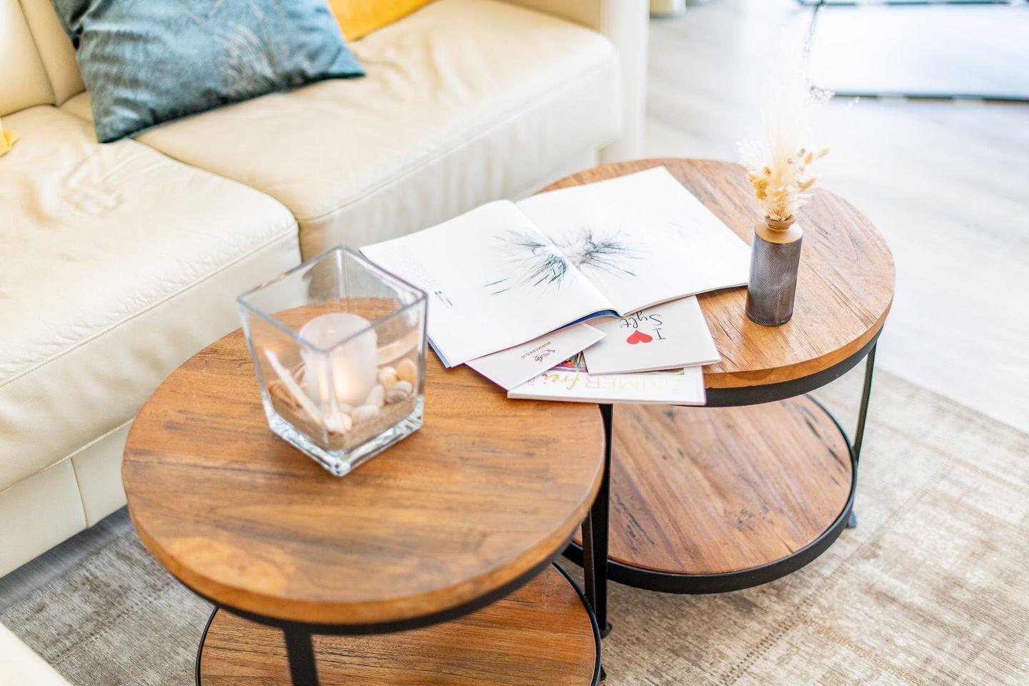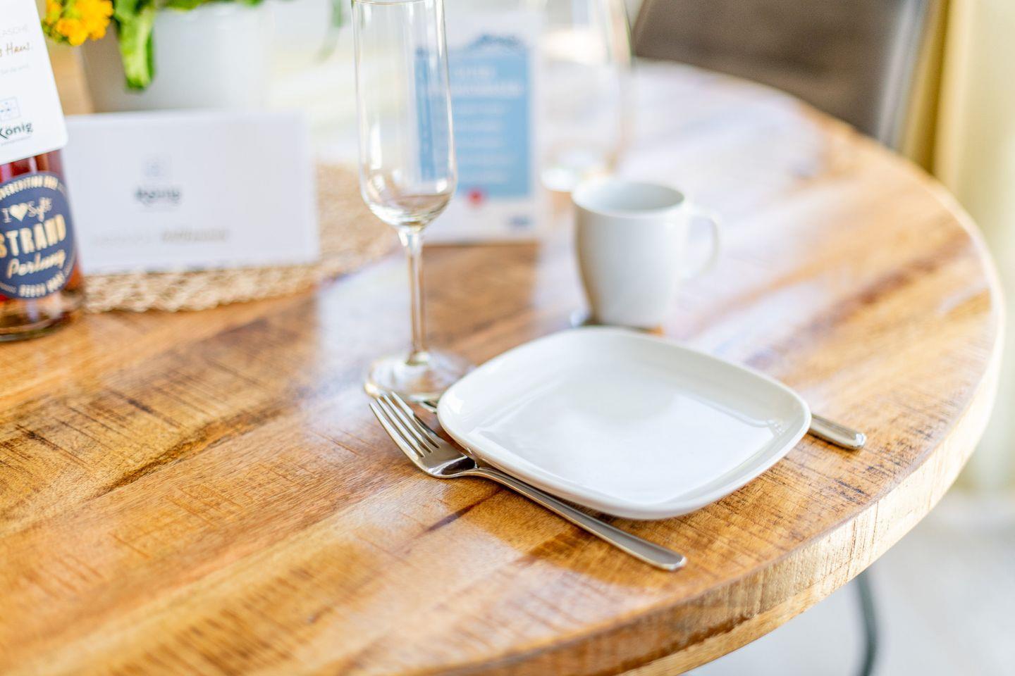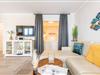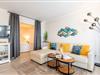 Das lichtdurchflutete Wohnzimmer ist ausgestattet mit einem ausziehbaren Schlafsofa (140x200 cm), einem Esstisch mit 4 Stühlen und einem TV. Vom Wohnbereich haben Sie direkten Zugang zum möblierten Balkon nach Norden – ideal, um die frische Meeresluft zu genießen.