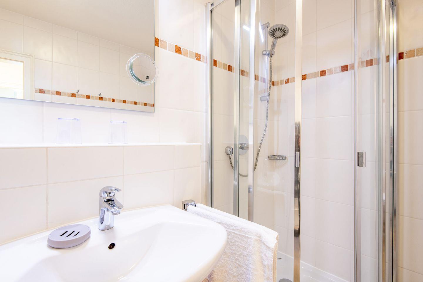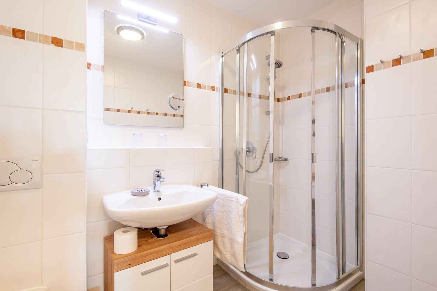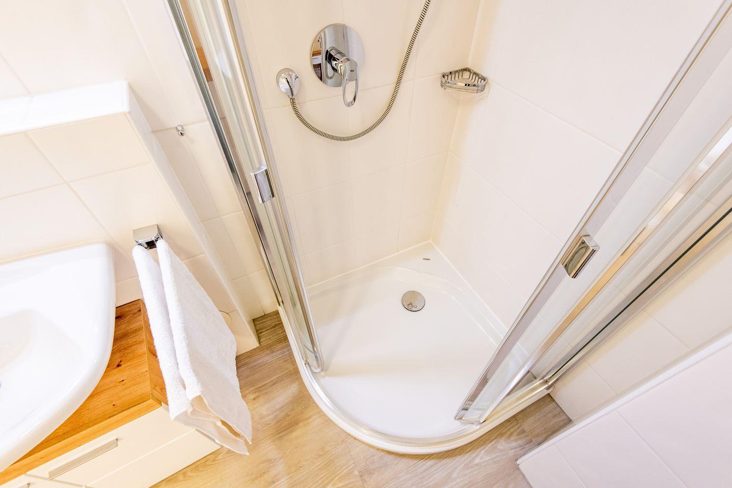 Im halboffenen Schlafzimmer erwartet Sie ein bequemes Doppelbett (2x 90x200 cm) sowie ein Einbauschrank und ein TV für entspannte Abende. Das Badezimmer verfügt über eine bodengleiche Dusche, WC und Föhn.