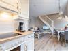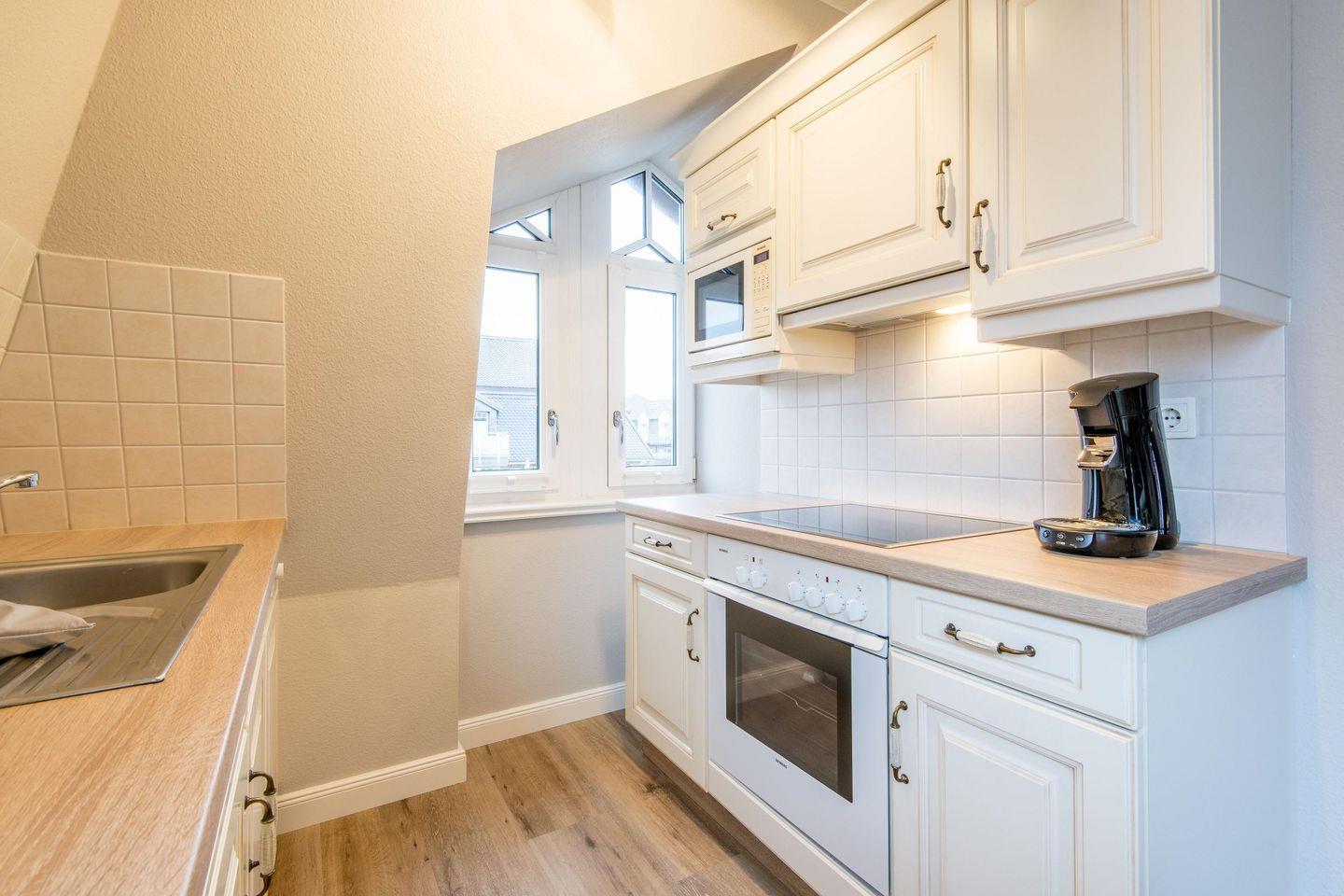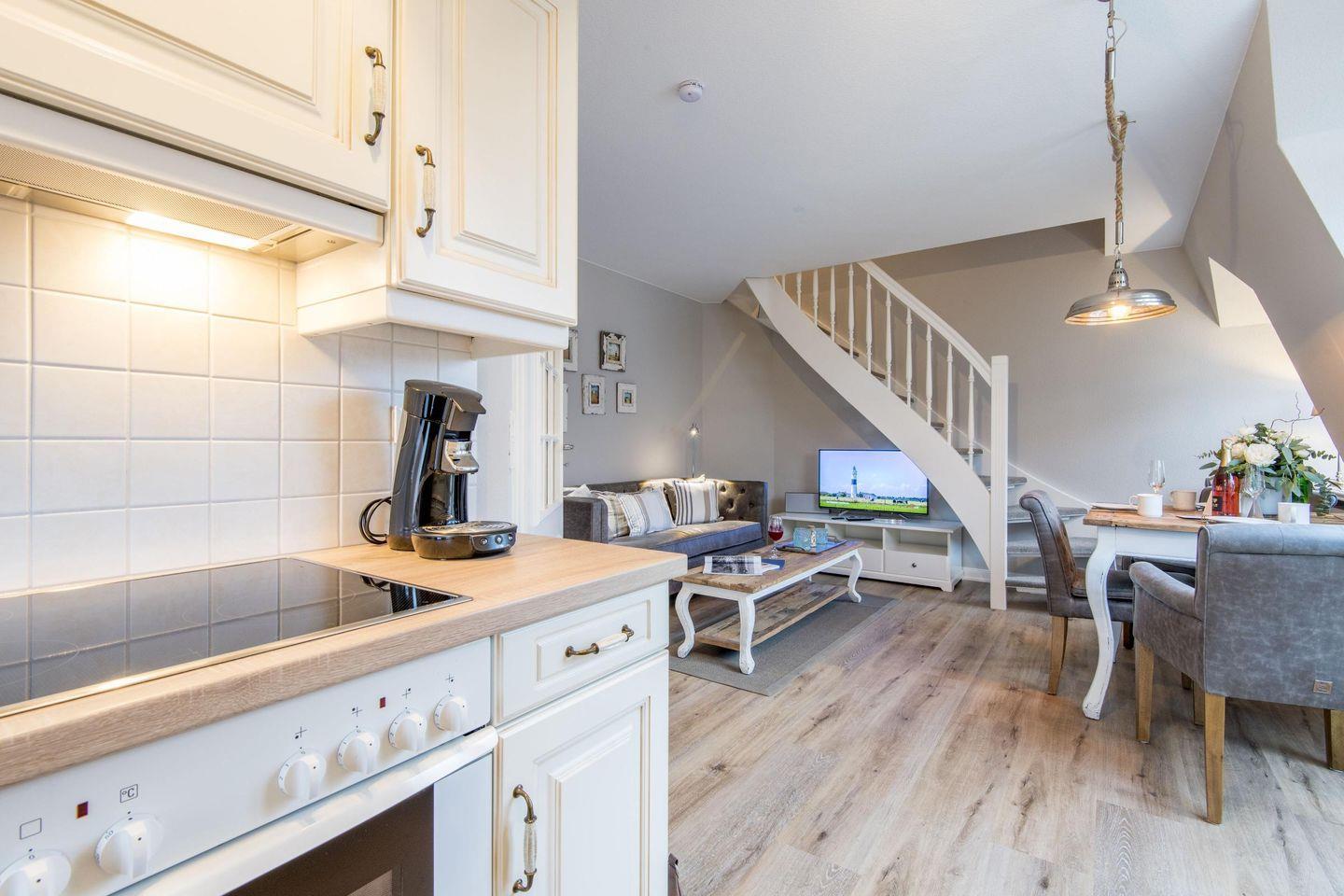Die offene Einbauküche ist modern ausgestattet und bietet allen Komfort, den Sie für Ihren Aufenthalt benötigen. Mit einem Geschirrspüler und einer Filterkaffeemaschine ist alles vorhanden, um Ihre Mahlzeiten entspannt vorzubereiten.