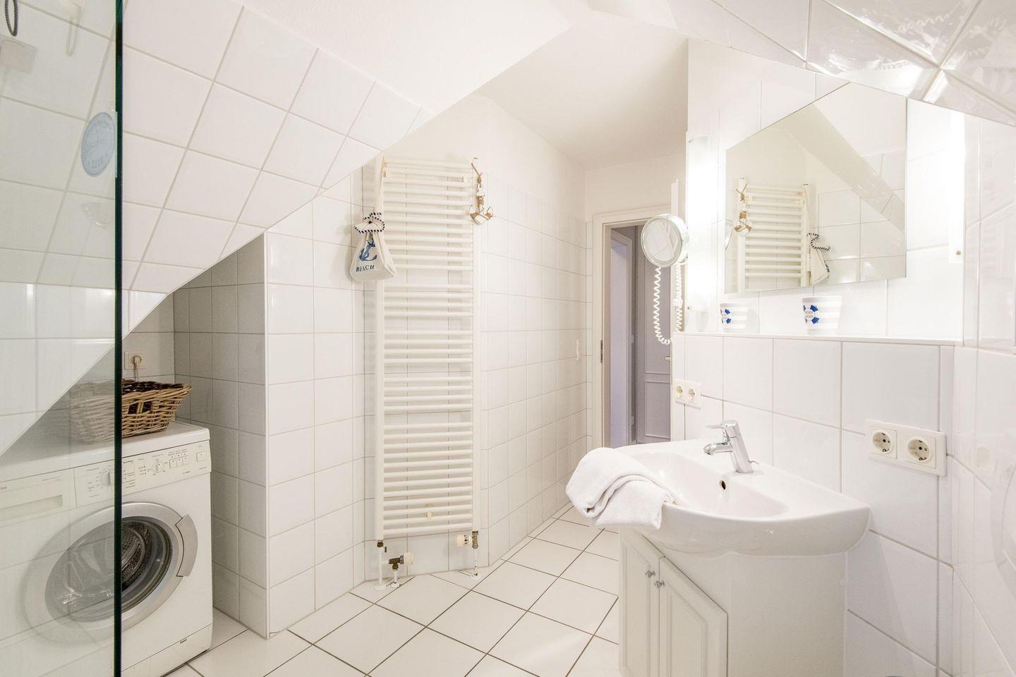 Das Tageslicht-Badezimmer bietet eine Badewanne mit integrierter Dusche, ein WC, Fußbodenheizung, eine Waschmaschine, einen Handtuchwärmer und einen Föhn – ideal für entspannende Momente nach einem langen Strandtag.