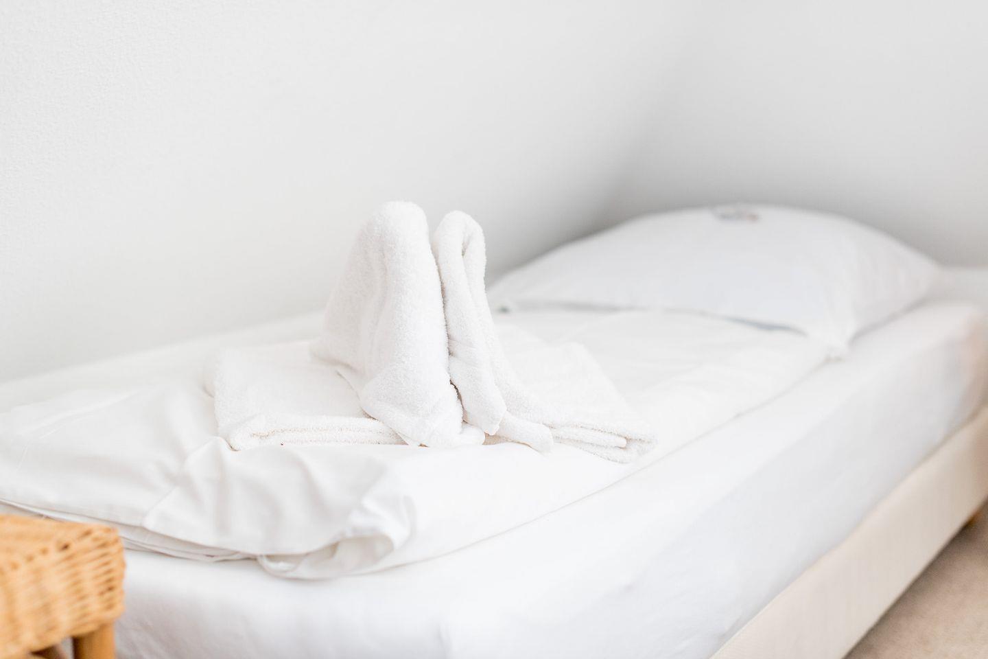 Die Wohnung verfügt über zwei Schlafzimmer. Das Hauptschlafzimmer ist mit einem komfortablen Doppelbett (2x 90x200 cm), einem TV und einer Kommode ausgestattet. Das zweite Schlafzimmer bietet zwei Einzelbetten (je 90x200 cm) und einen Kleiderschrank – ideal für Familien oder Freunde.