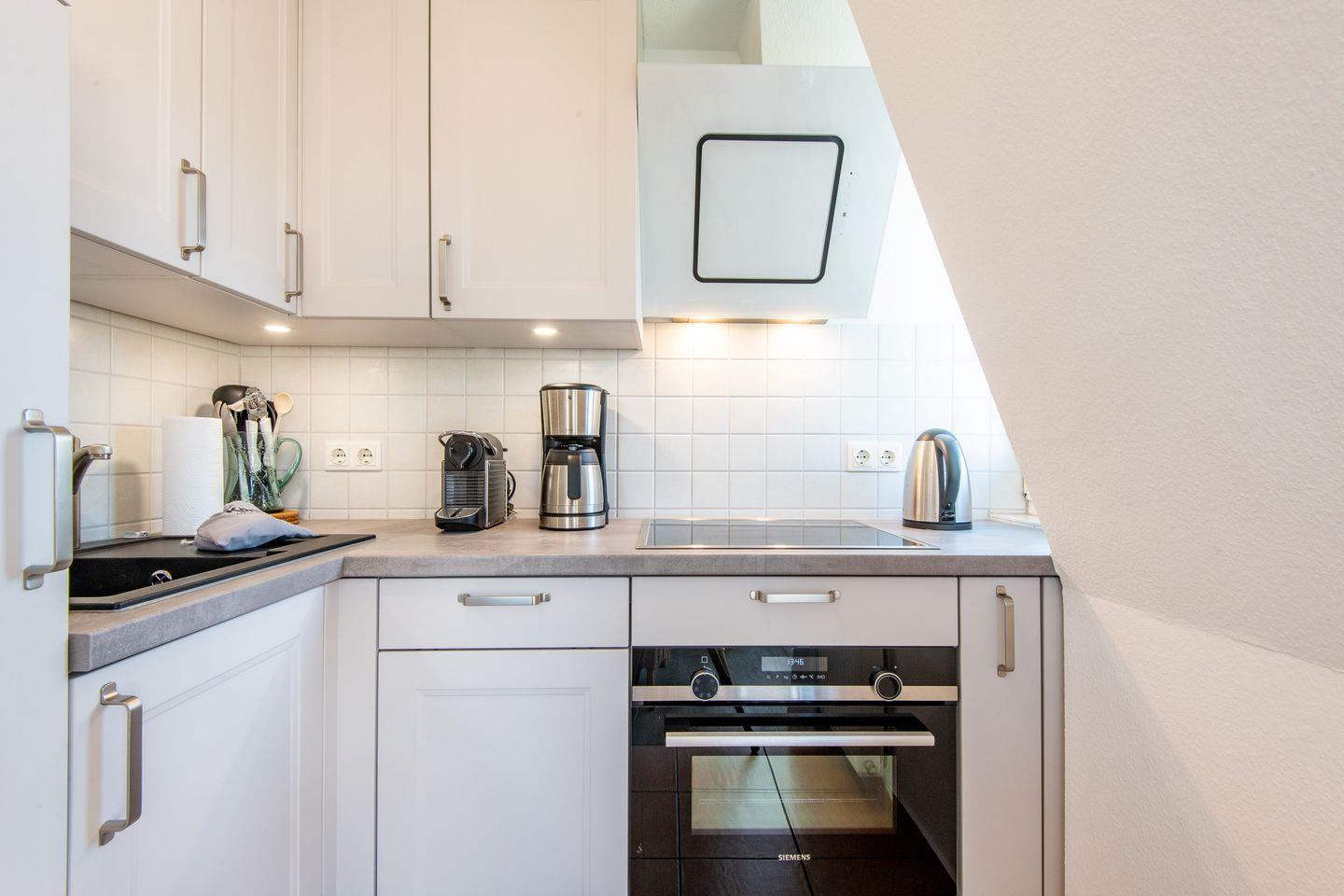 Die moderne offene Küche ist vollständig ausgestattet und bietet alle Annehmlichkeiten, darunter ein Cerankochfeld, einen Backofen, eine Filterkaffeemaschine und eine Nespresso-Maschine. Hier können Sie bequem Ihre Mahlzeiten zubereiten und genießen.