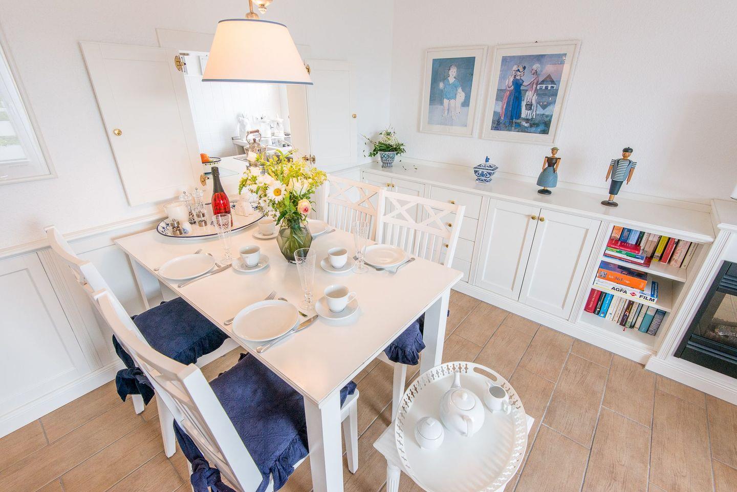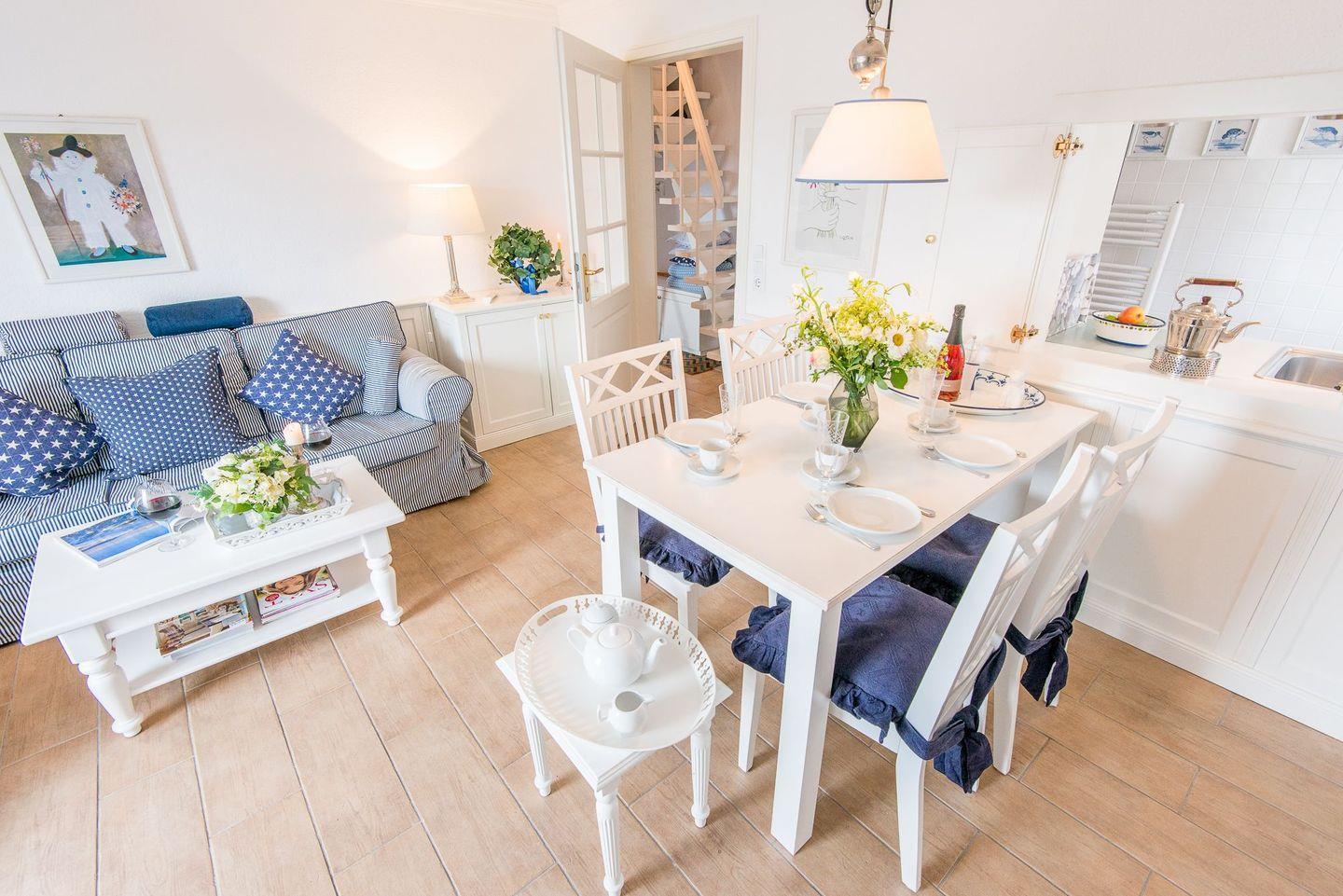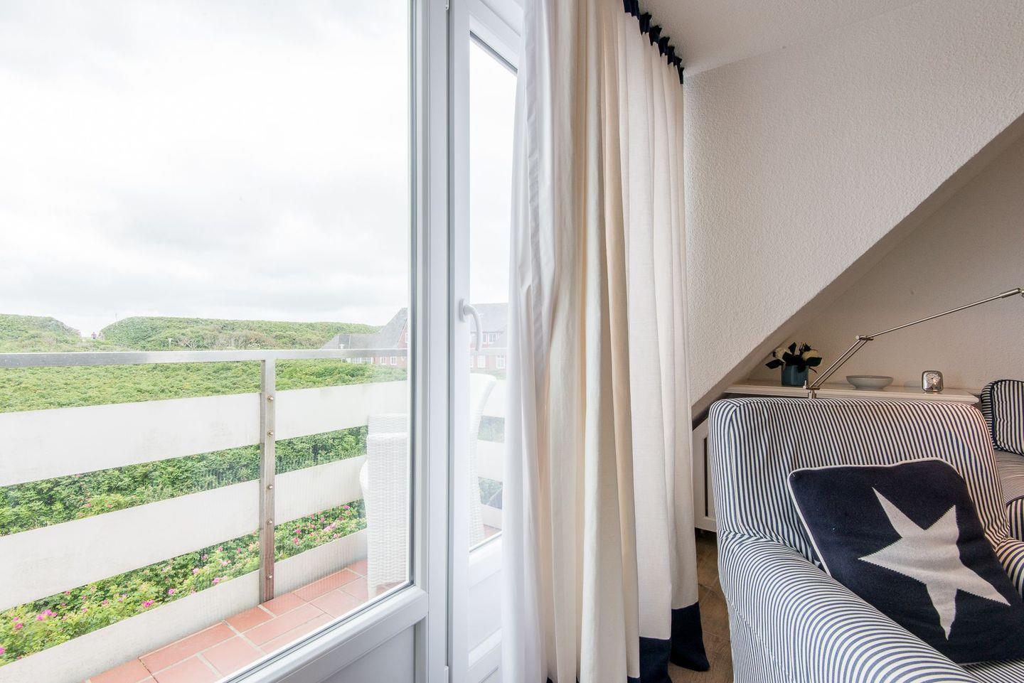 Der Wohn- und Essbereich der Wohnung ist komfortabel und gemütlich eingerichtet. Einladende Sitzgelegenheiten und ein Esstisch für 4 Personen bieten Raum für gemeinsame Mahlzeiten und erholsame Stunden. Vom Wohnzimmer aus gelangen Sie direkt auf den sonnigen Balkon, der zum Verweilen einlädt und den Blick über die Dünen freigibt.