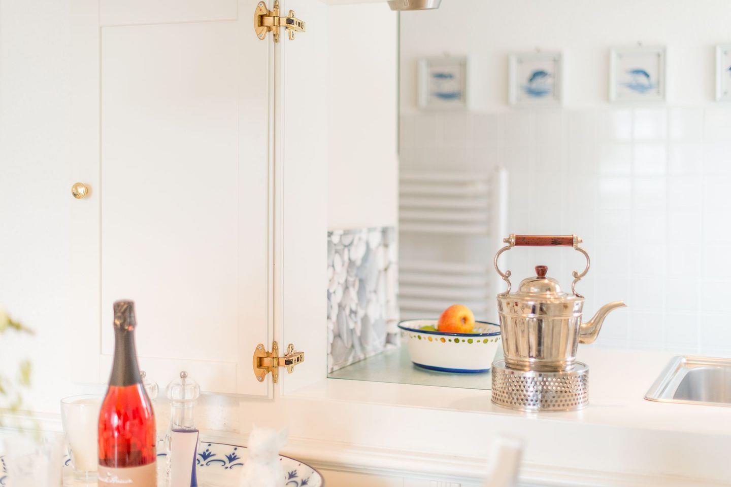 Die separate Küche ist funktional und modern ausgestattet. Hier finden Sie alle notwendigen Geräte, darunter ein Cerankochfeld, einen Backofen und eine Filterkaffeemaschine – ideal für die Zubereitung köstlicher Mahlzeiten in Ihrer Ferienwohnung.