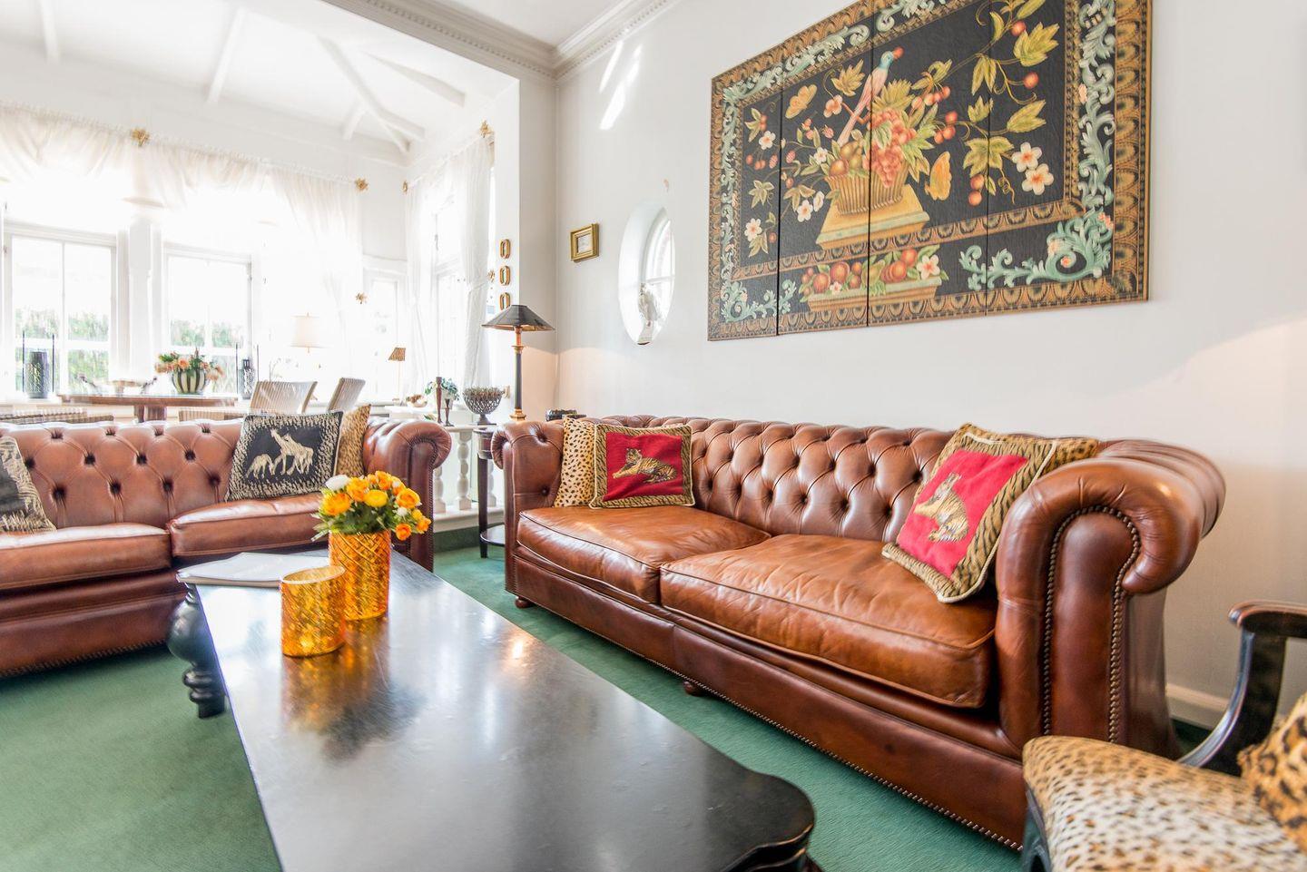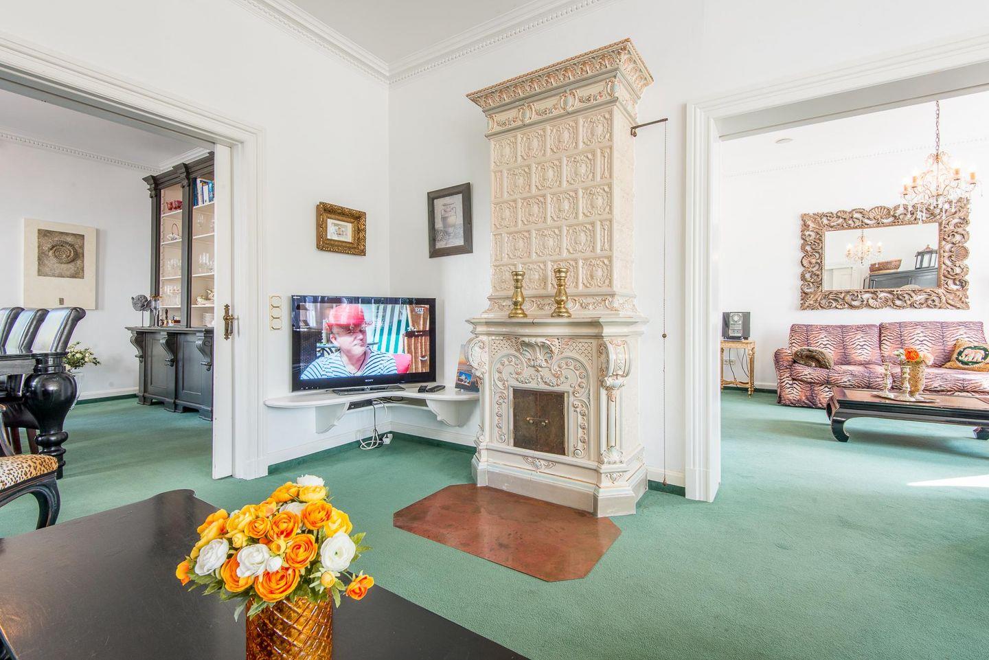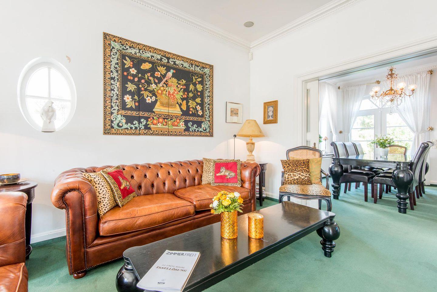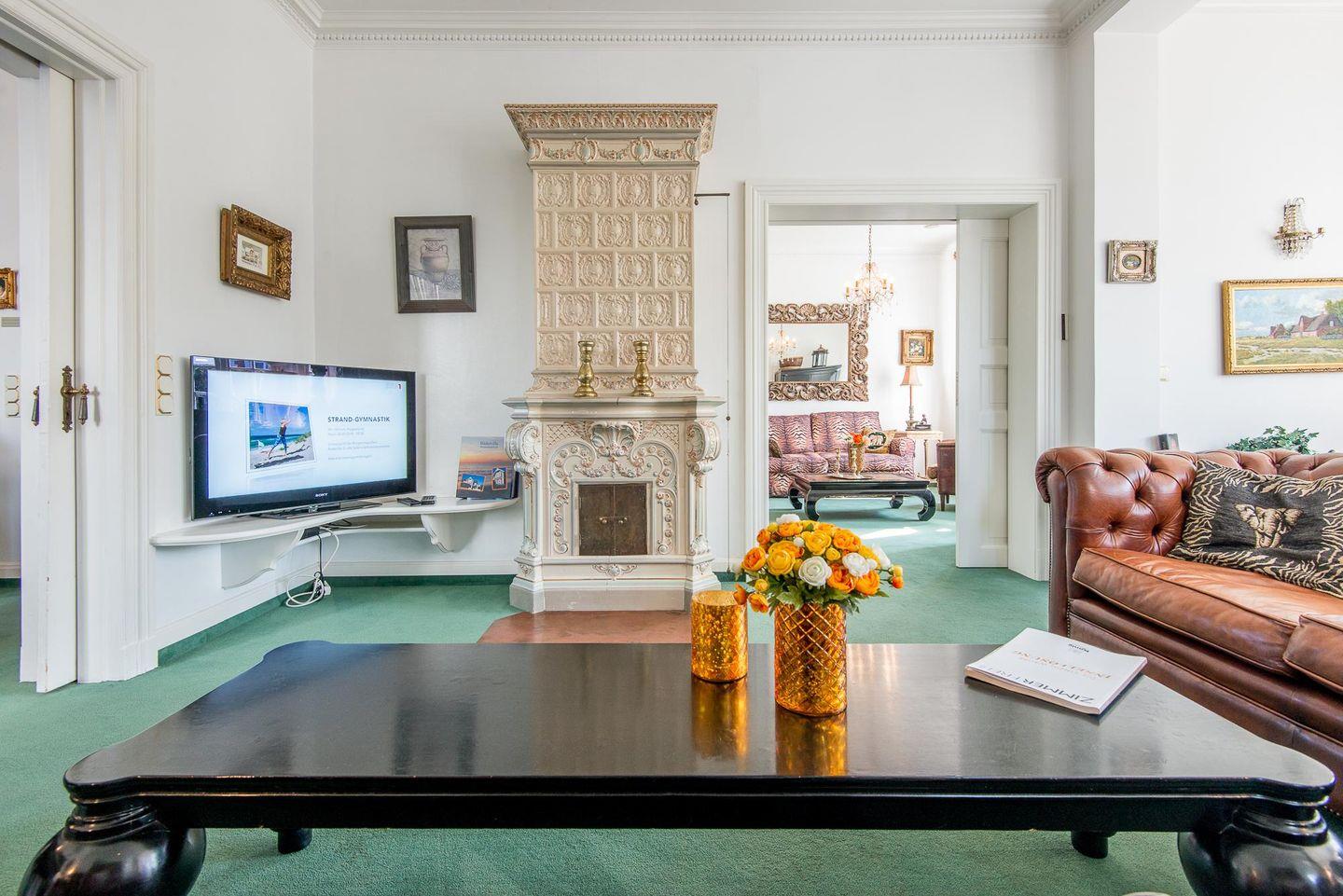 Das elegante Wohnzimmer lädt mit seinem Wintergarten und dem gemütlichen Kamin zu entspannten Stunden ein. Für Unterhaltung sorgen ein moderner TV und eine hochwertige B&O Stereoanlage. Hier können Sie sich nach einem Tag voller Erlebnisse zurückziehen, die Füße hochlegen und den Abend bei knisterndem Kaminfeuer ausklingen lassen. Der Wintergarten sorgt zudem für viel Licht und bietet einen herrlichen Blick ins Grüne.