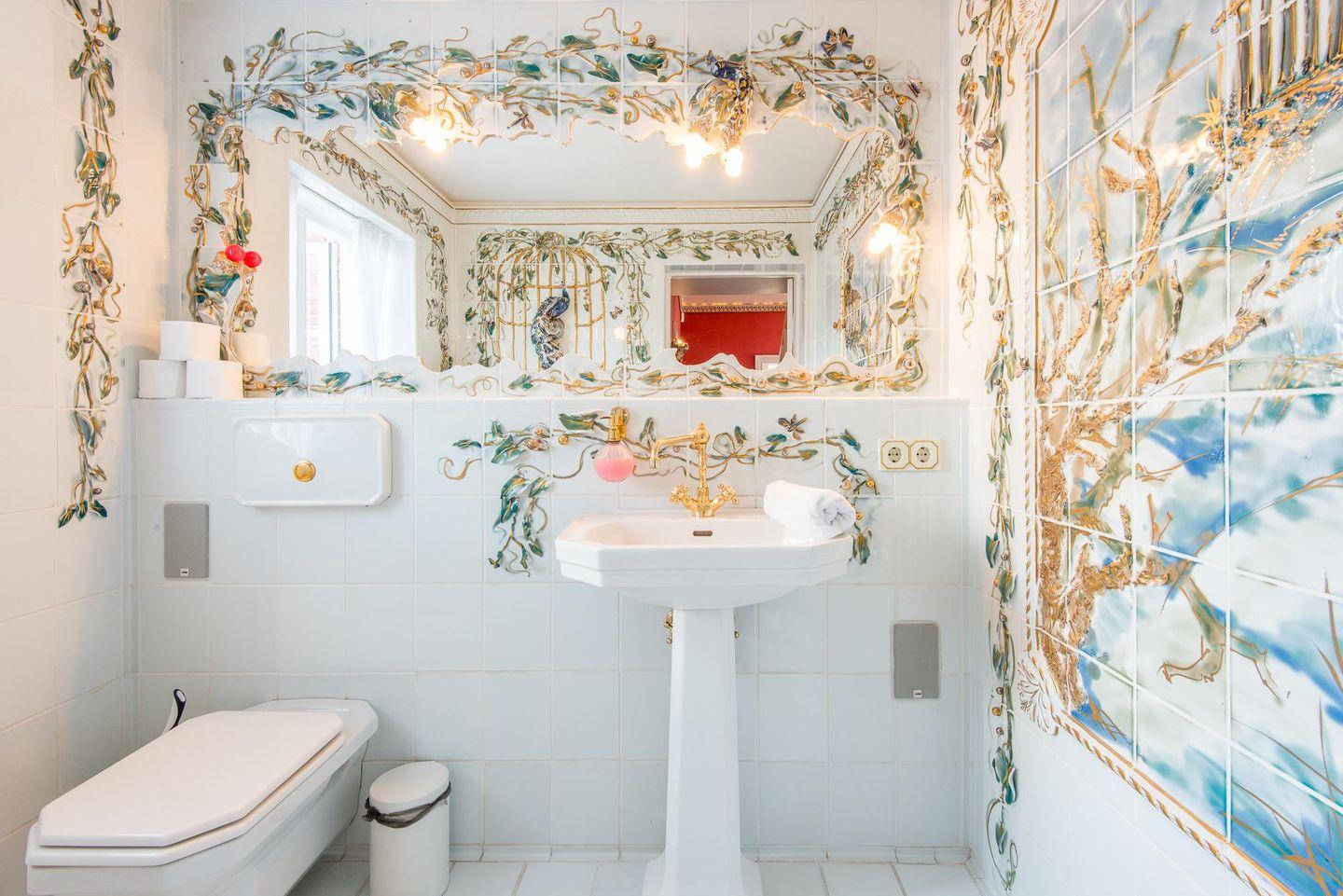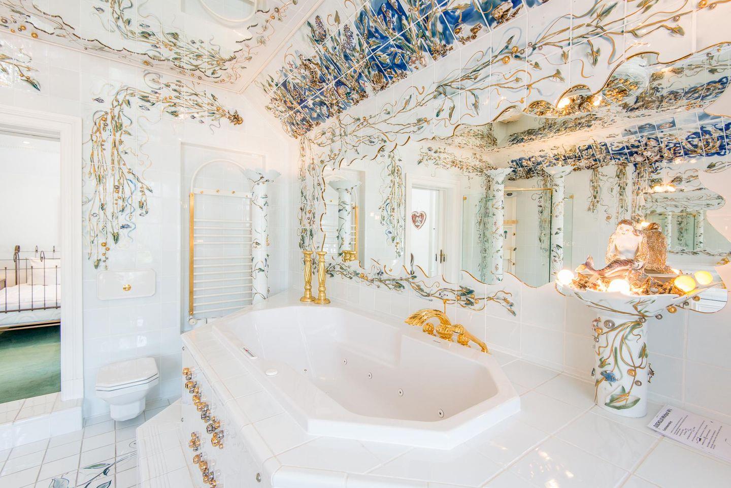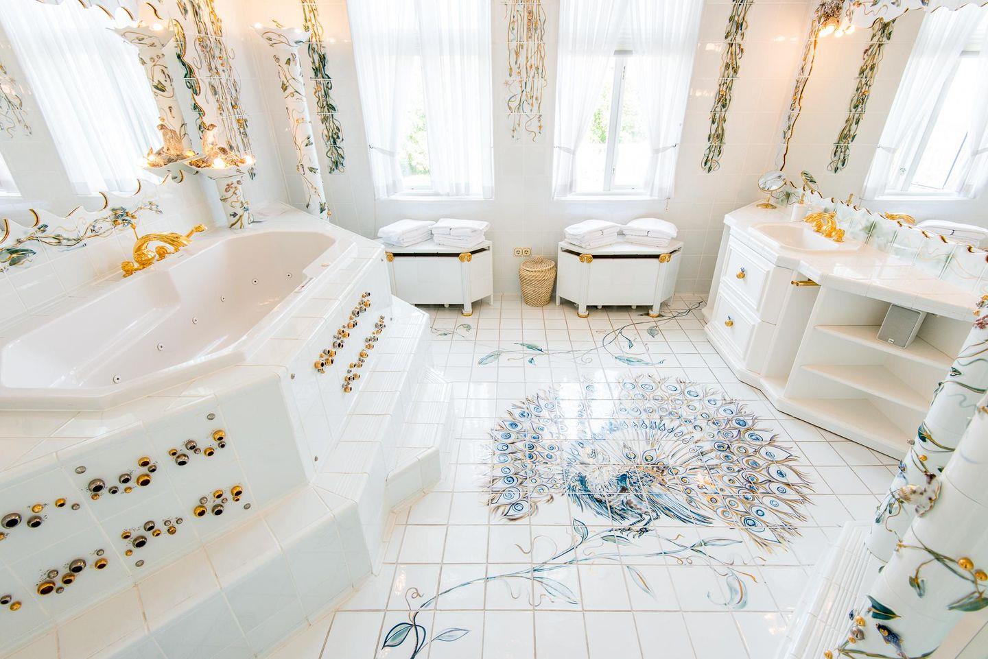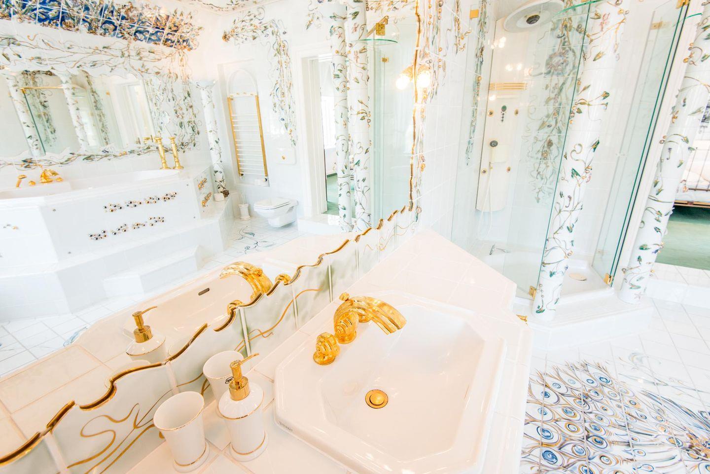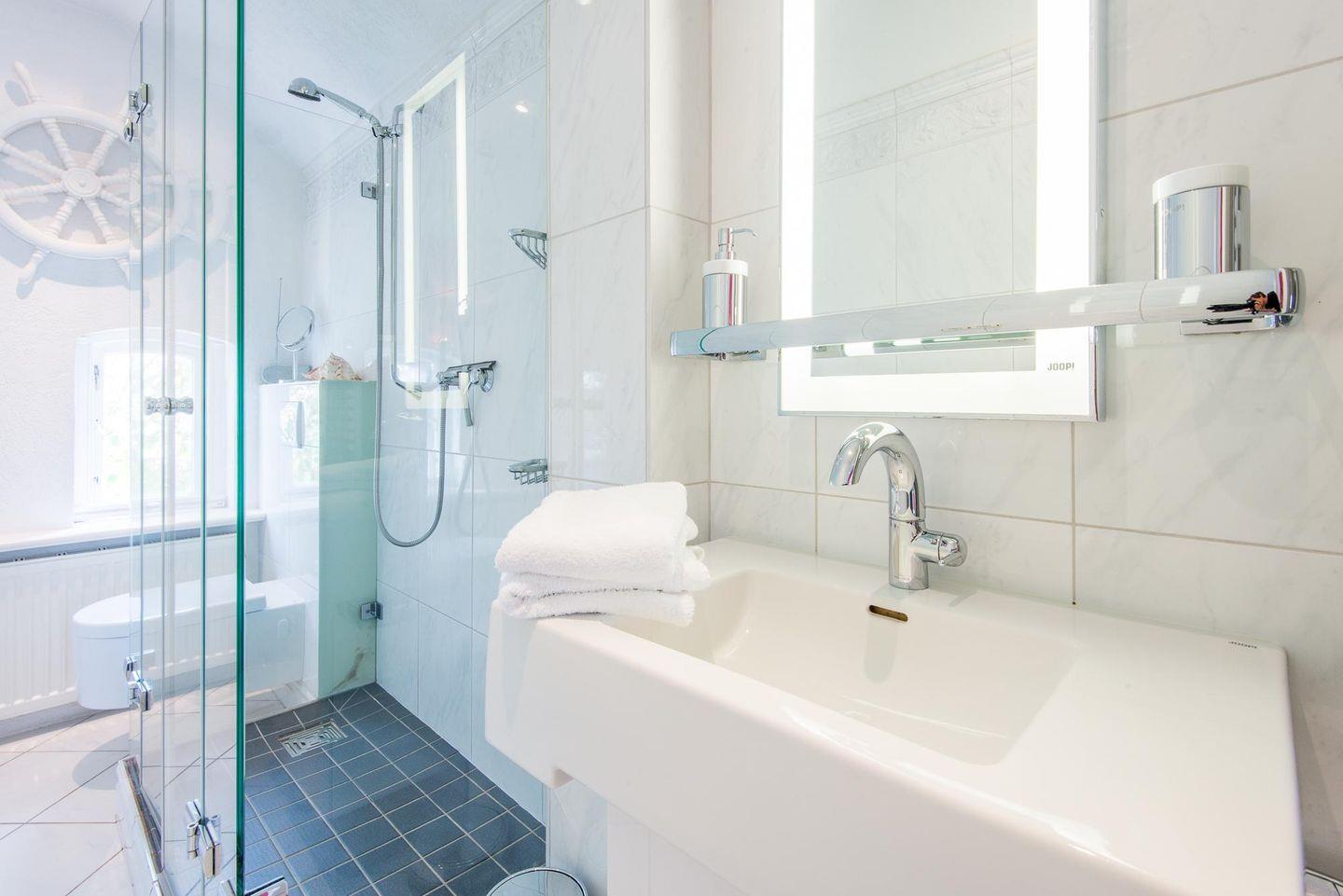 Die Ferienwohnung verfügt über zwei luxuriöse Badezimmer. Das Hauptbadezimmer ist ein echtes Highlight mit Whirlwanne, Duschkabine und exklusiven Materialien. Ein zweites Badezimmer im modernen Joop-Design bietet eine begehbare Dusche und Tageslicht. Zusätzlich gibt es ein separates Gäste-WC für noch mehr Komfort.
