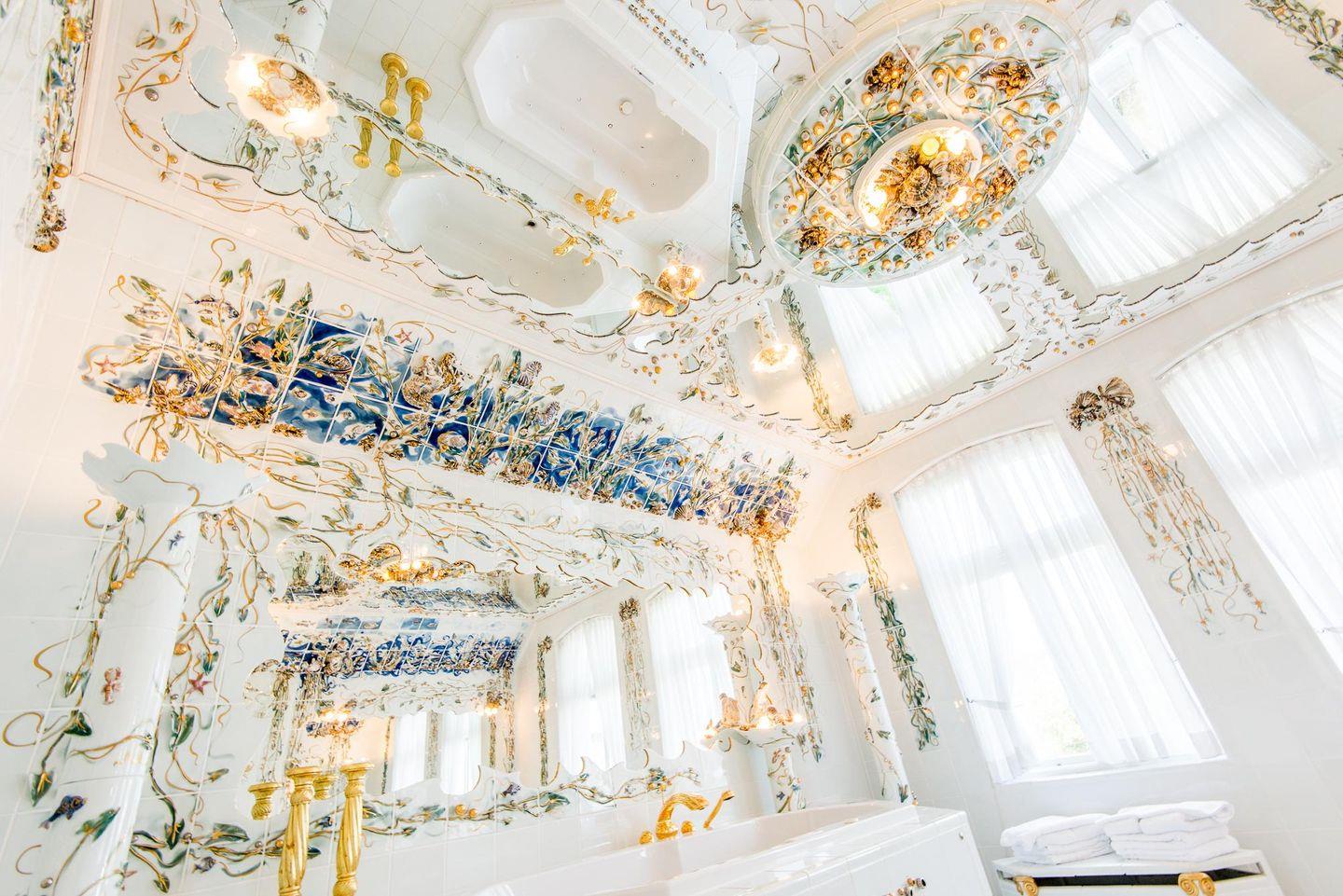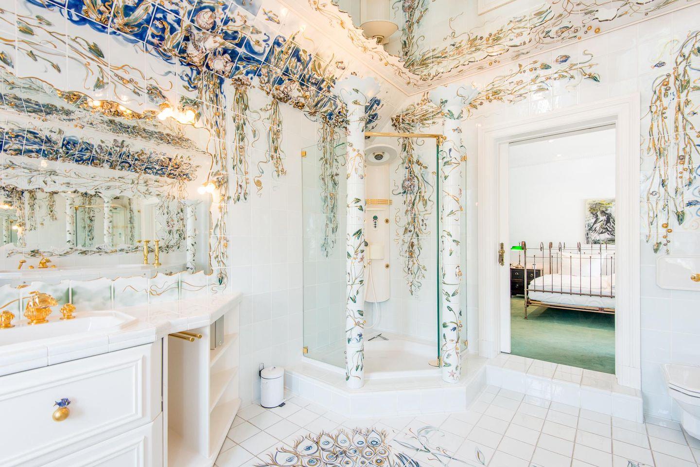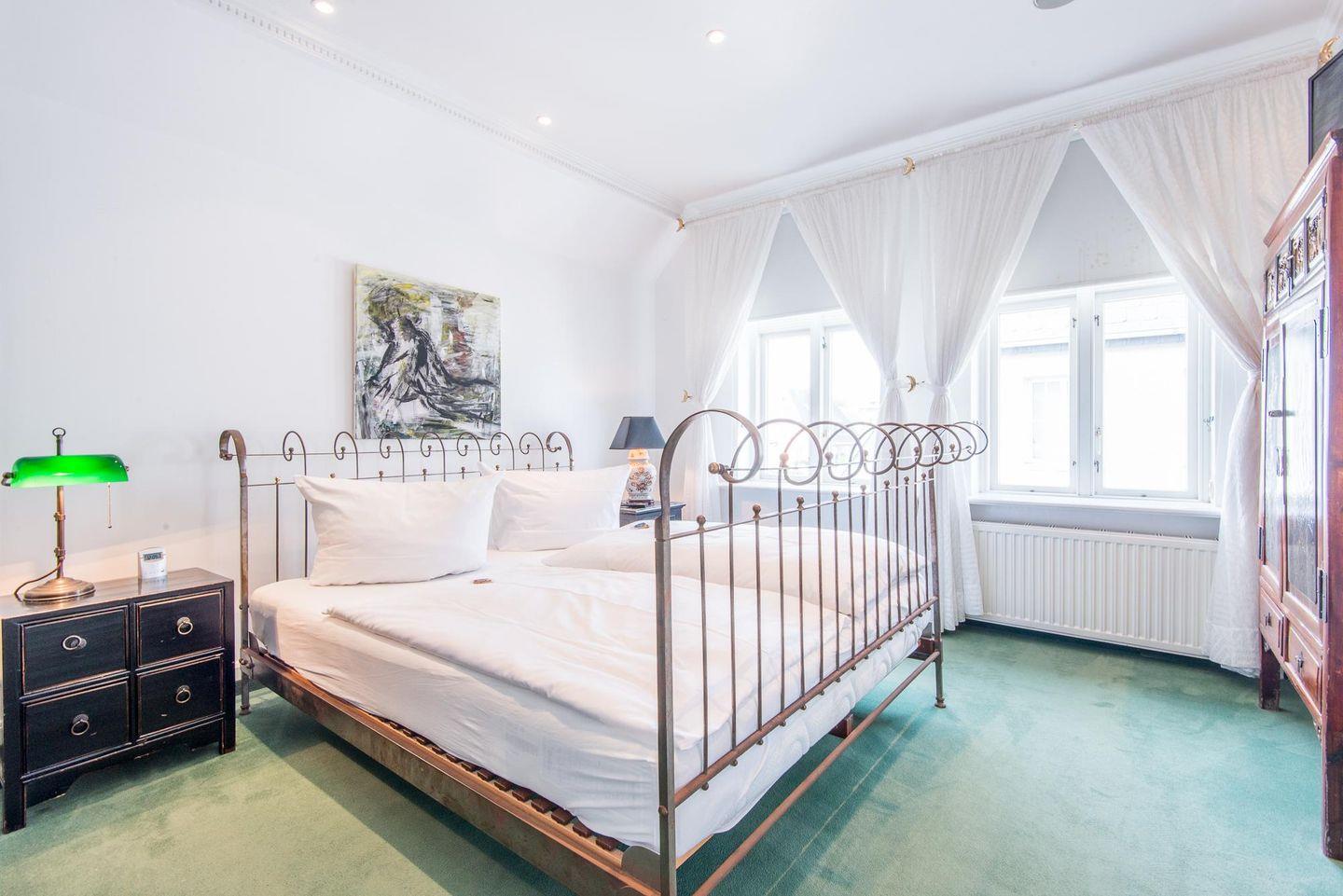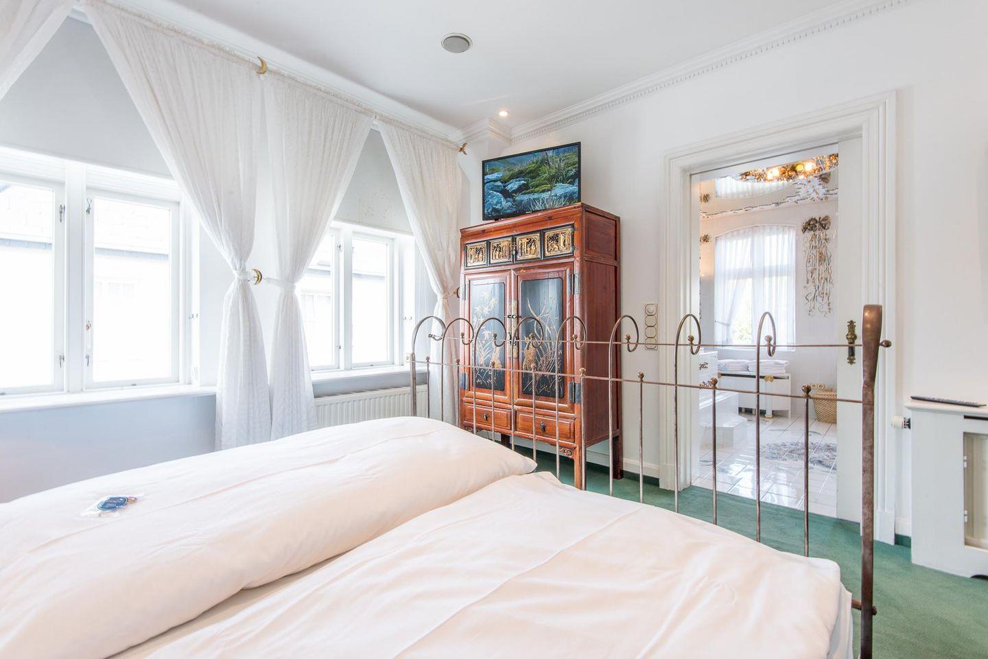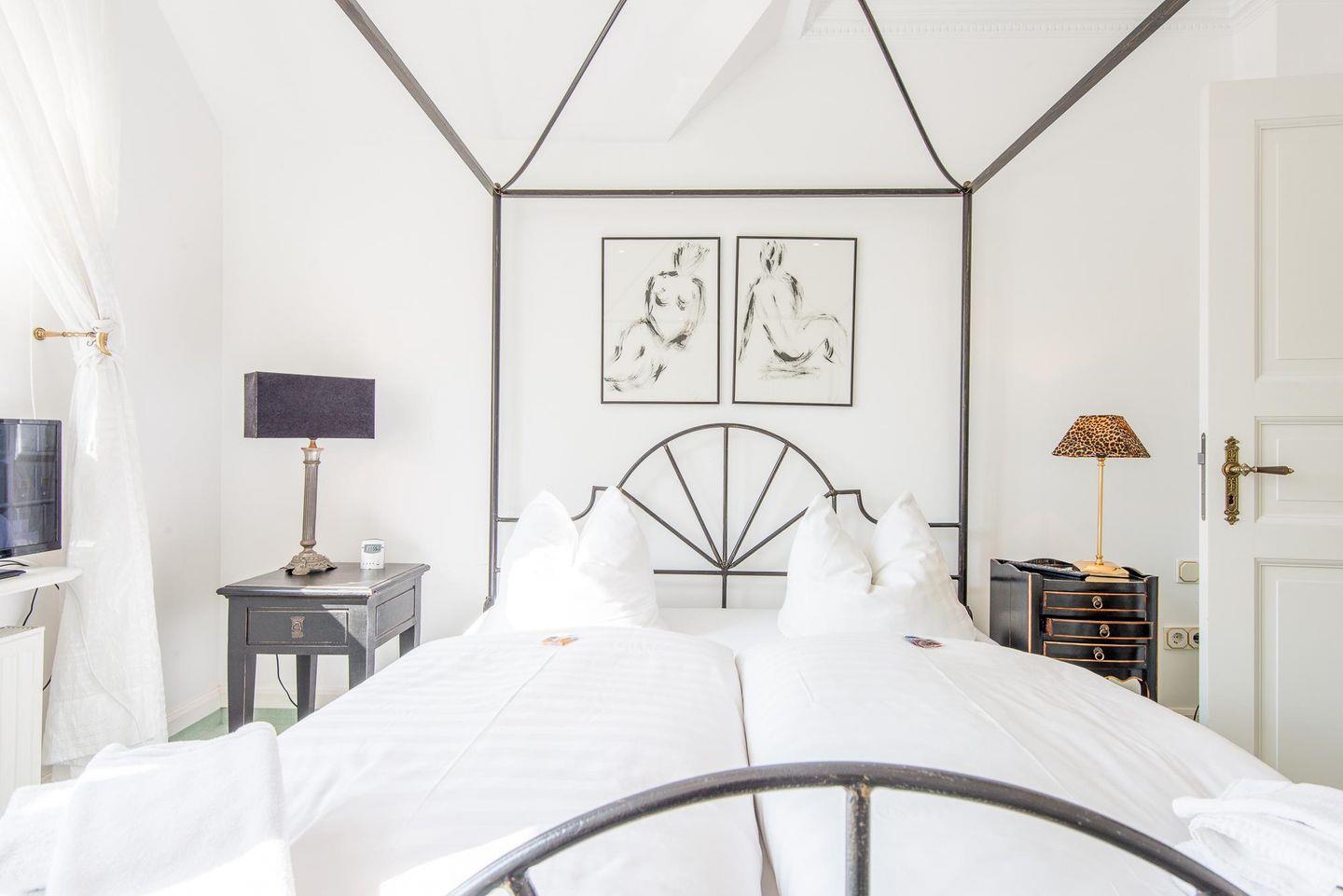 Die drei geräumigen Schlafzimmer bieten höchsten Schlafkomfort. Zwei der Schlafzimmer sind mit bequemen Doppelbetten (160x200 cm) und TV ausgestattet. Eines dieser Schlafzimmer verfügt über einen direkten Zugang zu einem luxuriösen Badezimmer mit Whirlwanne und Duschkabine – einzigartig gestaltet mit edlen Fliesen und Glasarbeiten von Barbara Flügel aus Meissen. Das dritte Schlafzimmer bietet zwei Einzelbetten (90x200 cm), ideal für Kinder oder weitere Gäste.
