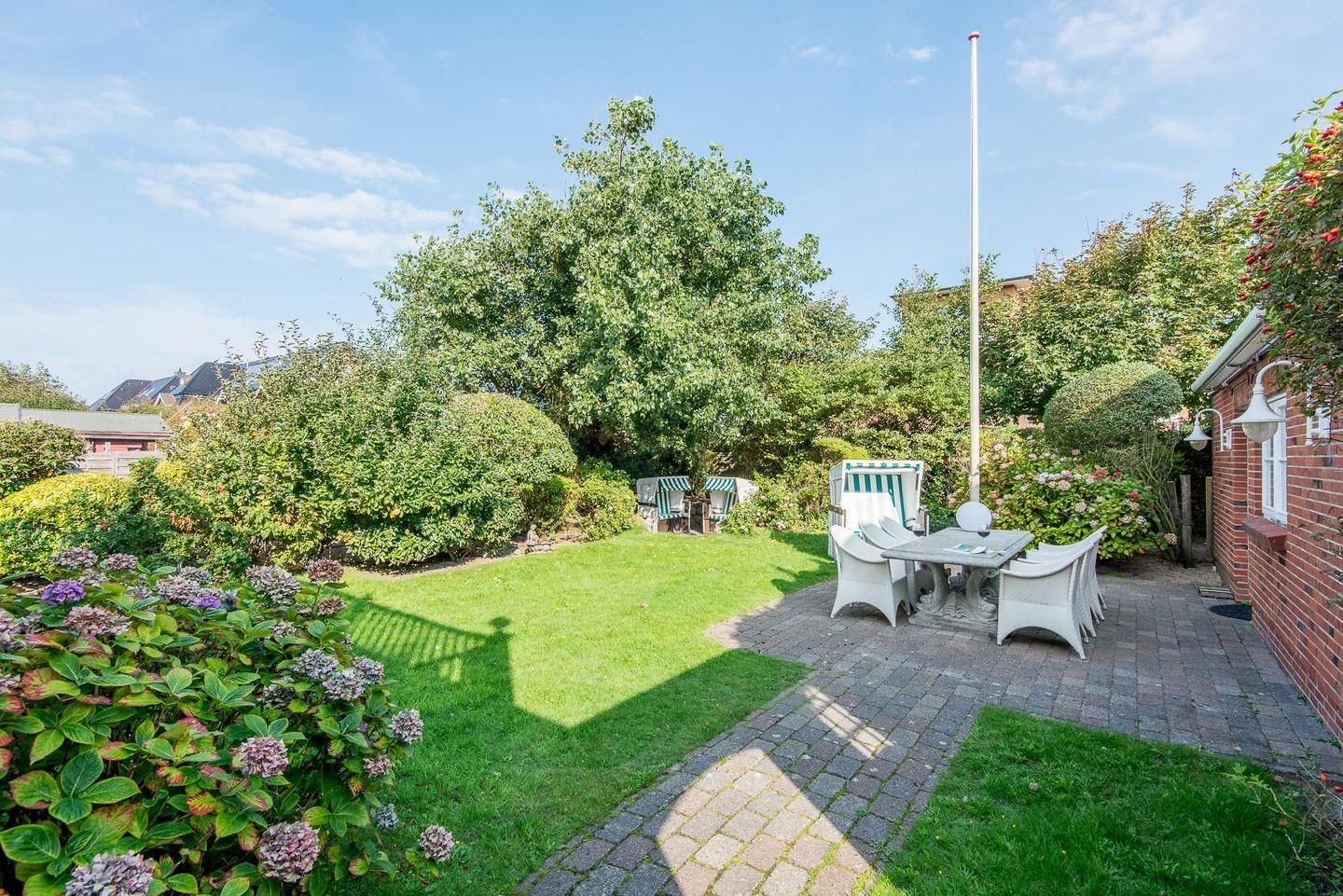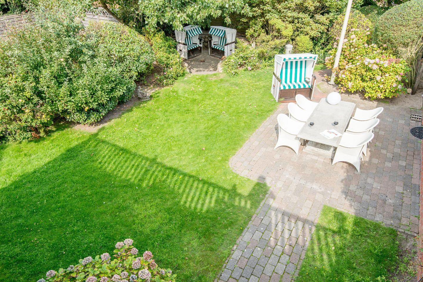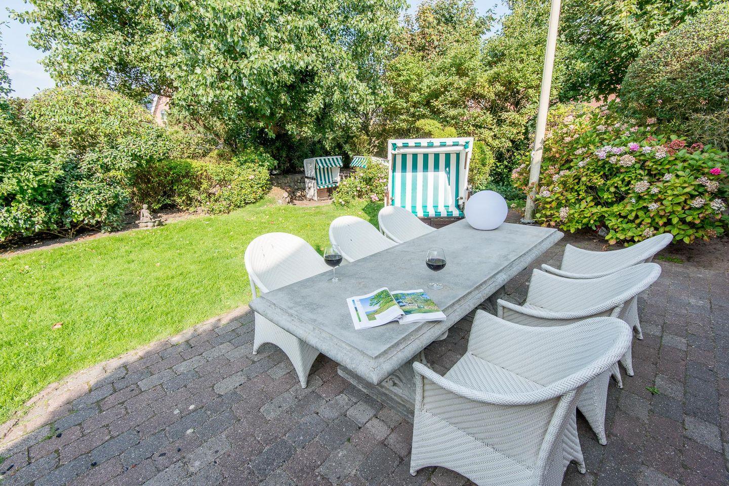 Ein besonderes Highlight ist die großzügige Dachterrasse mit zwei Strandkörben – der perfekte Ort, um die frische Nordseeluft zu genießen und bei einem guten Buch zu entspannen. Im Garten finden Sie ebenfalls eine Terrasse mit Strandkörben, ideal für gemütliche Stunden im Freien. Hier können Sie die Sonne von morgens bis abends genießen oder bei einer Tasse Tee den Tag Revue passieren lassen.
