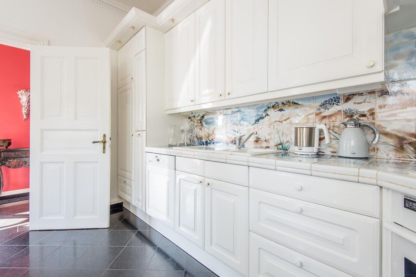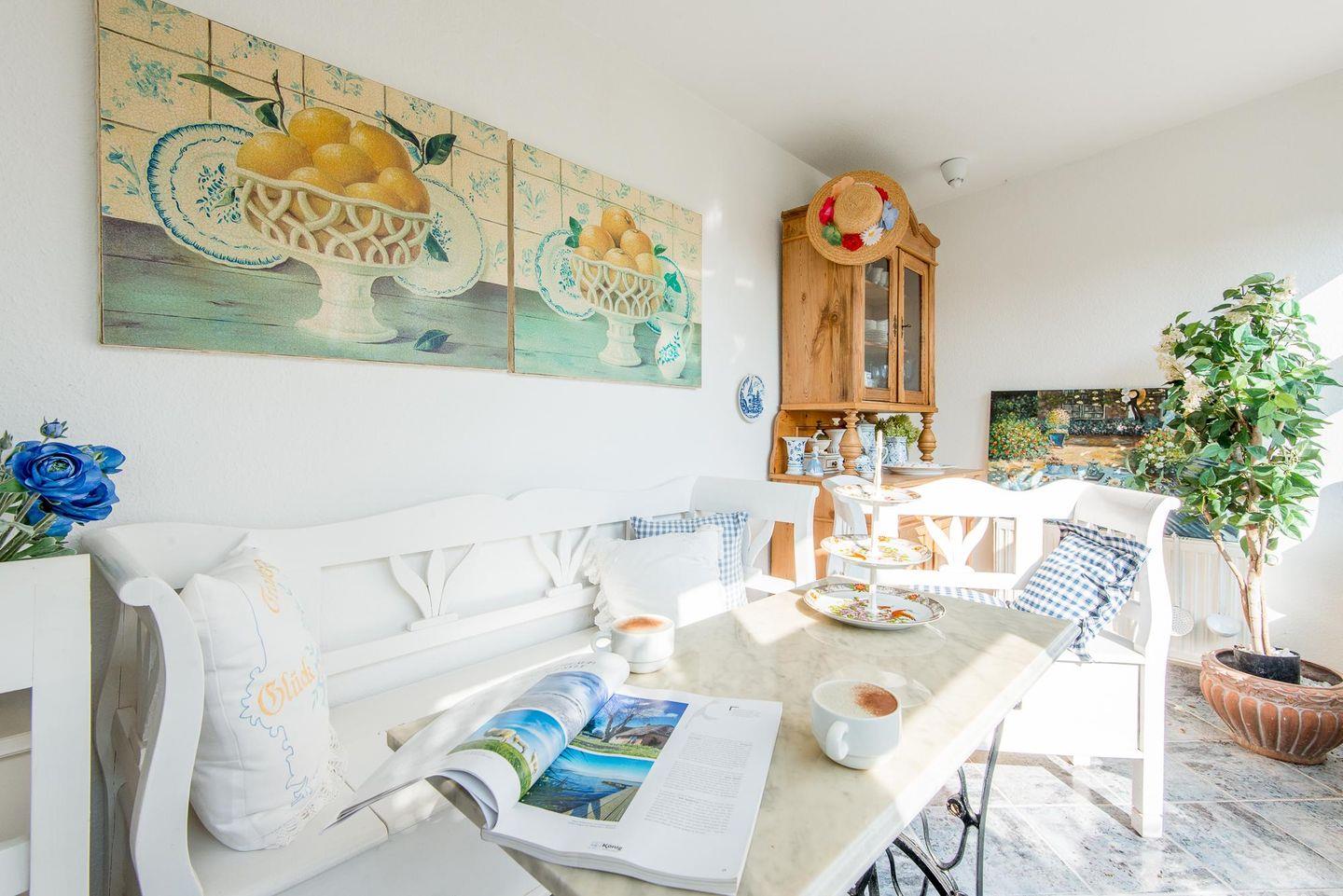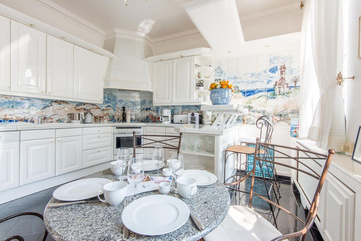 Das Esszimmer bietet ausreichend Platz für gemeinsame Mahlzeiten mit bis zu 8 Personen an einem großzügigen Esstisch. In der angrenzenden, voll ausgestatteten Landhausküche finden Sie alles, was Sie für kulinarische Kreationen benötigen: vom Cerankochfeld über einen Geschirrspüler bis hin zu einer Filterkaffeemaschine und einer Nespresso-Maschine. Diese Küche vereint modernen Komfort mit charmantem Landhausstil und lädt zu geselligen Kochabenden ein.