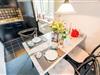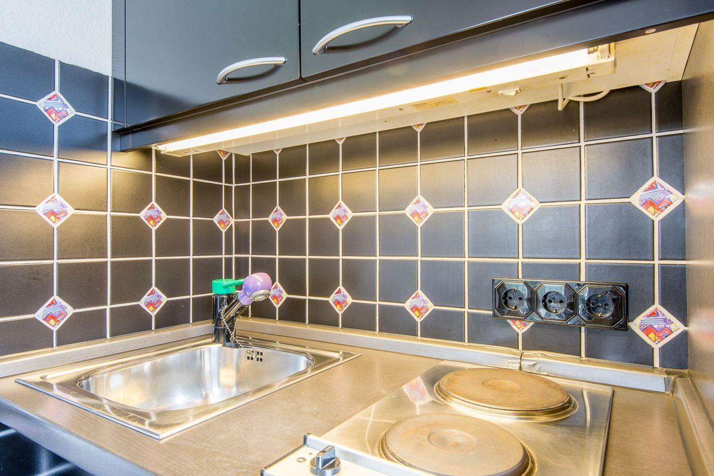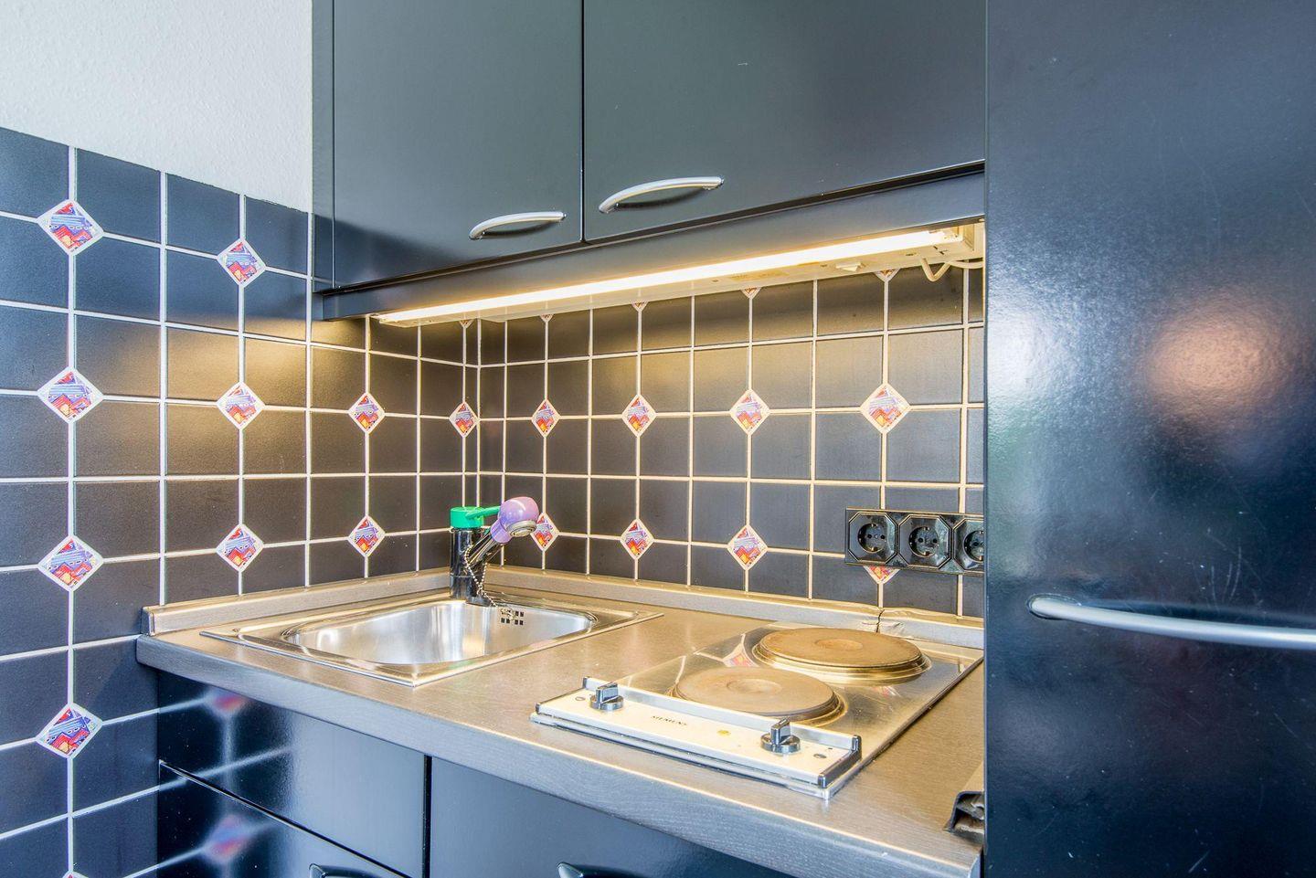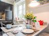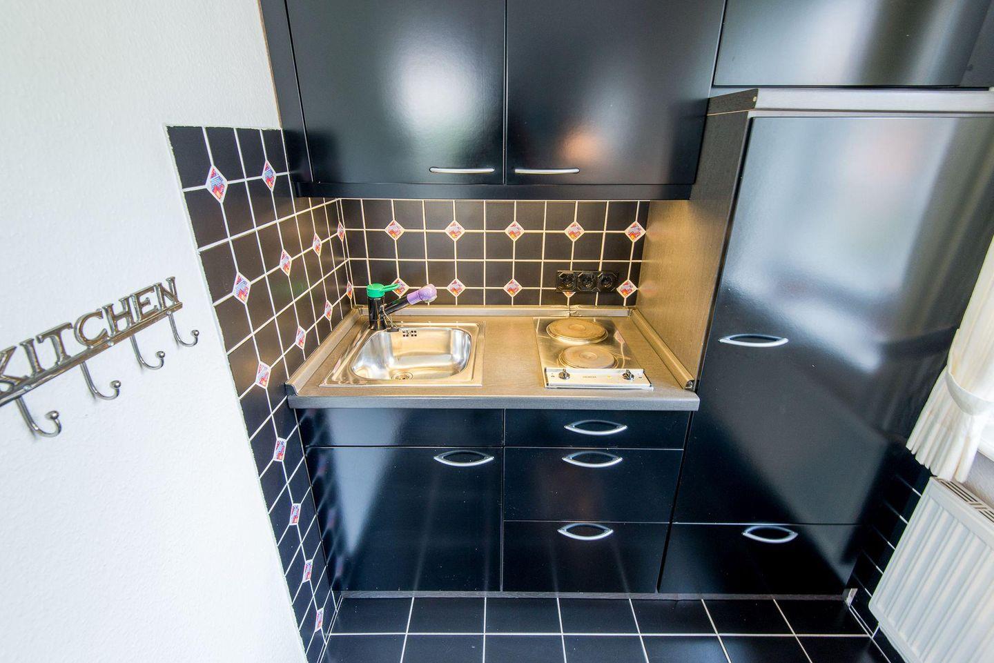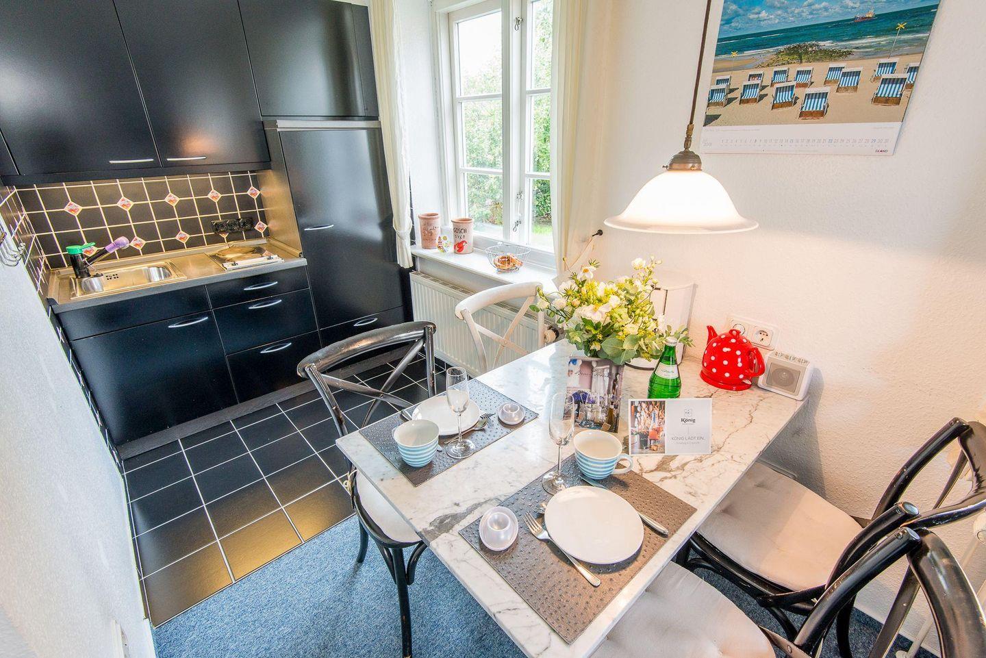 Die halboffene Küche ist funktional und stilvoll eingerichtet. Sie verfügt über einen 2-flammigen Herd und alle notwendigen Utensilien, um ein leckeres Frühstück oder kleine Mahlzeiten zuzubereiten. Der Esstisch bietet Platz für bis zu 4 Personen, perfekt für ein gemütliches Essen oder eine Tasse Tee am Nachmittag.