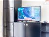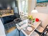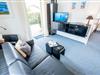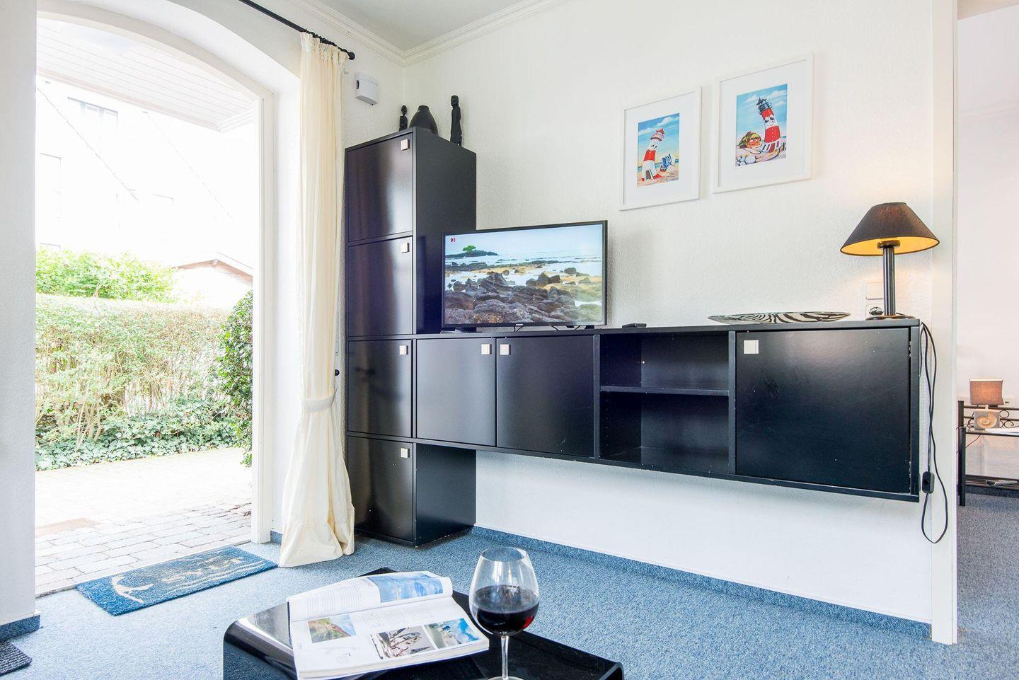 Der gemütliche Wohnbereich ist mit einem bequemen Sofa und einem TV ausgestattet, der ideale Ort, um sich nach einem Tag am Strand oder einer Erkundungstour durch die Insel zu entspannen. Große Fenster lassen viel Tageslicht in den Raum und sorgen für eine freundliche Atmosphäre.