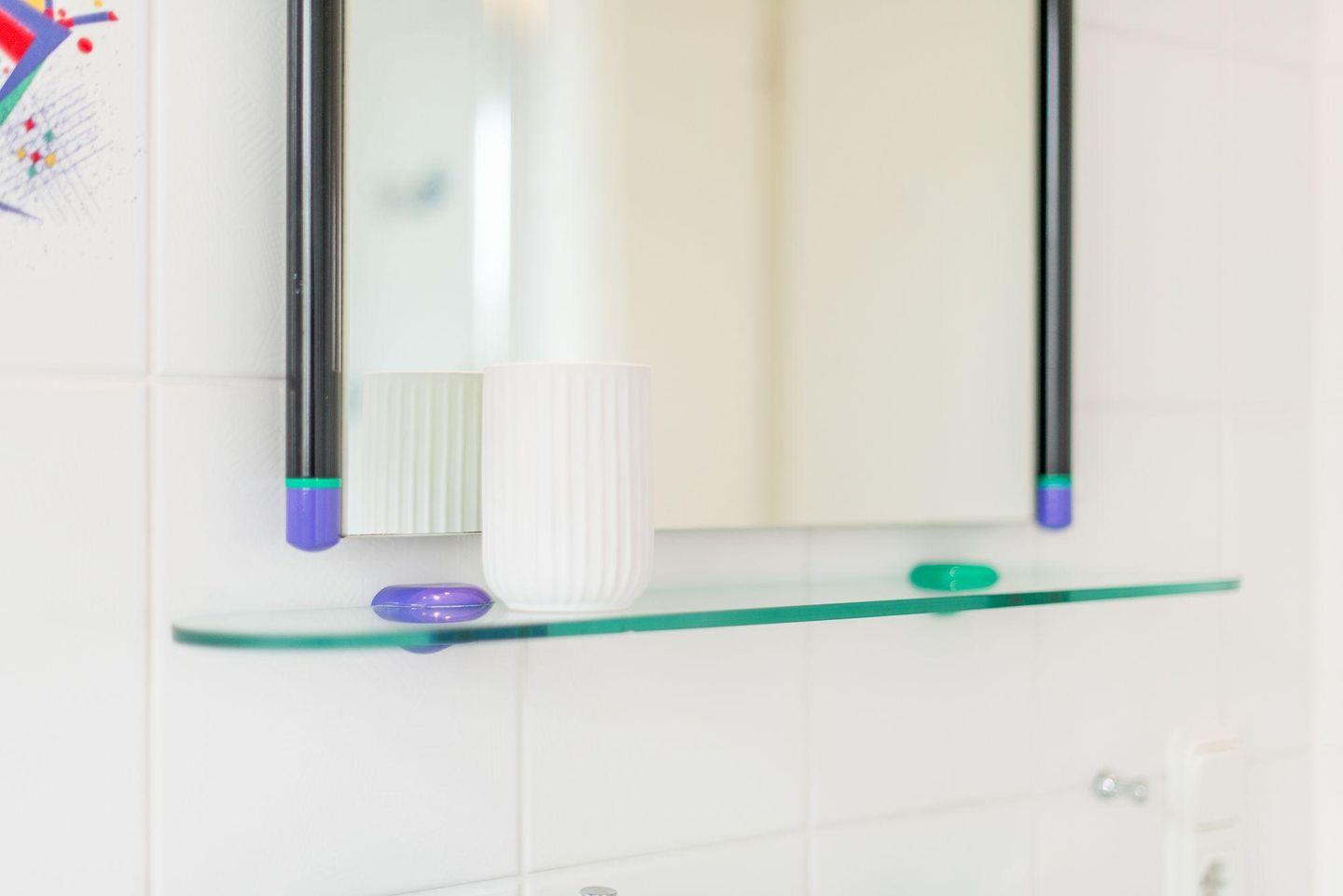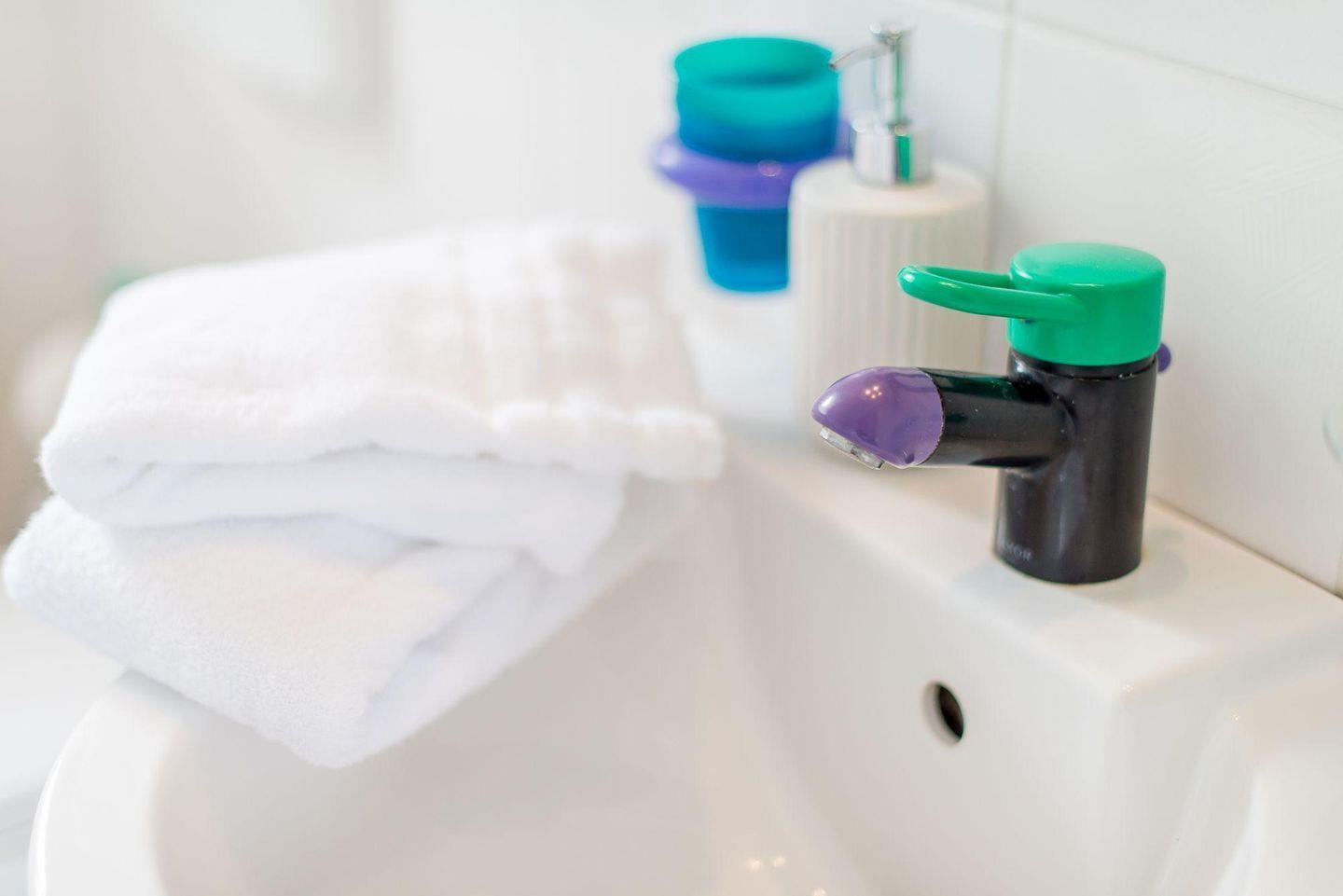 Das Badezimmer ist hell und freundlich gestaltet. Es verfügt über eine Badewanne, ein WC und einen Föhn. Dank des Tageslichts wird das Badezimmer zu einem einladenden Ort, um den Tag frisch zu beginnen.