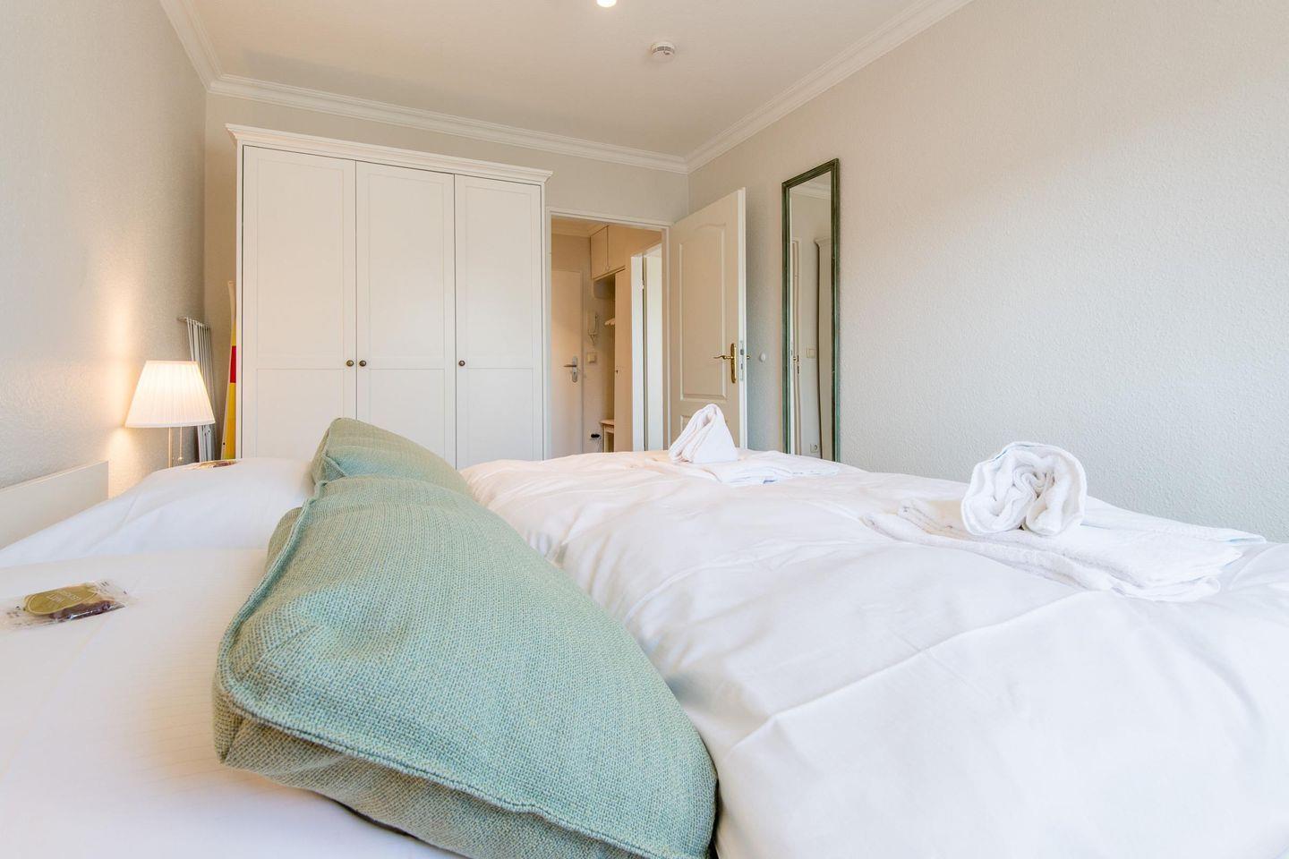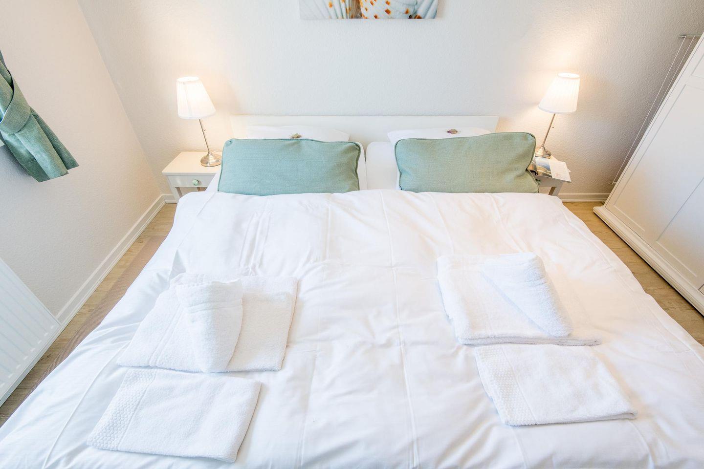 Das Schlafzimmer bietet ein komfortables Doppelbett (2x 90x200 cm) und einen geräumigen Kleiderschrank, der genügend Stauraum für Ihre Garderobe während des Aufenthalts bietet. Hier können Sie sich nach einem erlebnisreichen Tag entspannen und erholsamen Schlaf finden.