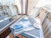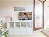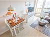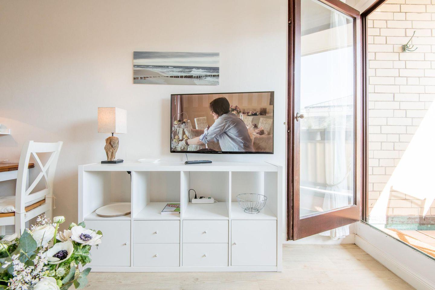 Das helle Wohnzimmer ist mit einem hochwertigen Schlafsofa (140x200 cm) ausgestattet und bietet somit eine zusätzliche Schlafmöglichkeit für eine dritte Person. Ein Esstisch lädt zu gemeinsamen Mahlzeiten oder gemütlichen Spieleabenden ein. Der Zugang zum Balkon sorgt für viel Licht im Raum und bietet einen schönen Platz, um die Morgensonne zu genießen.