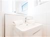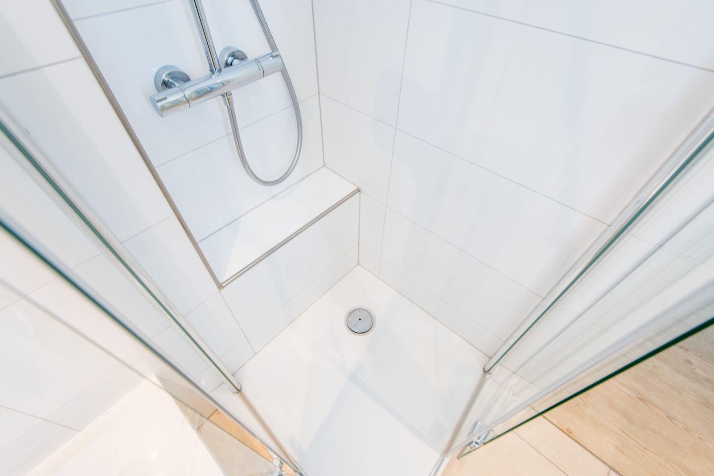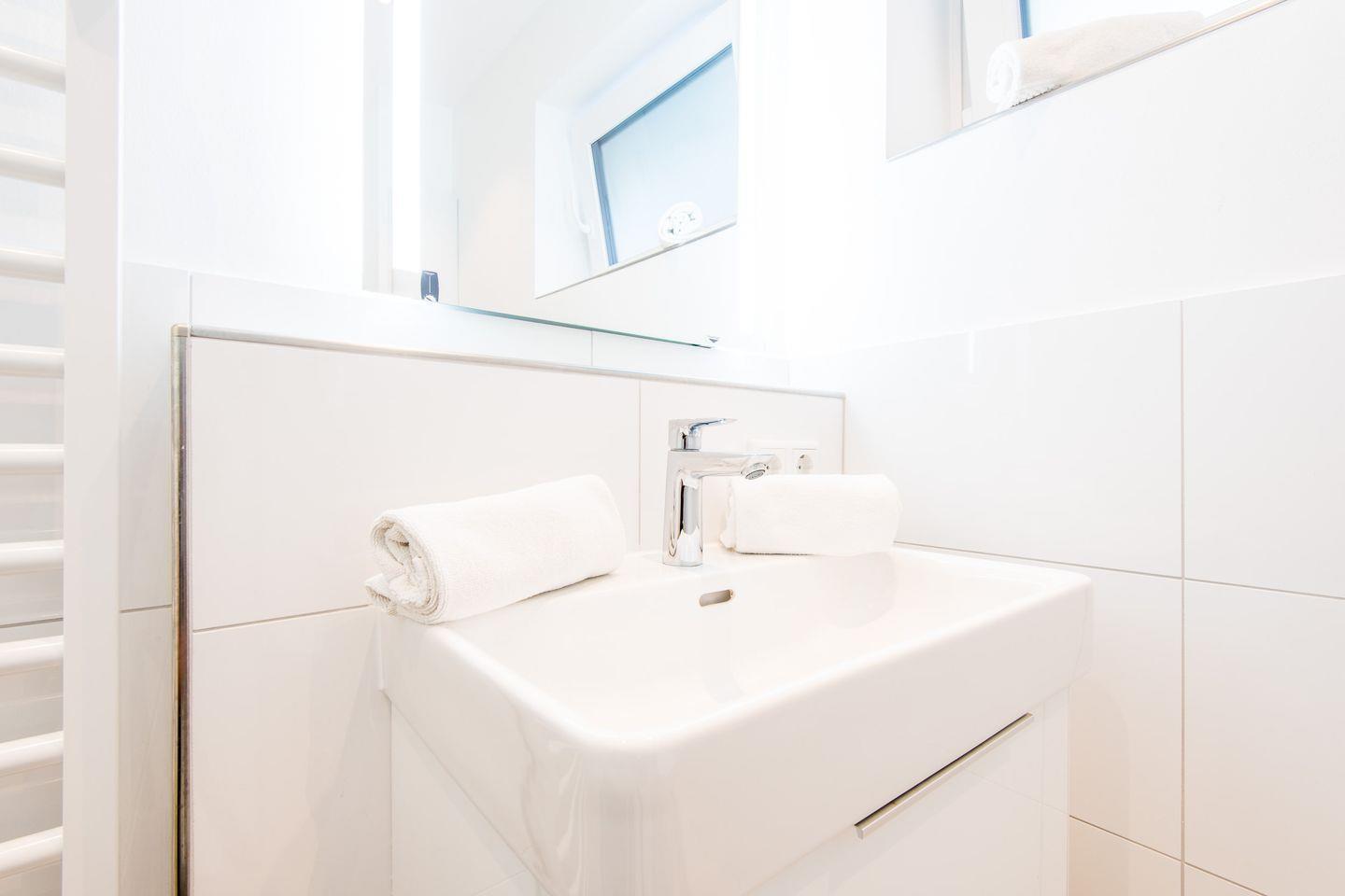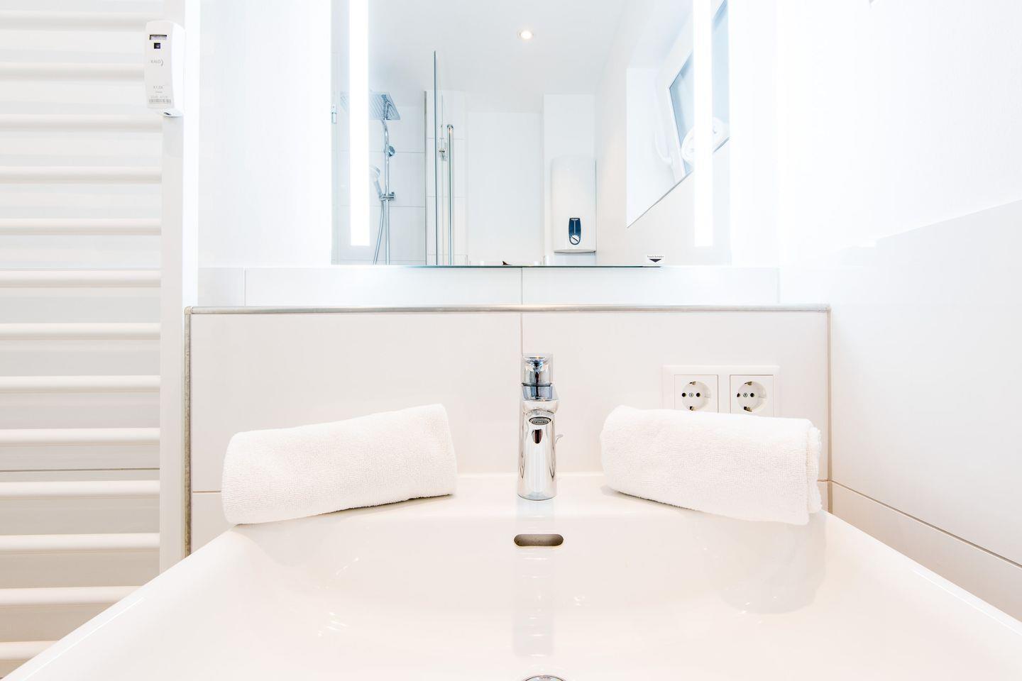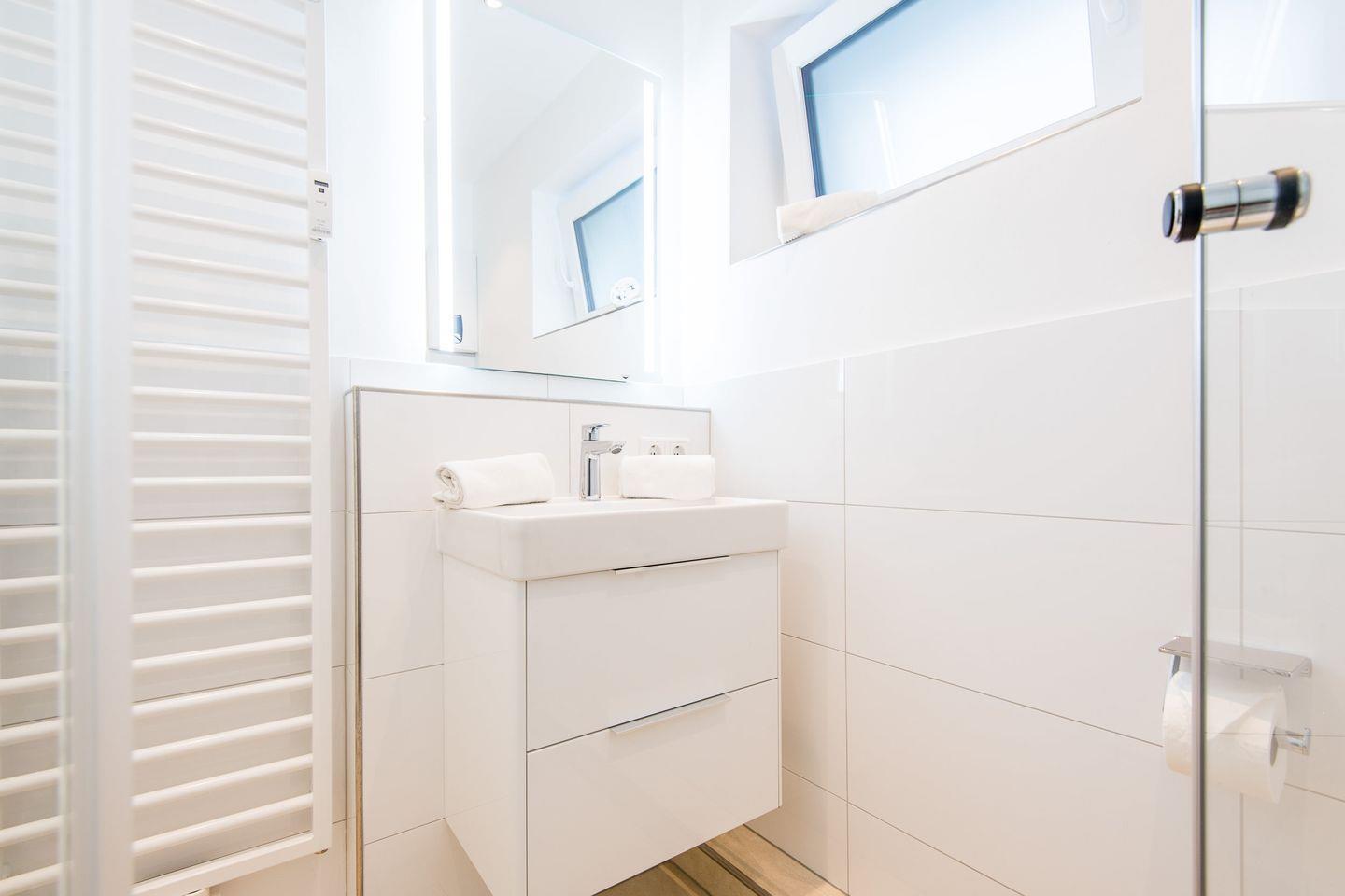 Das helle Badezimmer ist mit einer Dusche, einem WC und einem Föhn ausgestattet. Das Tageslicht sorgt für eine angenehme Atmosphäre, und die moderne Ausstattung bietet den nötigen Komfort für Ihren Aufenthalt.