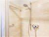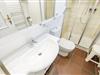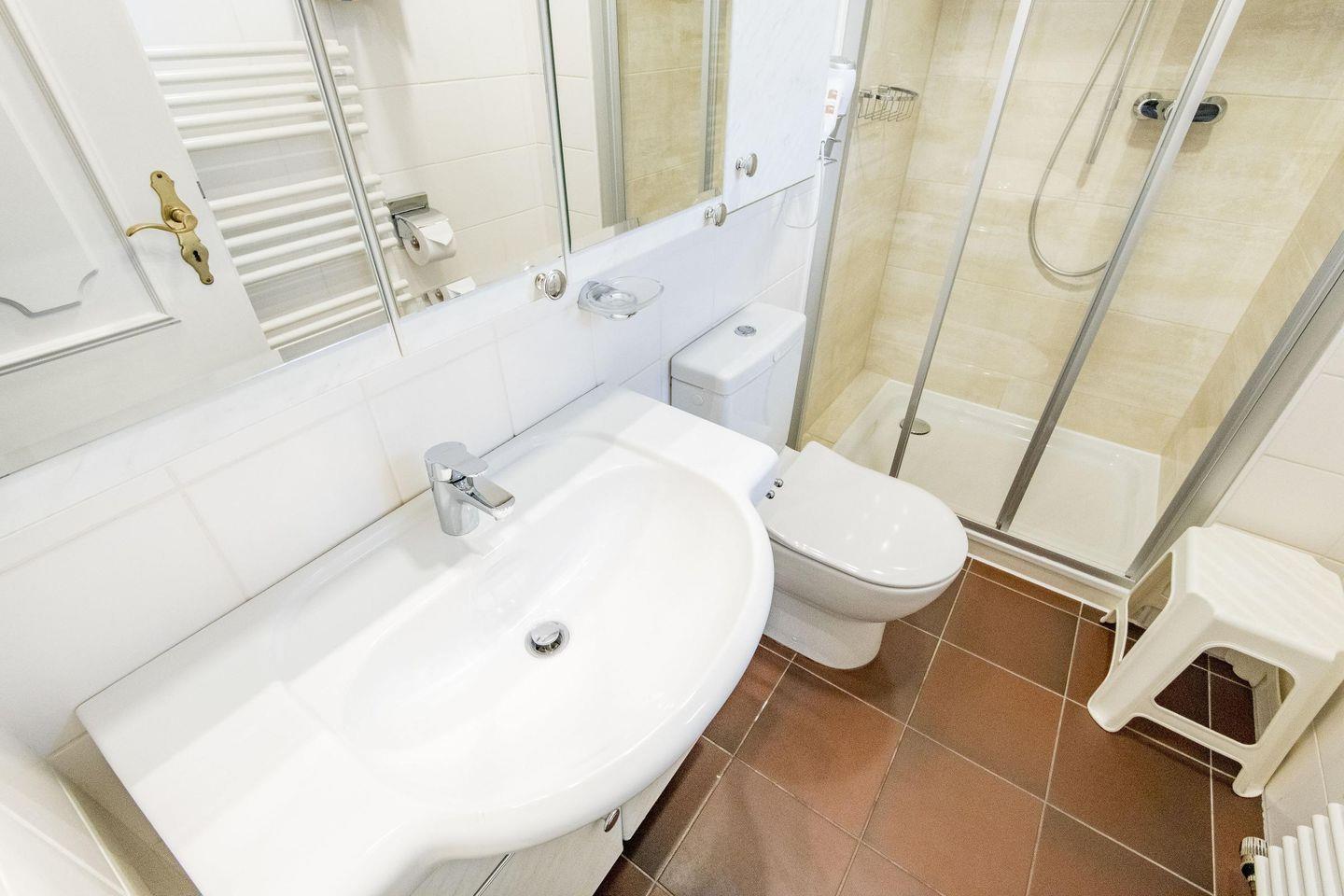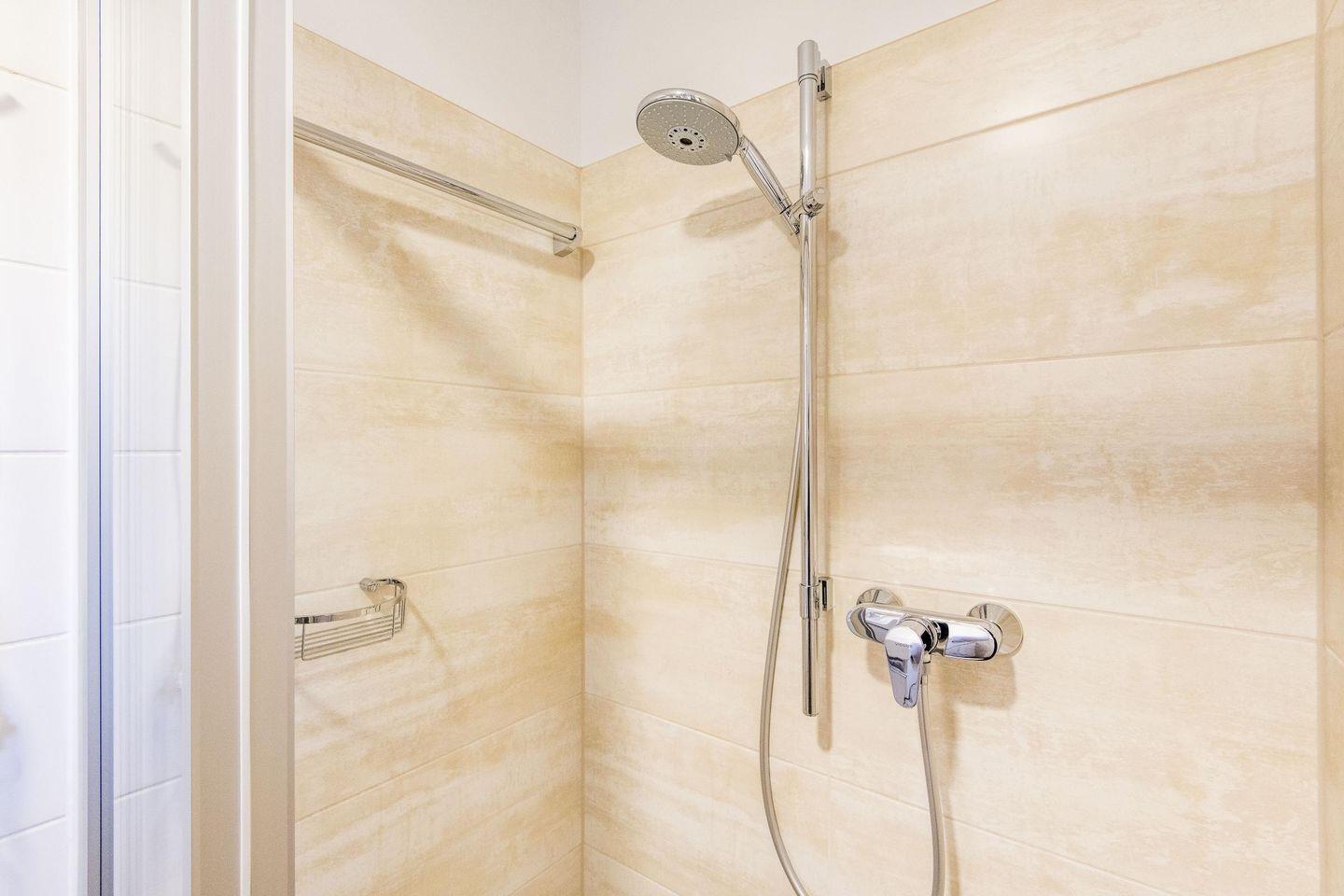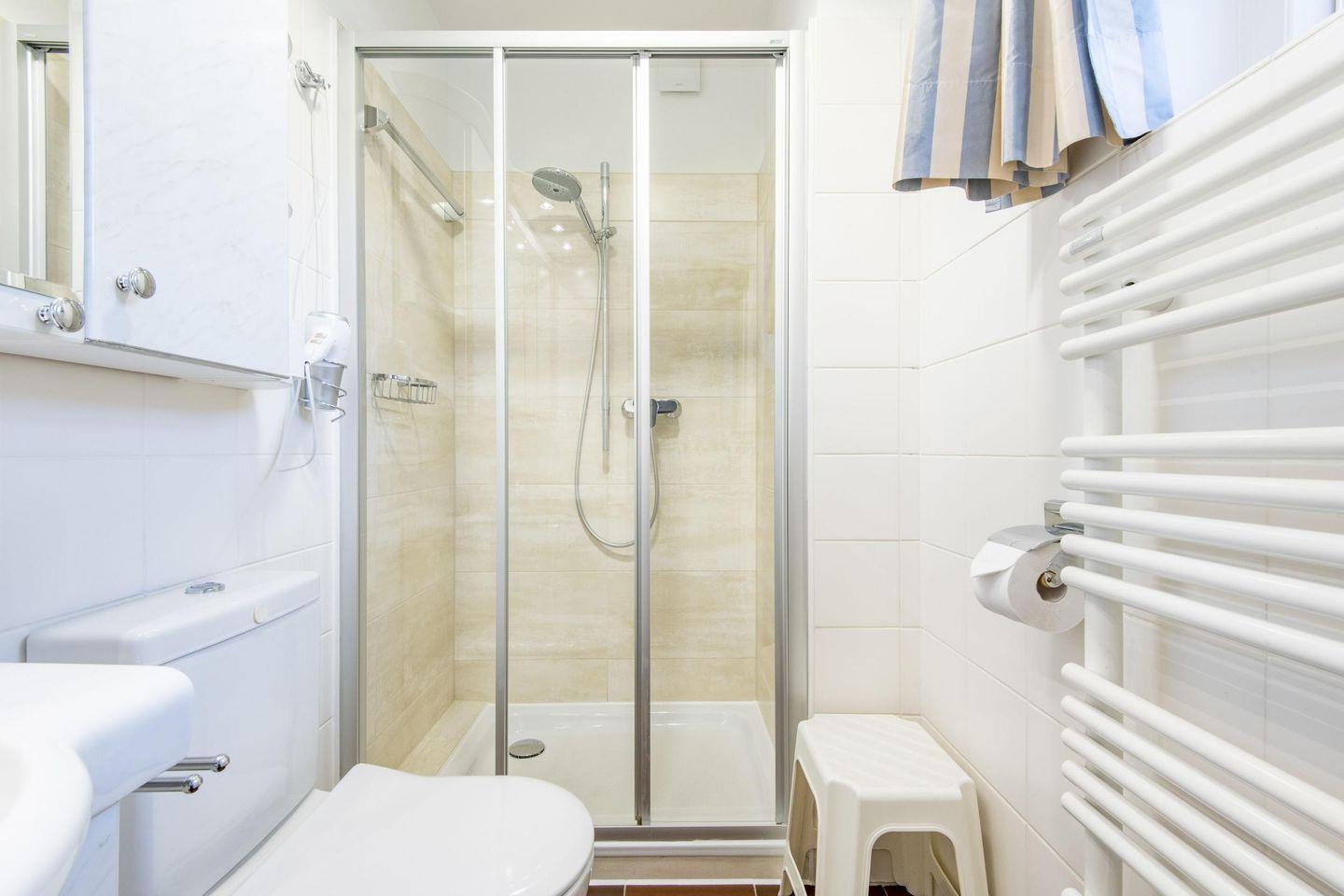 Das Badezimmer ist modern gestaltet und verfügt über eine Dusche, ein WC, einen Handtuchwärmer, einen Föhn und Tageslicht – ideal für einen erfrischenden Start in den Tag.