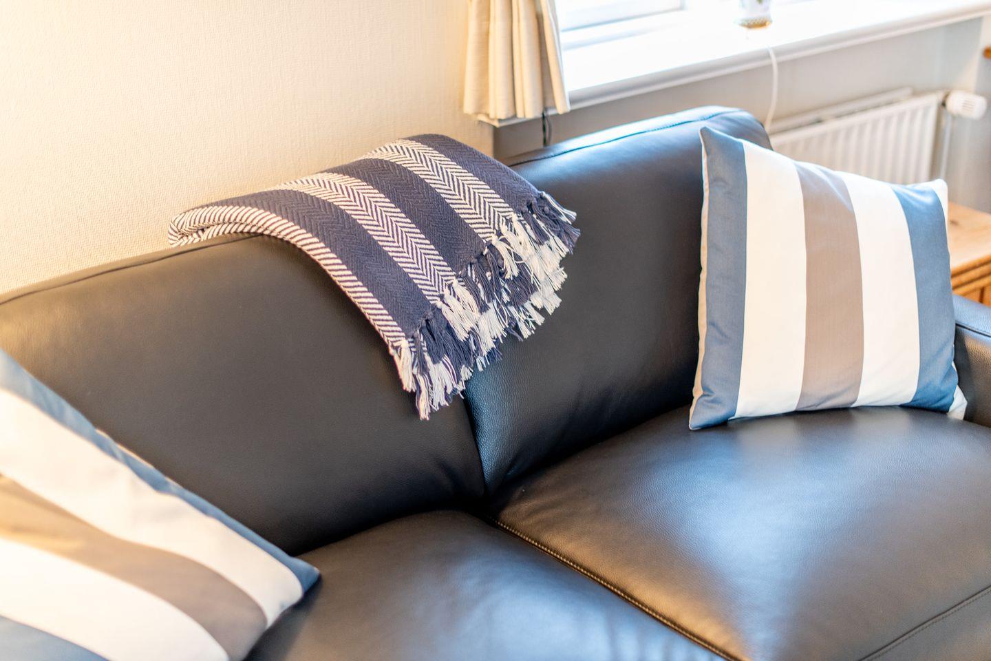 Der kombinierte Wohn-/Schlafbereich ist großzügig und gemütlich gestaltet. Ein Doppelbett (160x200 cm), ein Sofa, ein Sessel, ein weiterer Schlaf-Sessel im Flur sind vorhanden. Für Ihre Unterhaltung steht ein TV bereit. Ein Esstisch für 4 Personen bietet Platz für gemeinsame Mahlzeiten. Vom Wohnbereich aus haben Sie direkten Zugang zur sonnigen Südterrasse, die mit einem Strandkorb ausgestattet ist – perfekt, um die frische Luft und die Ruhe zu genießen.