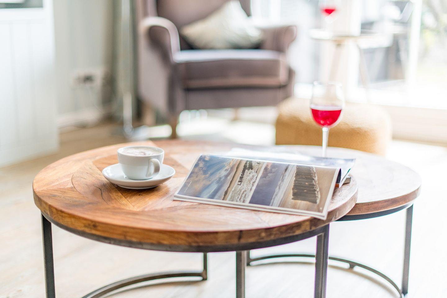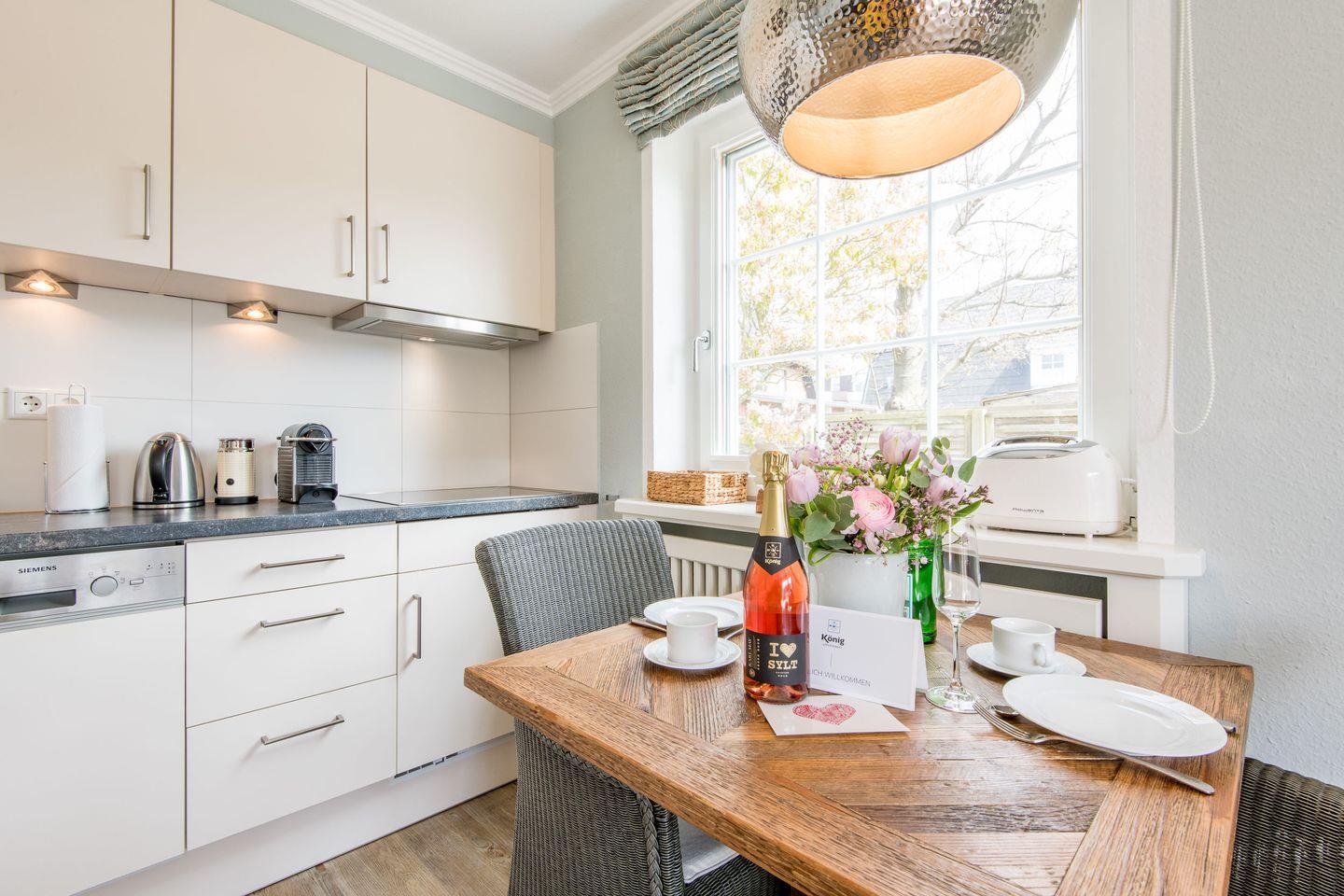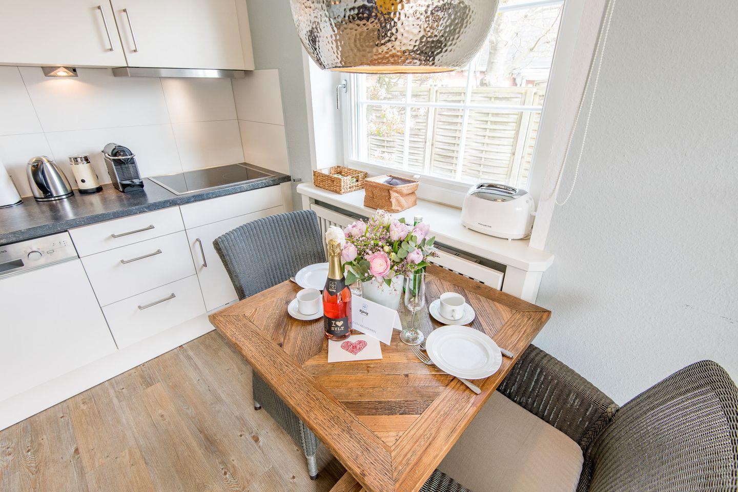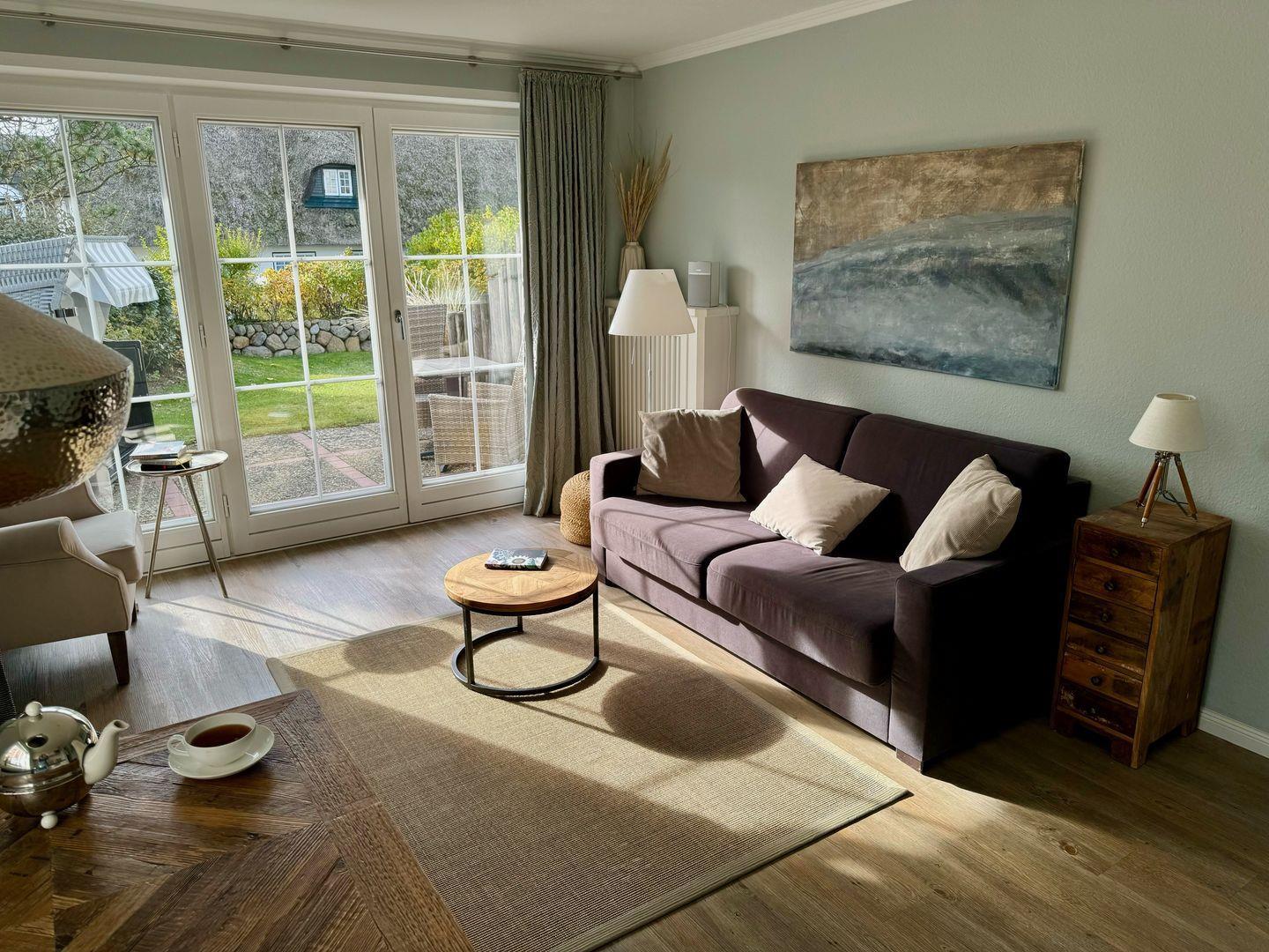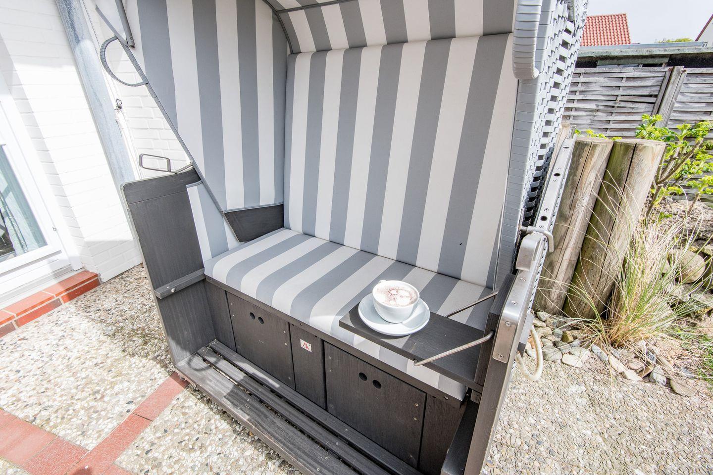 Das stilvolle Wohnzimmer ist mit einem gemütlichen Sofa und einem bequemen Sessel ausgestattet. Ein großer TV mit Media Receiver und Netflix Zugang sowie eine Bose Soundanlage sorgen für entspannte Stunden. Der Esstisch für 2 Personen und die hochwertigen Tischlereinbauten runden das stimmige Wohnkonzept ab. Vom Wohnzimmer aus haben Sie direkten Zugang zur möblierten Gartenterrasse nach Süden, die mit einem Strandkorb ausgestattet ist und Erholung an der frischen Nordseeluft verspricht.
