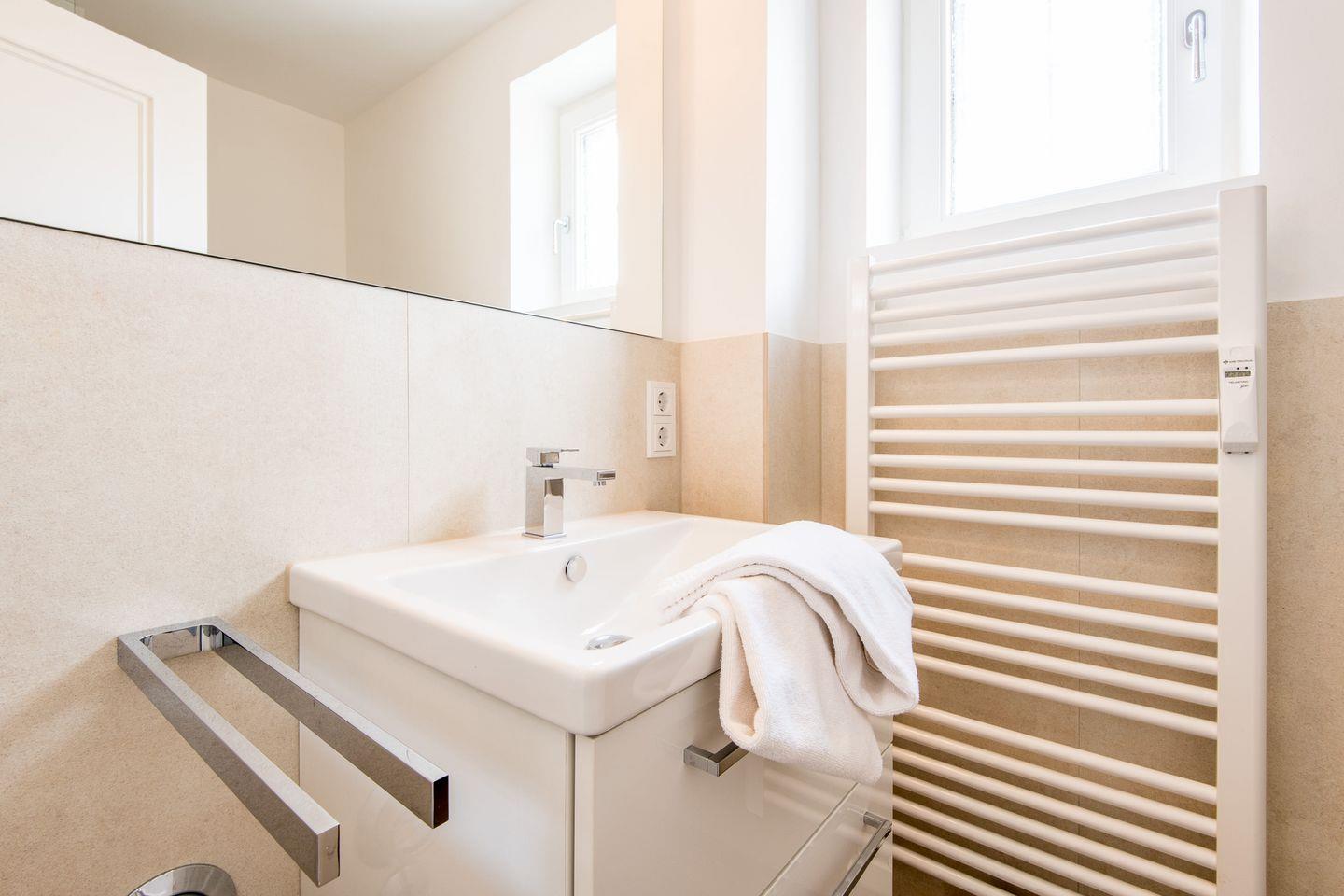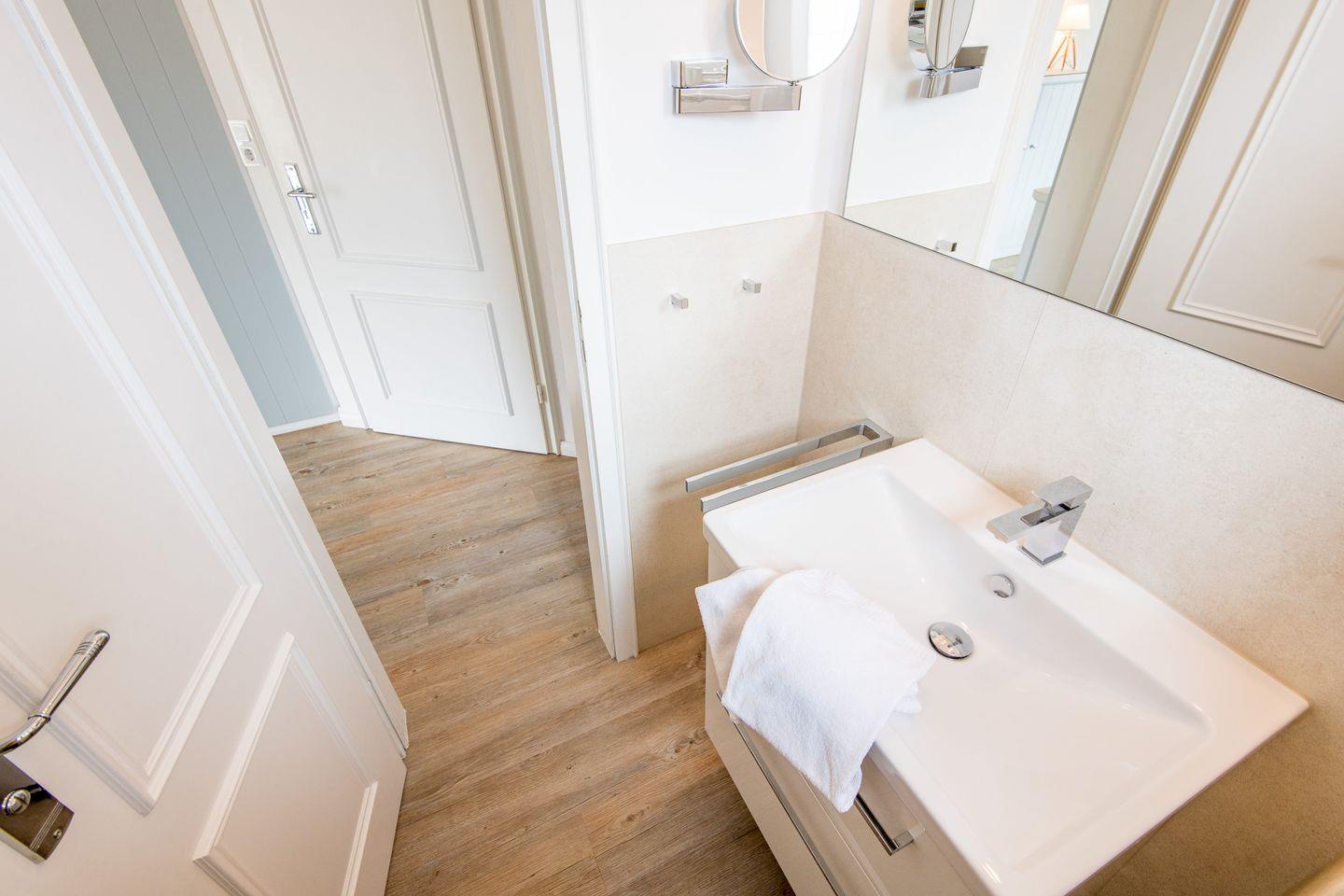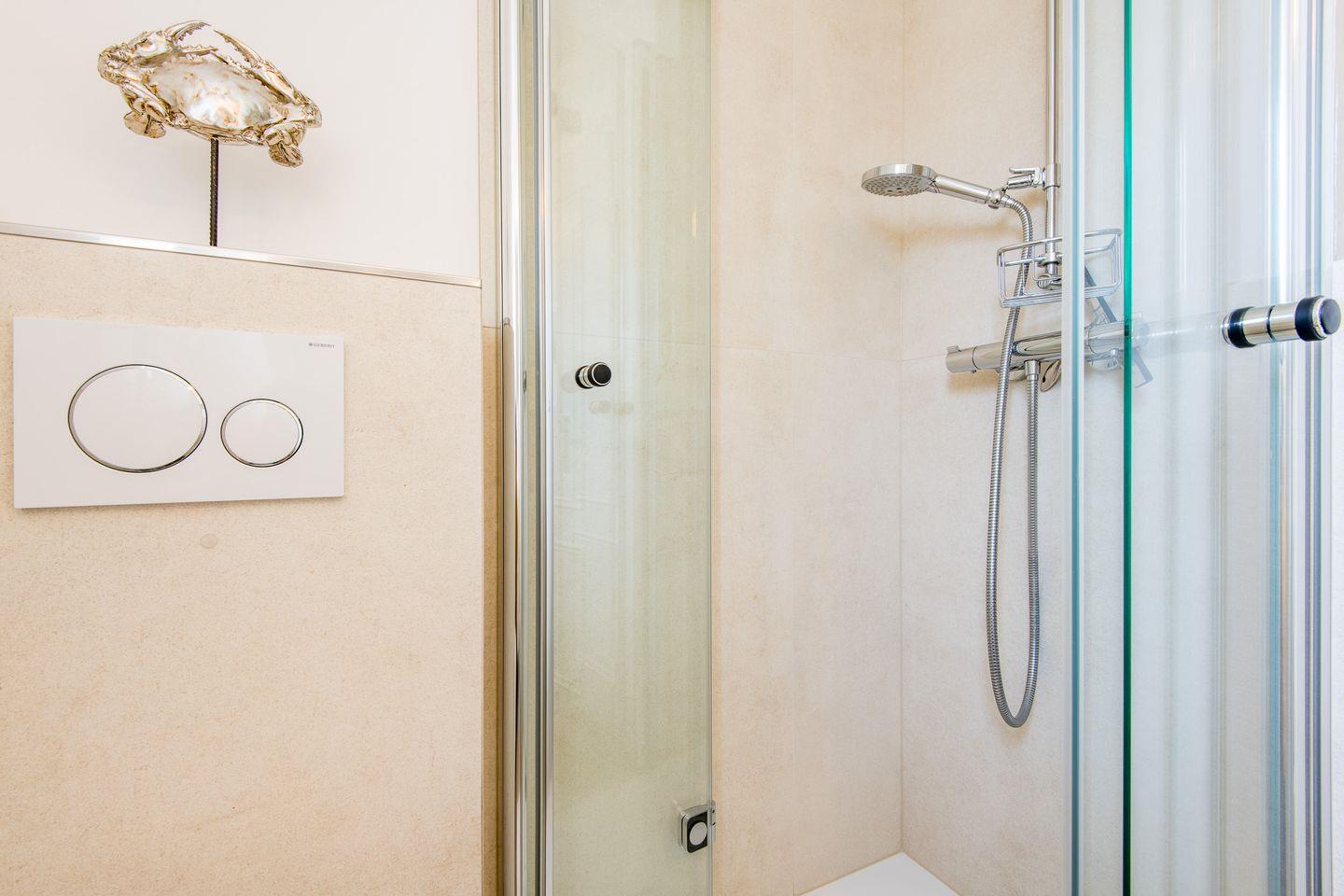 Das Badezimmer verfügt über eine Dusche, WC, Handtuchwärmer und Tageslicht – ideal für ein erfrischendes Duscherlebnis nach einem erholsamen Strandtag.