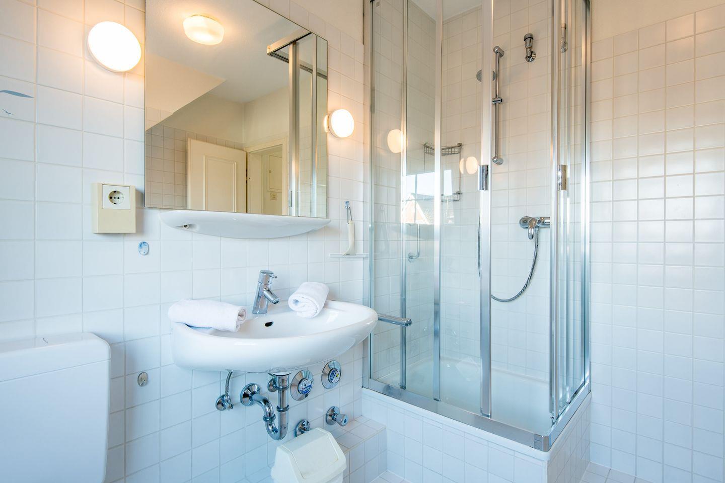 Das moderne Badezimmer ist mit einer Dusche, WC, Föhn und Tageslicht ausgestattet.