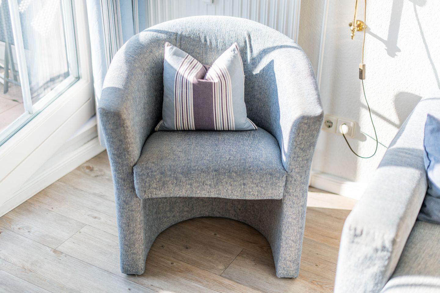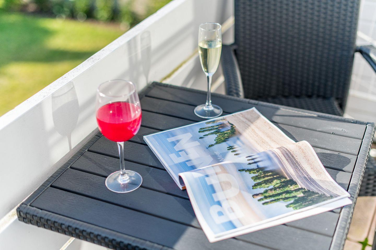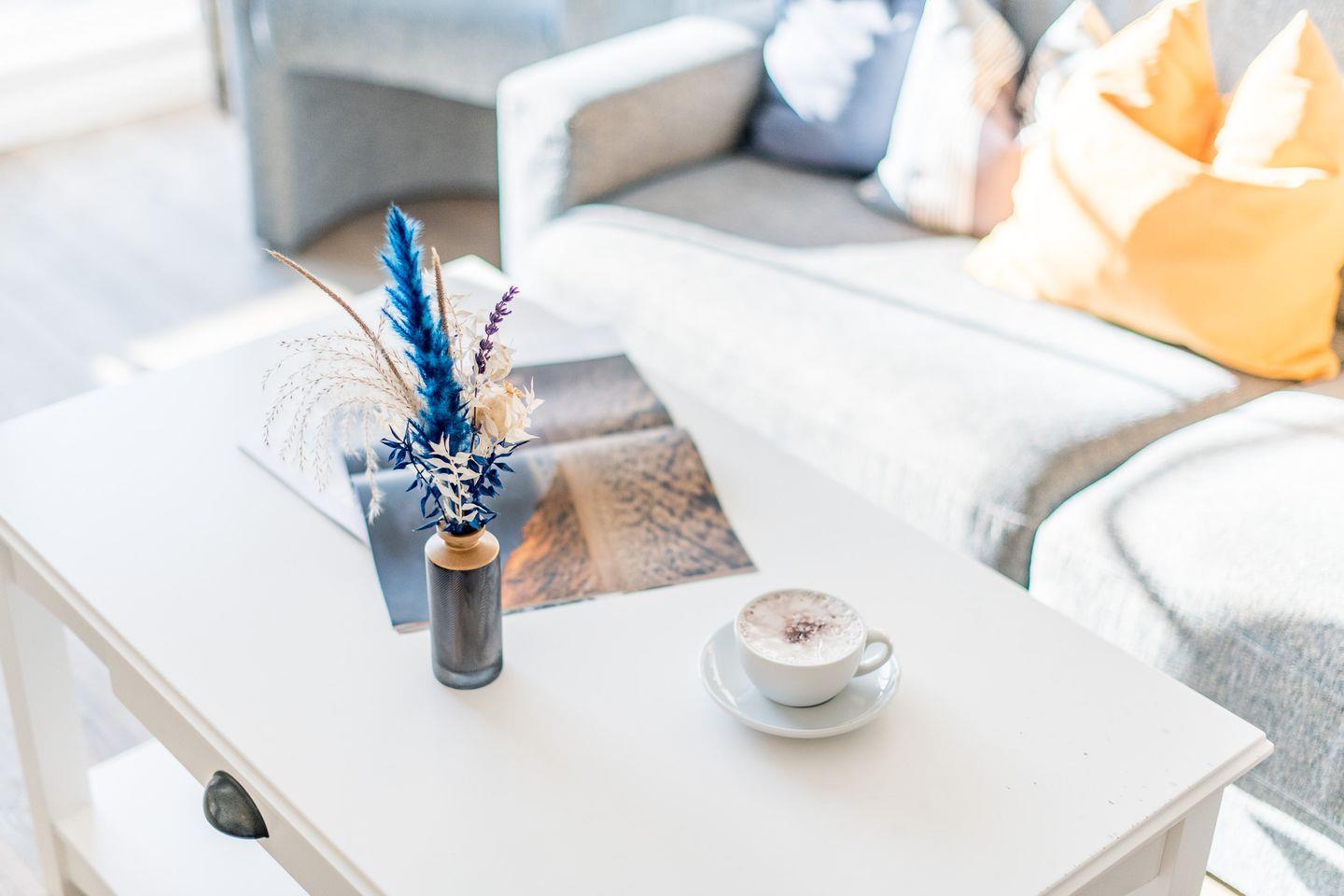Das helle Wohnzimmer verfügt über ein ausziehbares Schlafsofa (160x200 cm), einen Sessel und TV sowie einen Esstisch für 4 Personen. Der direkte Zugang zum möblierten Süd-Balkon lädt zum Verweilen und Sonnenbaden ein.