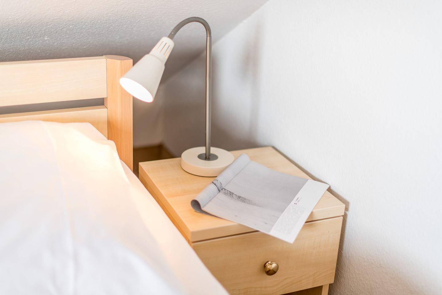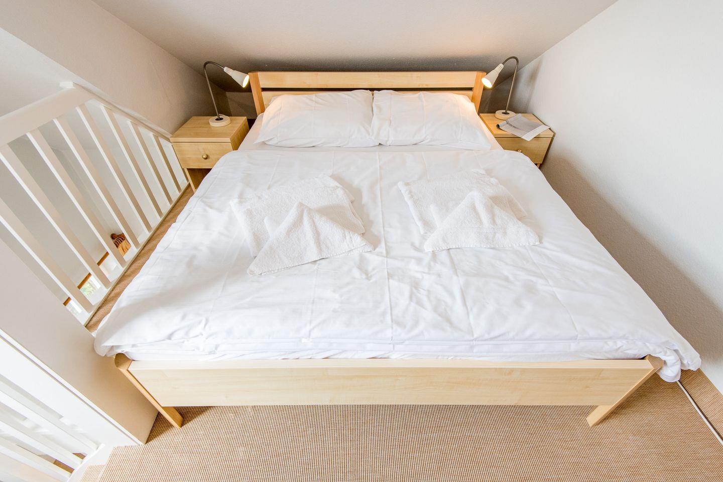 Das gemütliche, halboffene Schlafzimmer ist mit einem Doppelbett (2x 80x200 cm), einem Kleiderschrank, einer Kommode sowie einem kleinen Tisch mit Stühlen und Sessel eingerichtet und verspricht höchsten Schlafkomfort.
