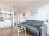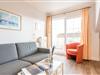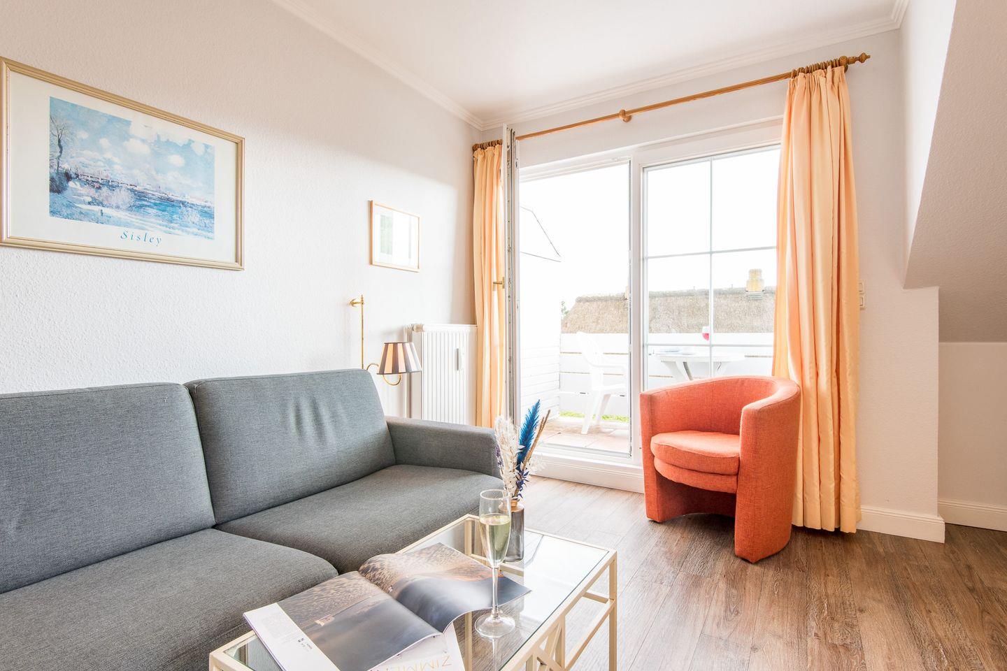 Das Wohnzimmer ist mit einem ausziehbaren Schlafsofa (140x190 cm), einem Sessel, TV und einem Esstisch mit 3 Stühlen ausgestattet. Der möblierte Süd-Balkon ist direkt zugänglich und lädt zu entspannten Stunden in der Sonne ein.