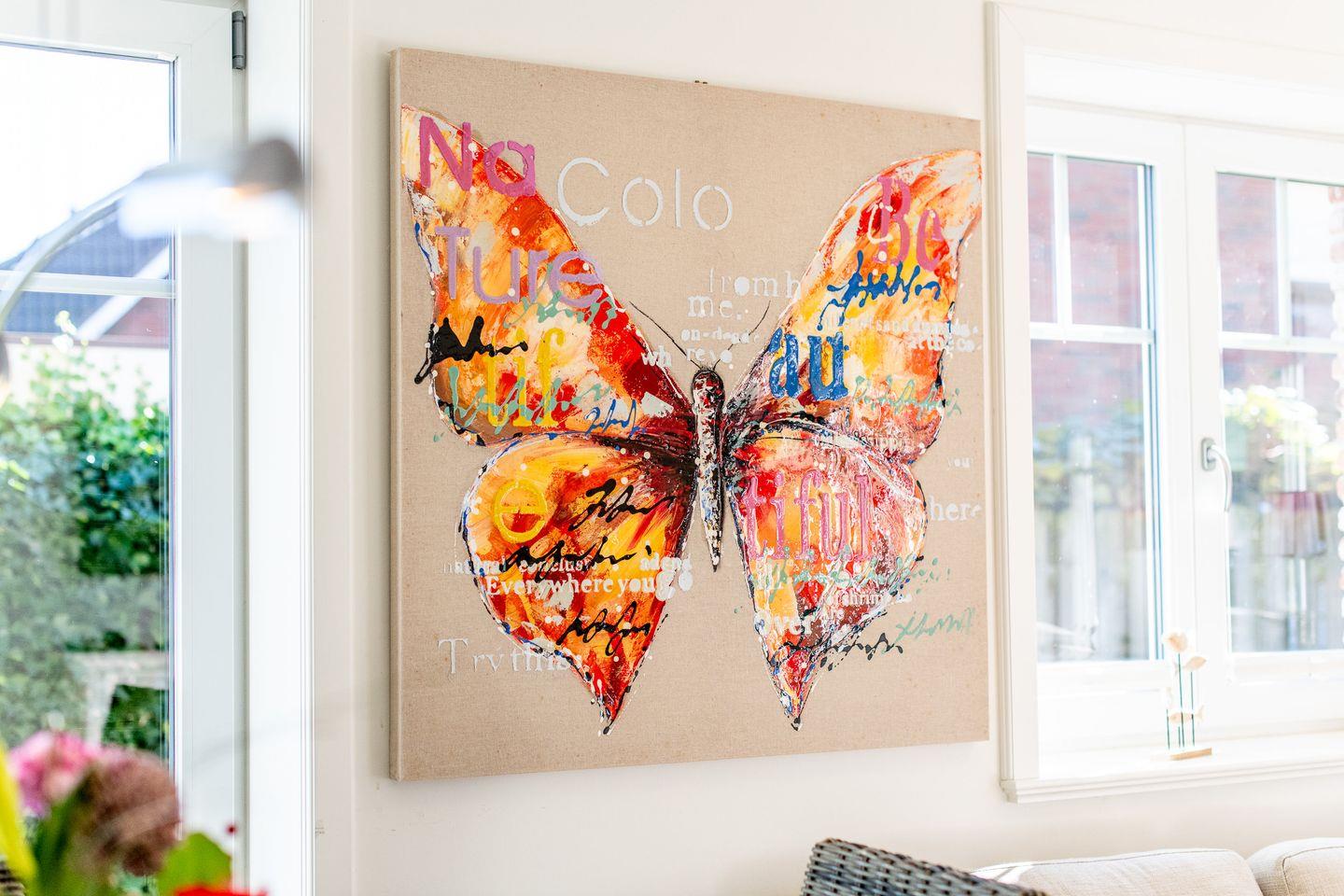 Das lichtdurchflutete Wohnzimmer ist mit einem gemütlichen Ecksofa und einem TV ausgestattet, ideal für entspannte Abende. Der angrenzende Essbereich bietet ausreichend Platz. Von hier aus haben Sie direkten Zugang zur möblierten Süd-Terrasse mit Strandkorb, wo Sie sonnige Stunden im Garten genießen können.