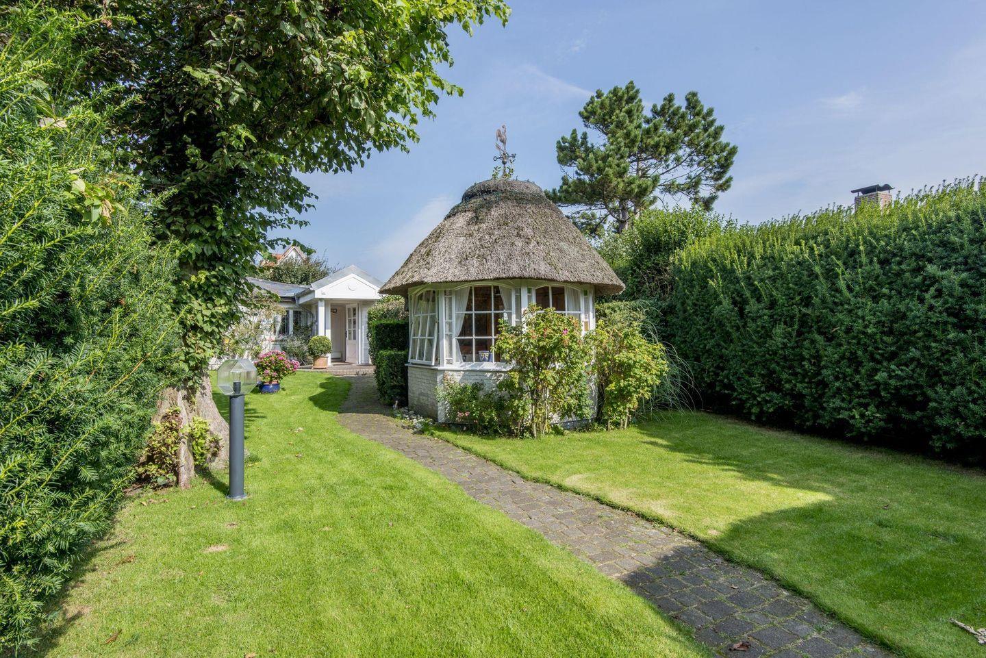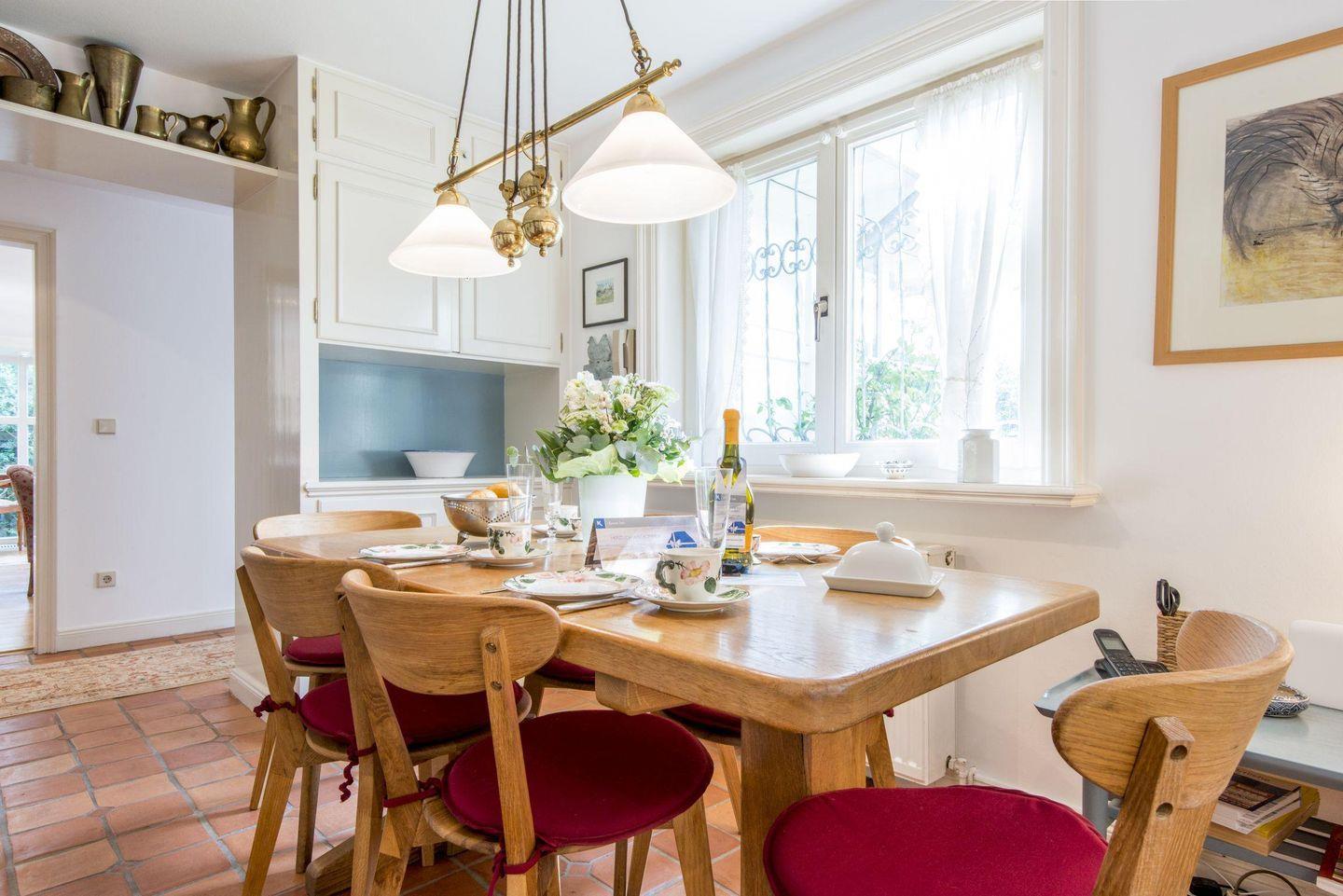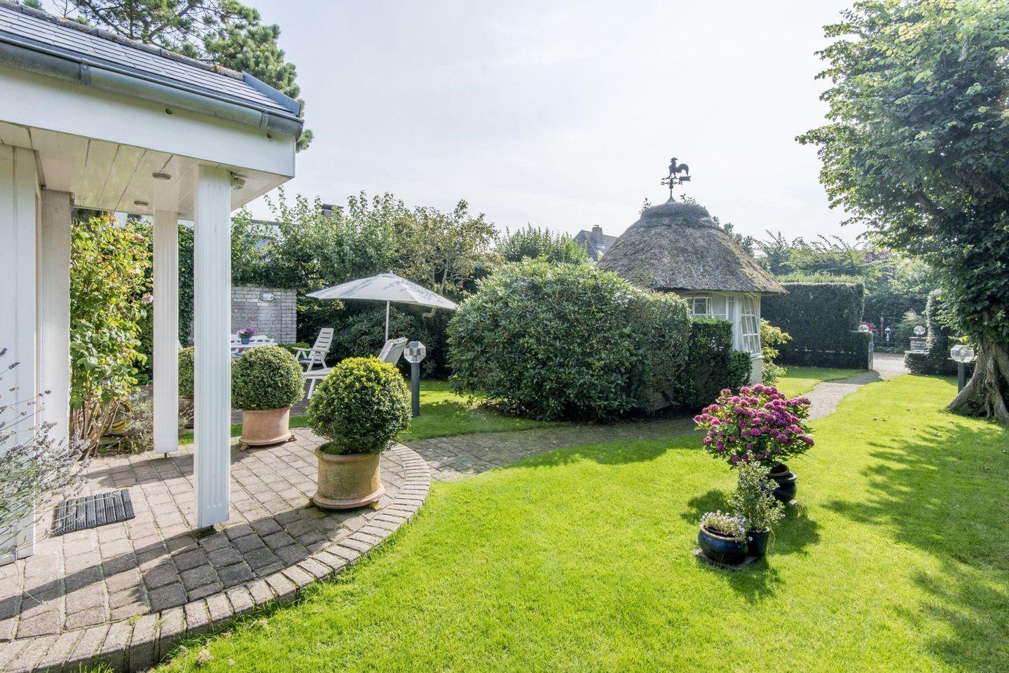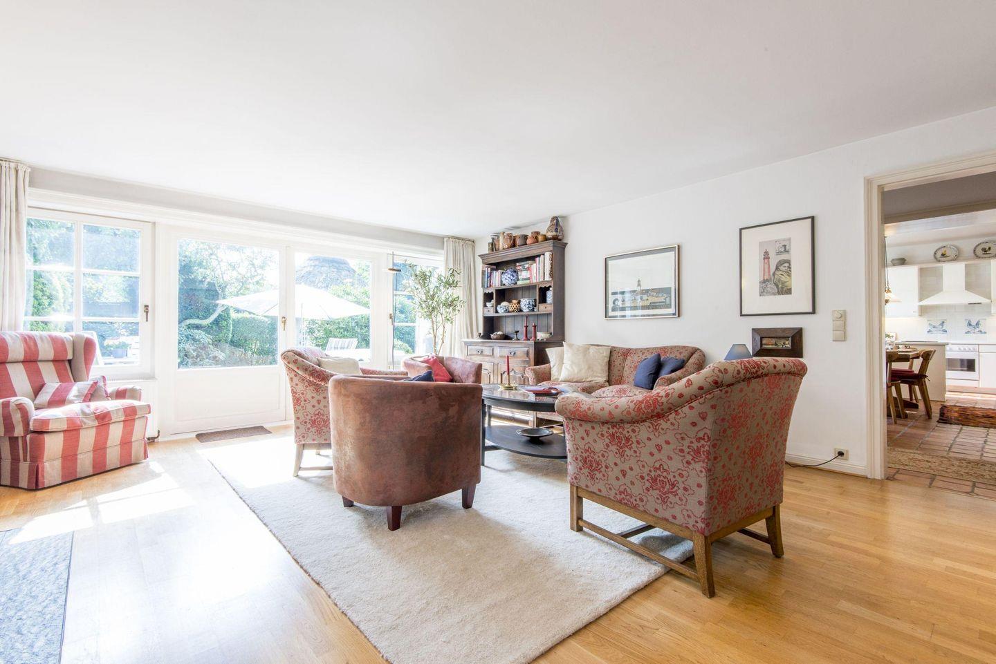 Das große, helle Wohnzimmer ist mit einem bequemen Sofa, Sesseln, einem Schreibtisch und einem TV ausgestattet. Von hier aus haben Sie direkten Zugang zur möblierten Südterrasse und dem eingezäunten Garten mit einem charmanten reetgedeckten Pavillon – perfekt, um die Ruhe und das Ambiente in vollen Zügen zu genießen.