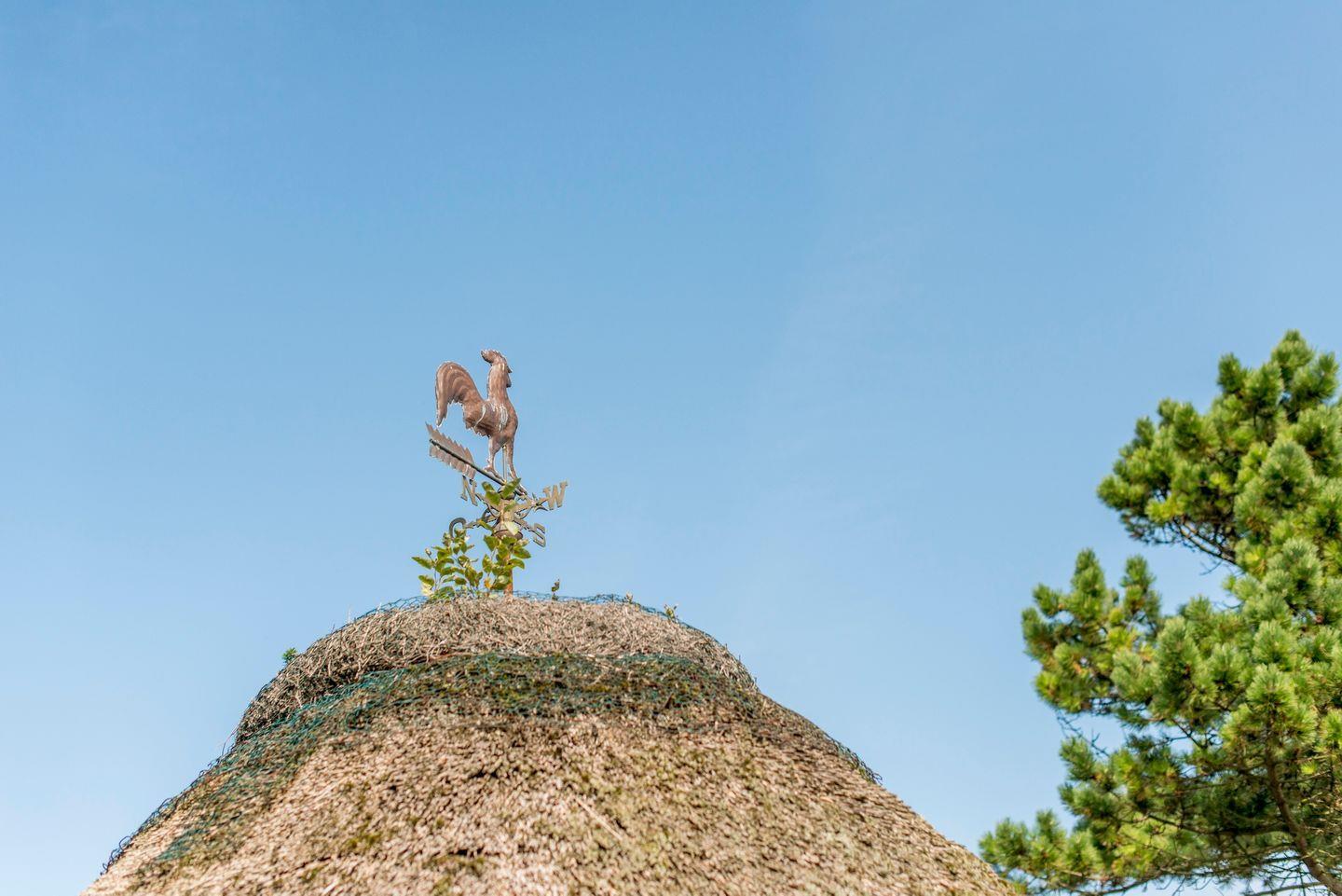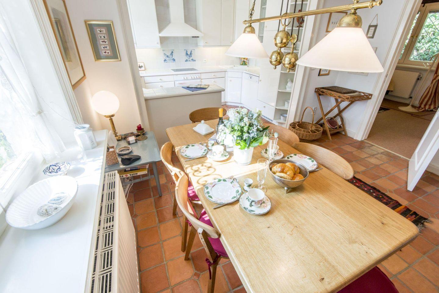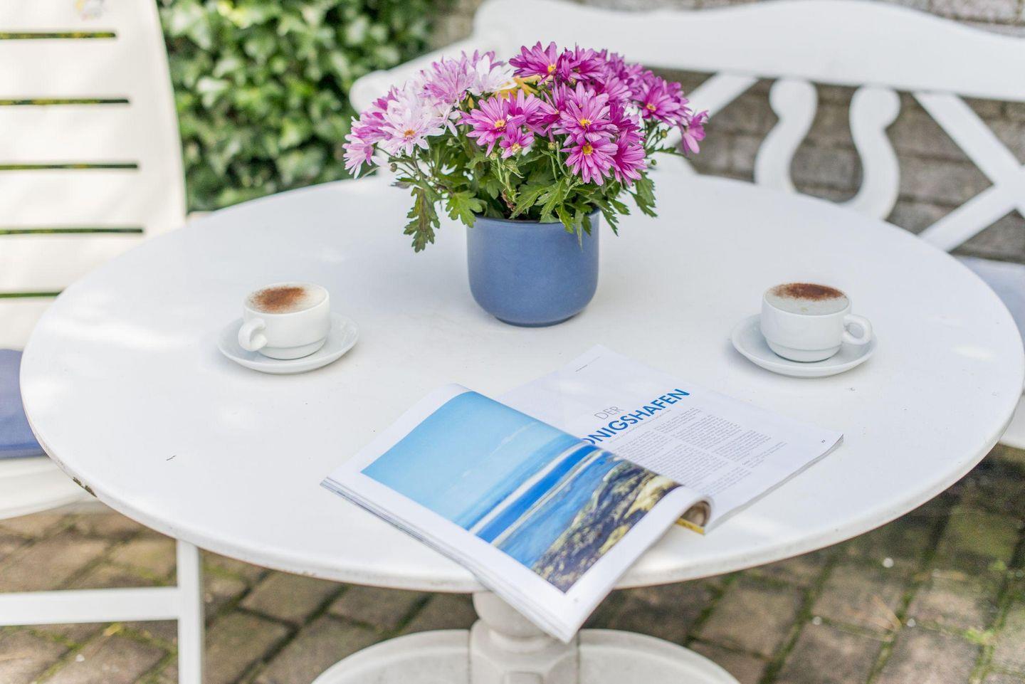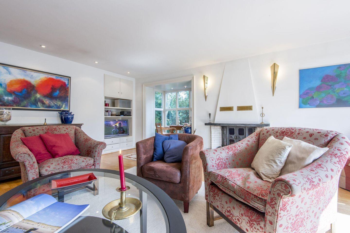 Das große, helle Wohnzimmer ist mit einem bequemen Sofa, Sesseln, einem Schreibtisch und einem TV ausgestattet. Von hier aus haben Sie direkten Zugang zur möblierten Südterrasse und dem eingezäunten Garten mit einem charmanten reetgedeckten Pavillon – perfekt, um die Ruhe und das Ambiente in vollen Zügen zu genießen.