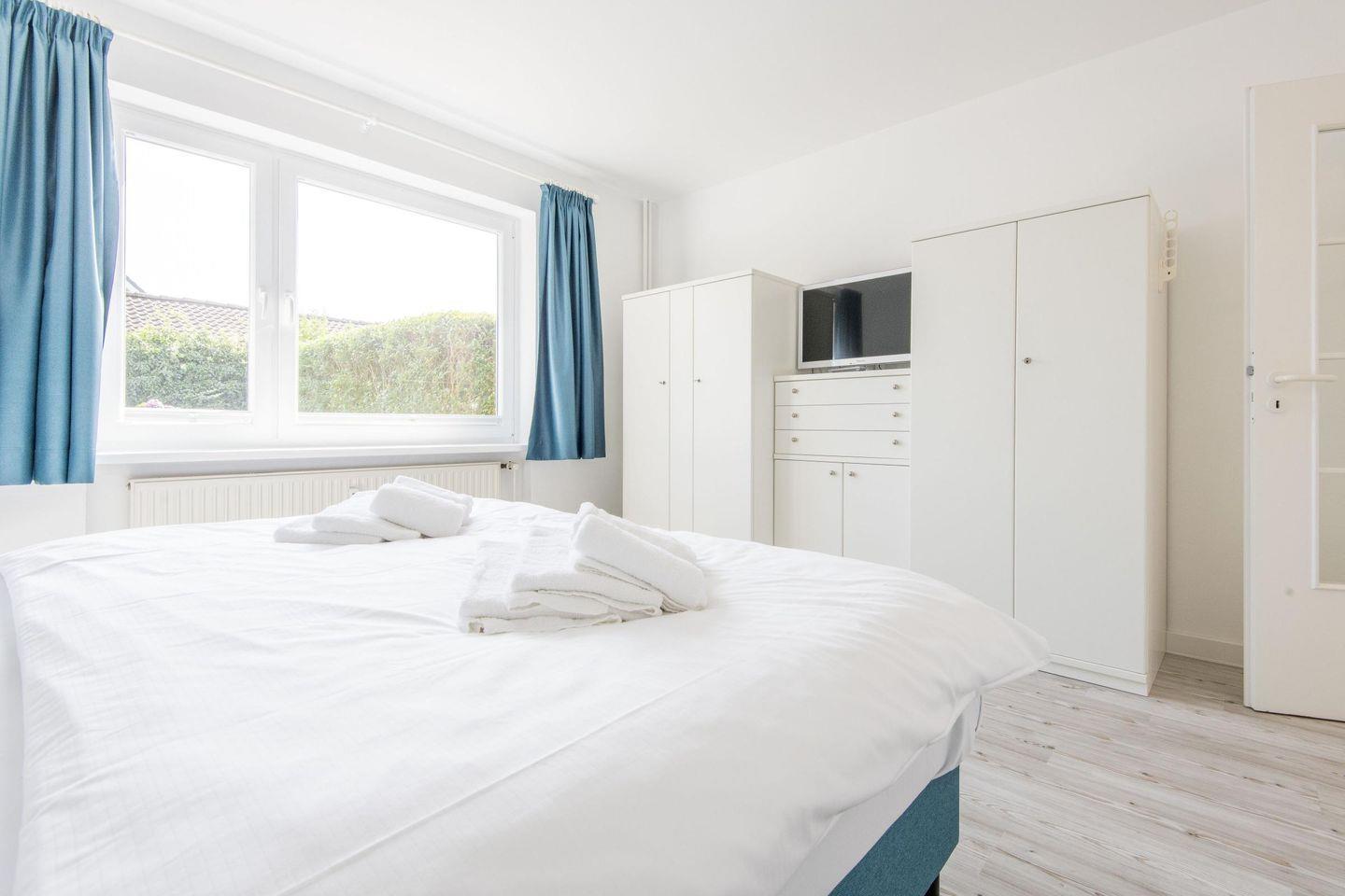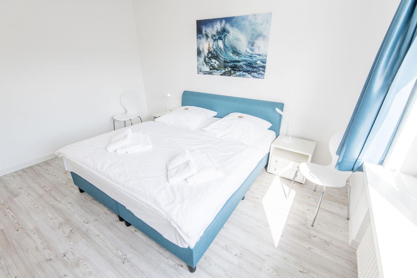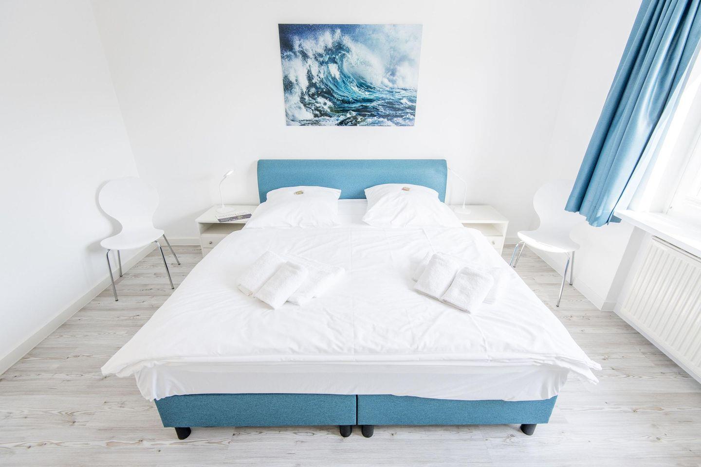 Das geräumige Schlafzimmer ist mit einem komfortablen Boxspringbett (180x200 cm), Kleiderschrank und TV ausgestattet. Das Badezimmer bietet eine Dusche, WC, Föhn und Tageslicht.