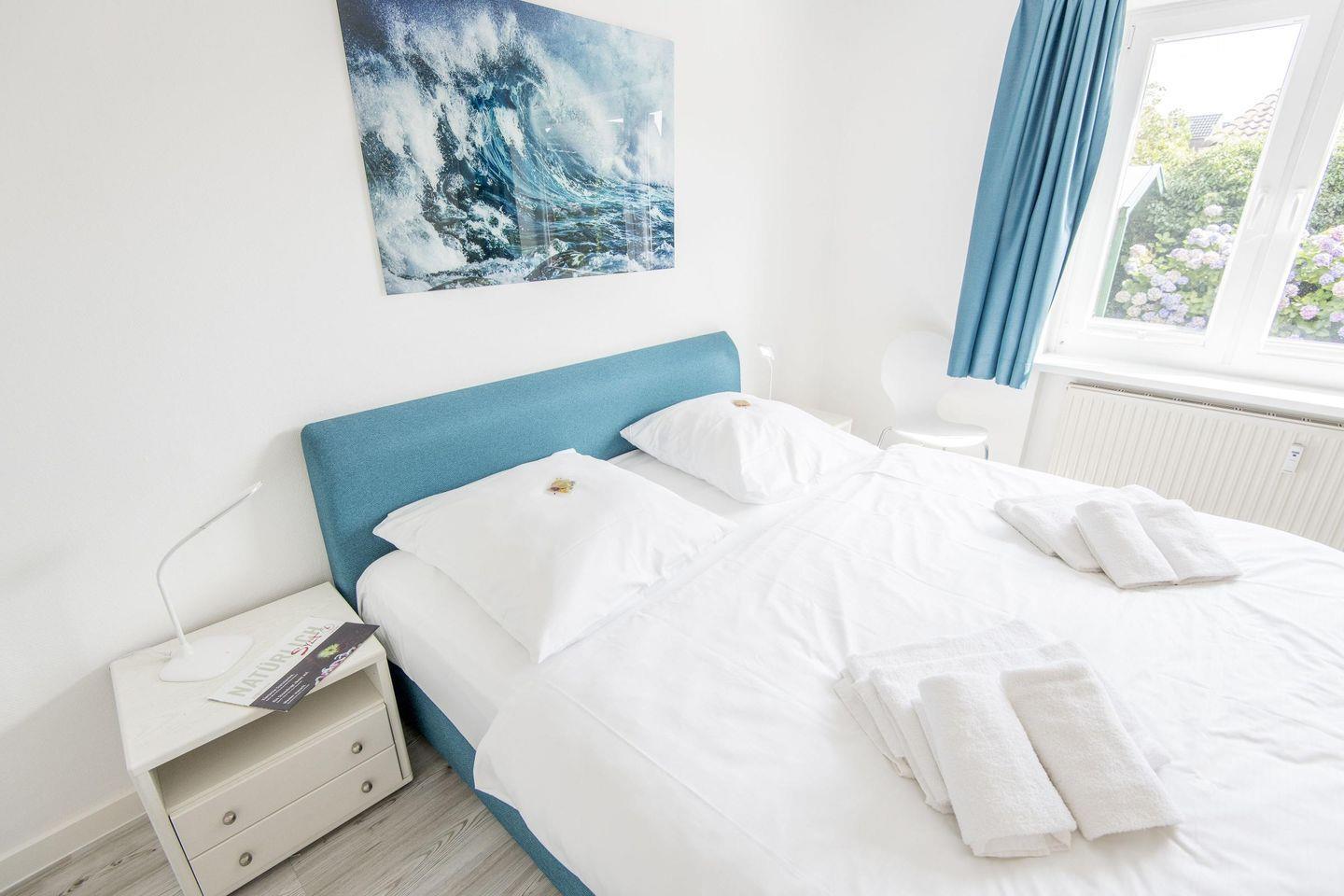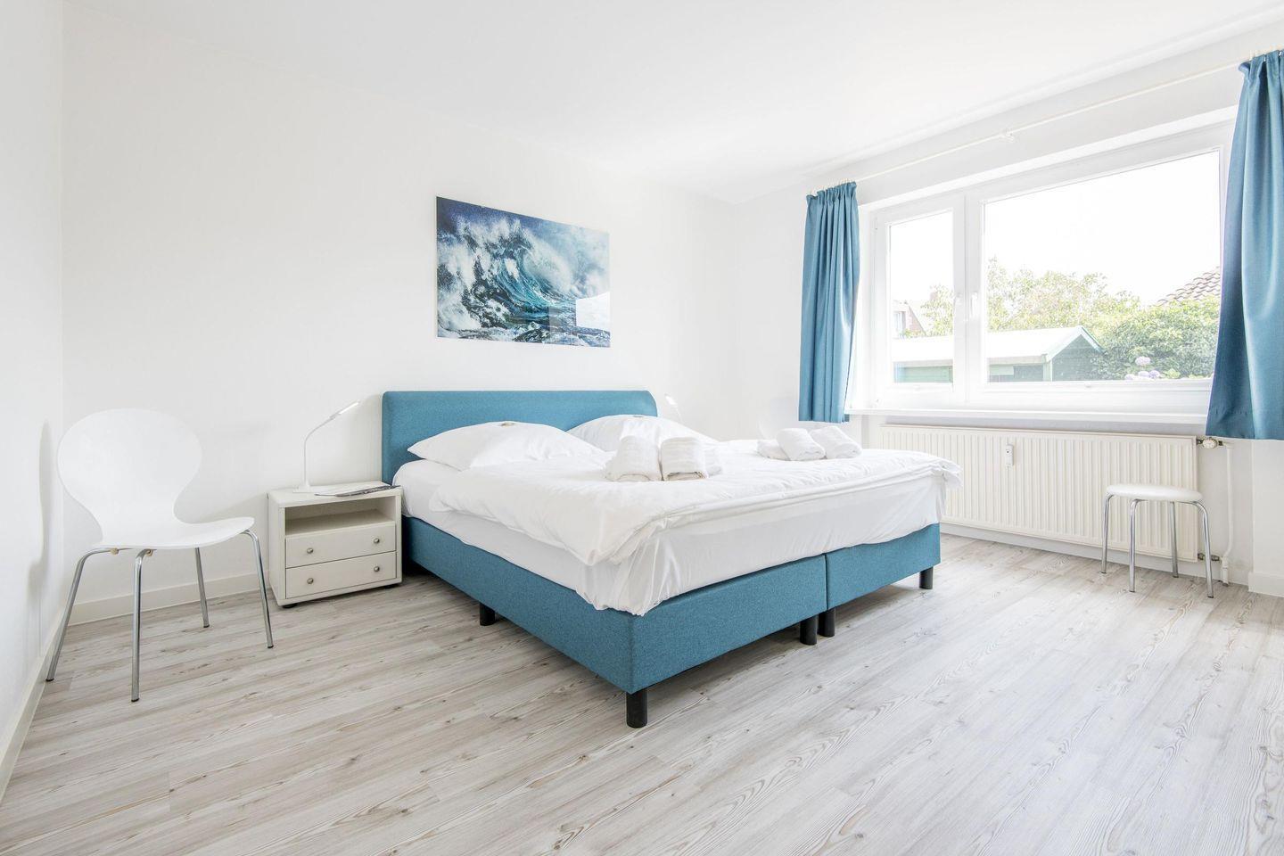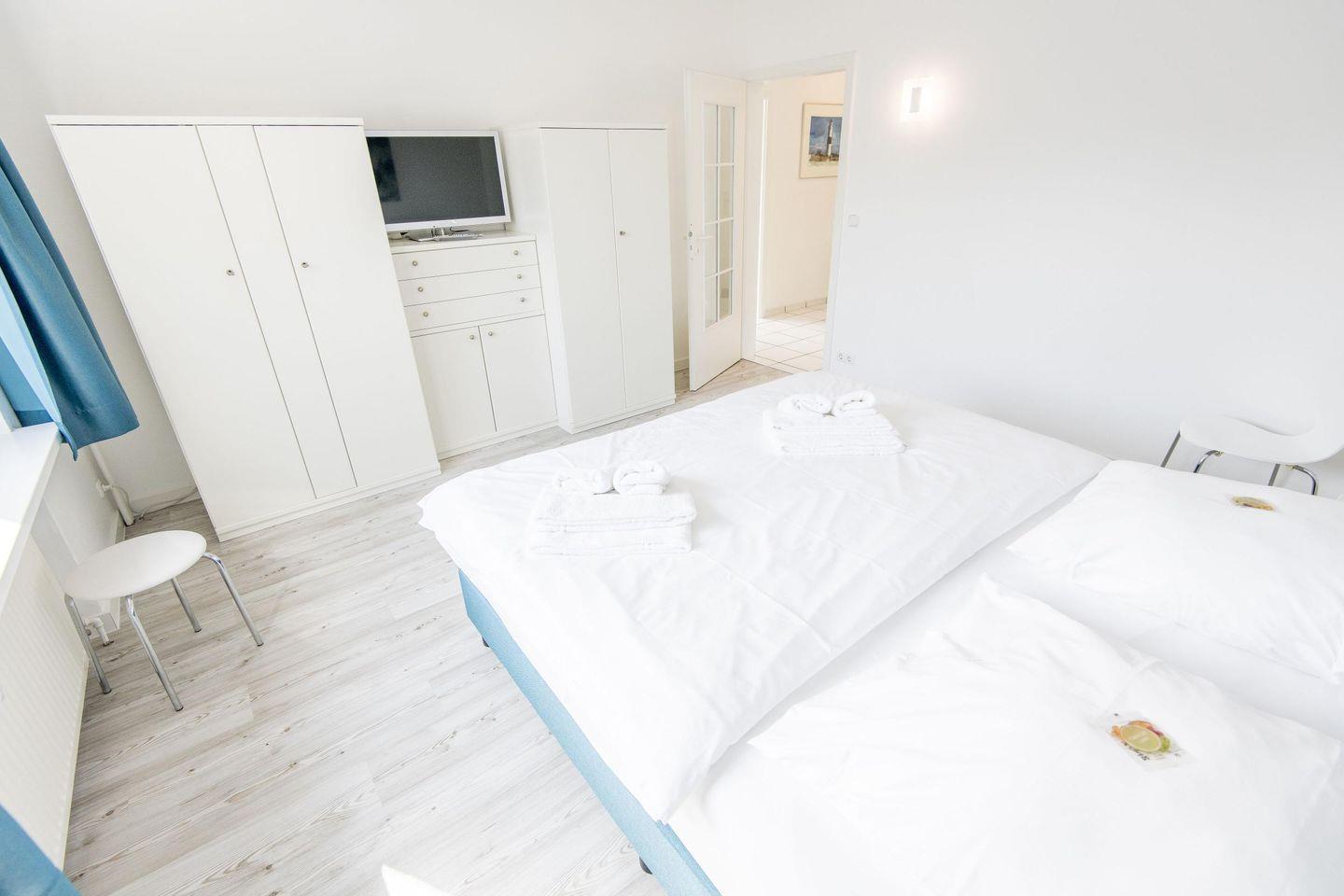 Das geräumige Schlafzimmer ist mit einem komfortablen Boxspringbett (180x200 cm), Kleiderschrank und TV ausgestattet. Das Badezimmer bietet eine Dusche, WC, Föhn und Tageslicht.
