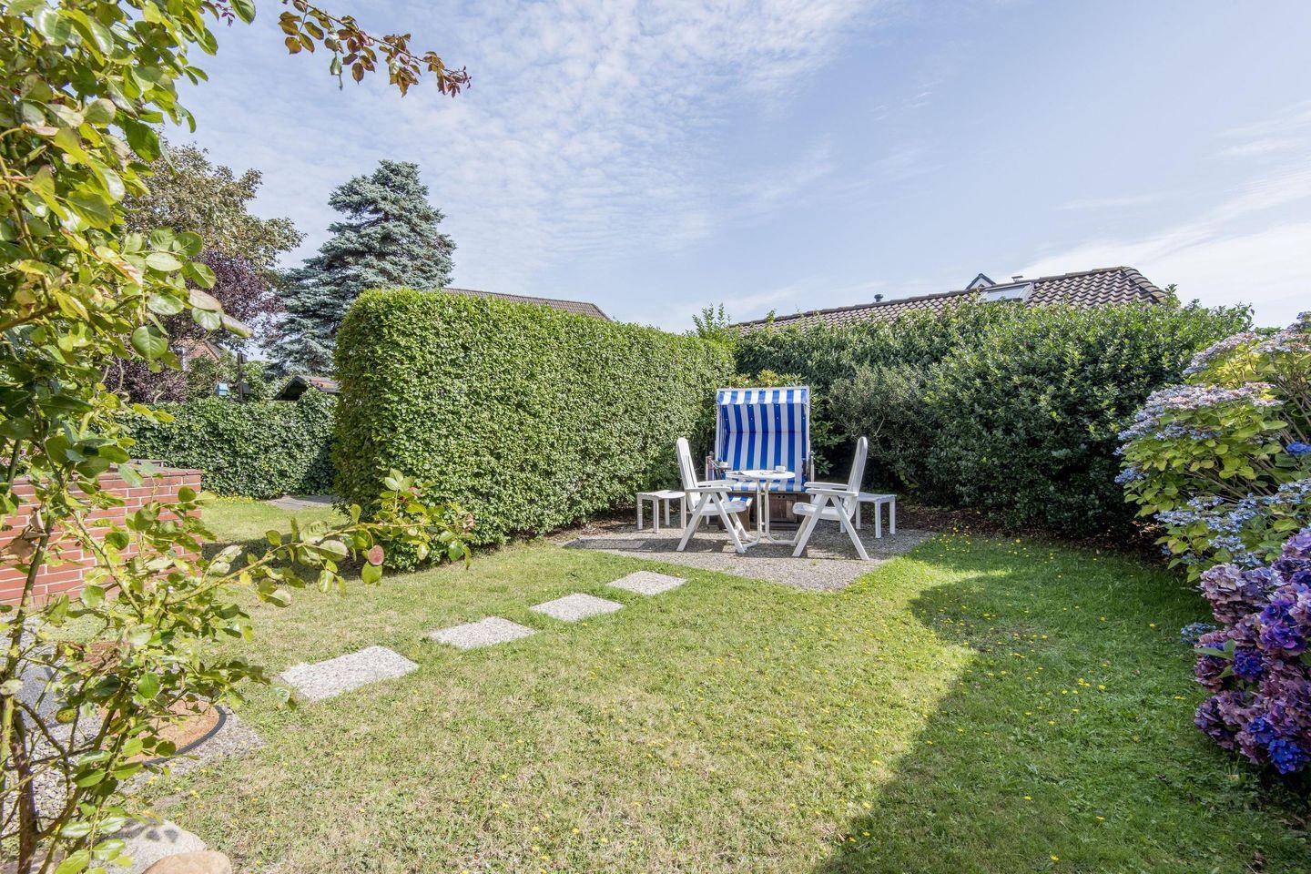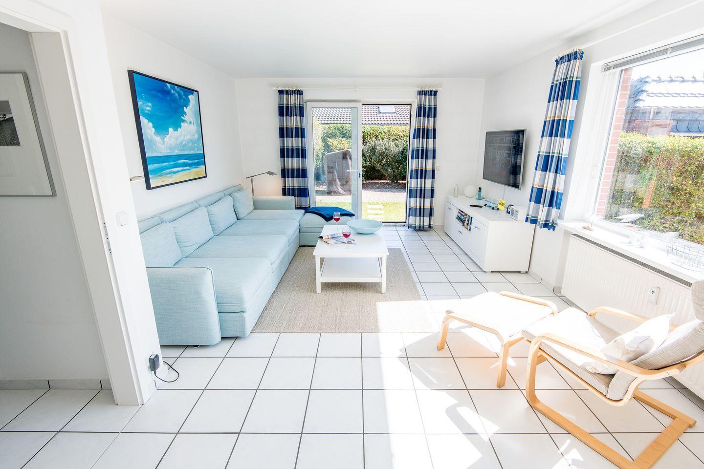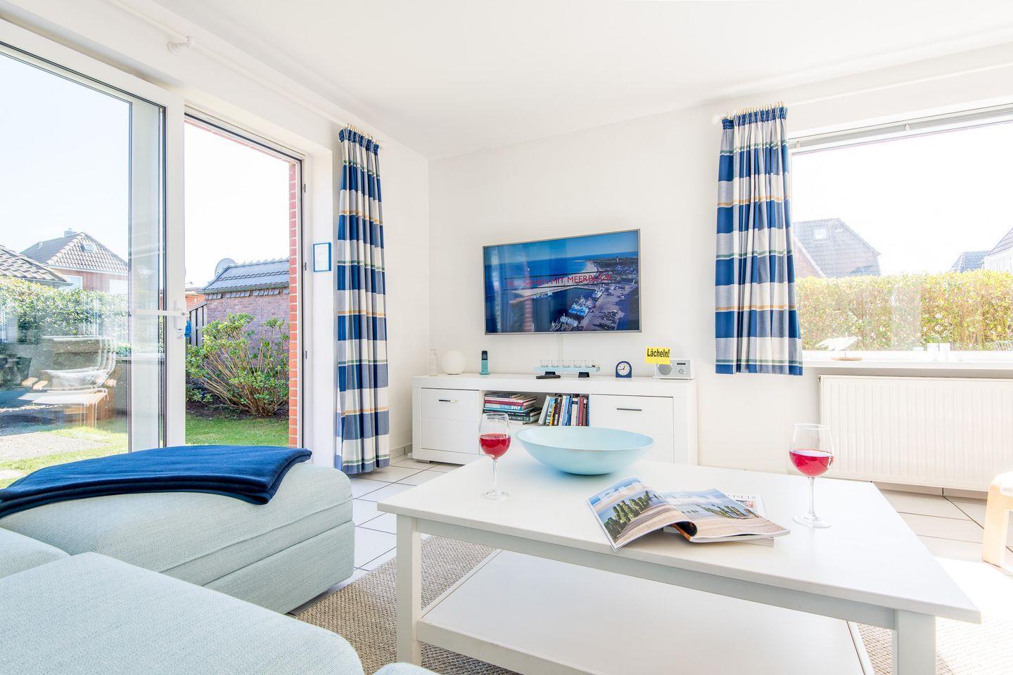 Das gemütliche Wohnzimmer verfügt über ein Schlafsofa (140x200 cm), einen Relax-Sessel mit Hocker und einen Esstisch mit 4 Stühlen. Moderne Unterhaltungsmöglichkeiten durch TV. Vom Wohnzimmer haben Sie direkten Zugang zur möblierten Gartenterrasse nach Süd-Westen, die mit einem Strandkorb ausgestattet ist – ideal zum Entspannen und Genießen der Sonne.