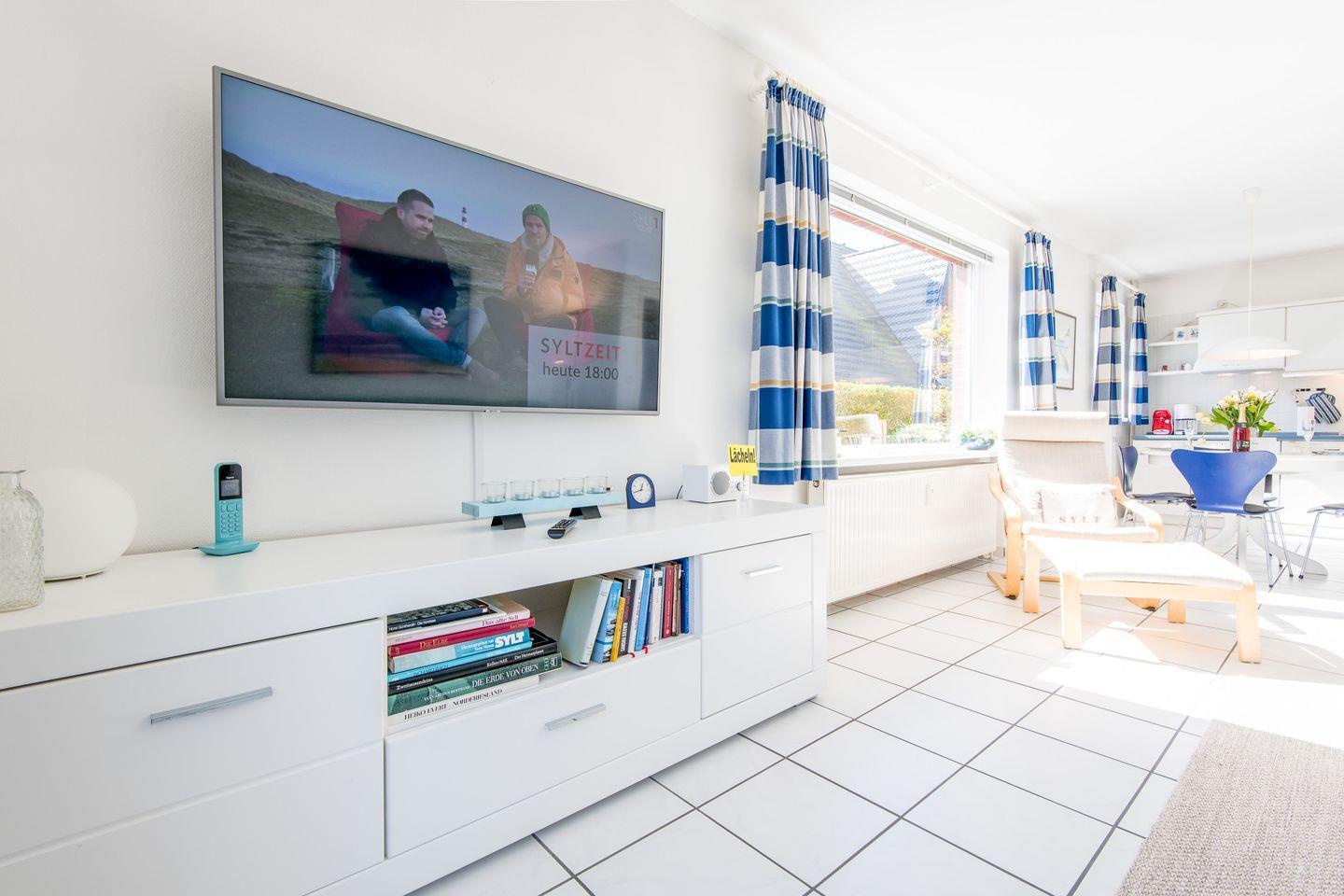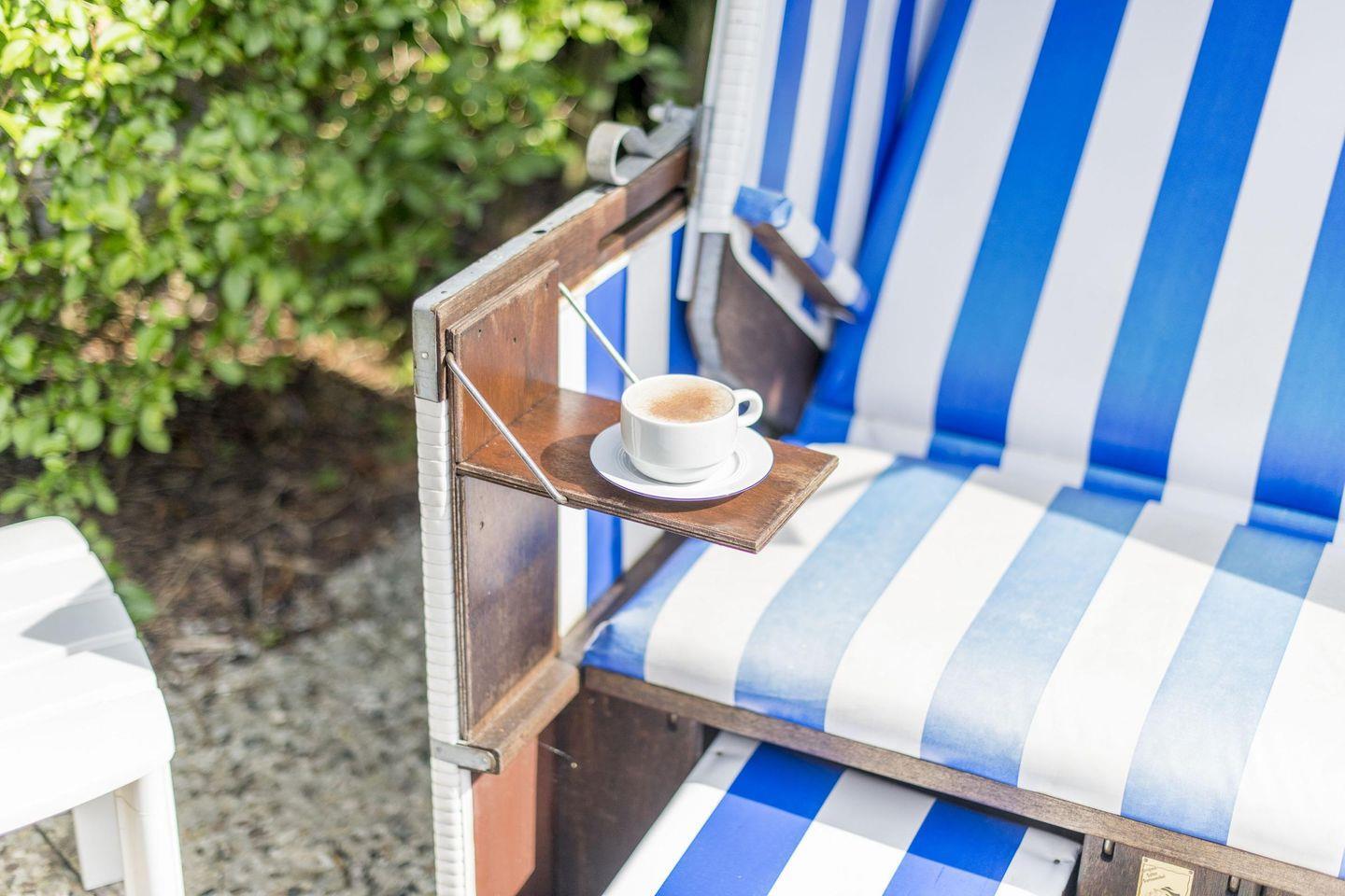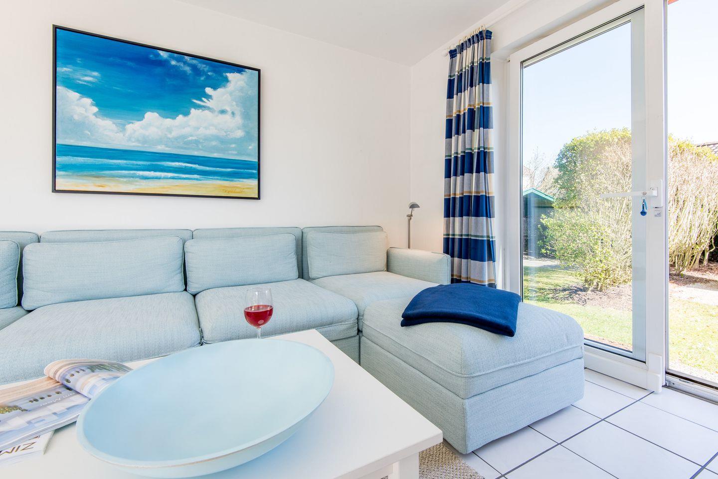 Das gemütliche Wohnzimmer verfügt über ein Schlafsofa (140x200 cm), einen Relax-Sessel mit Hocker und einen Esstisch mit 4 Stühlen. Moderne Unterhaltungsmöglichkeiten durch TV. Vom Wohnzimmer haben Sie direkten Zugang zur möblierten Gartenterrasse nach Süd-Westen, die mit einem Strandkorb ausgestattet ist – ideal zum Entspannen und Genießen der Sonne.