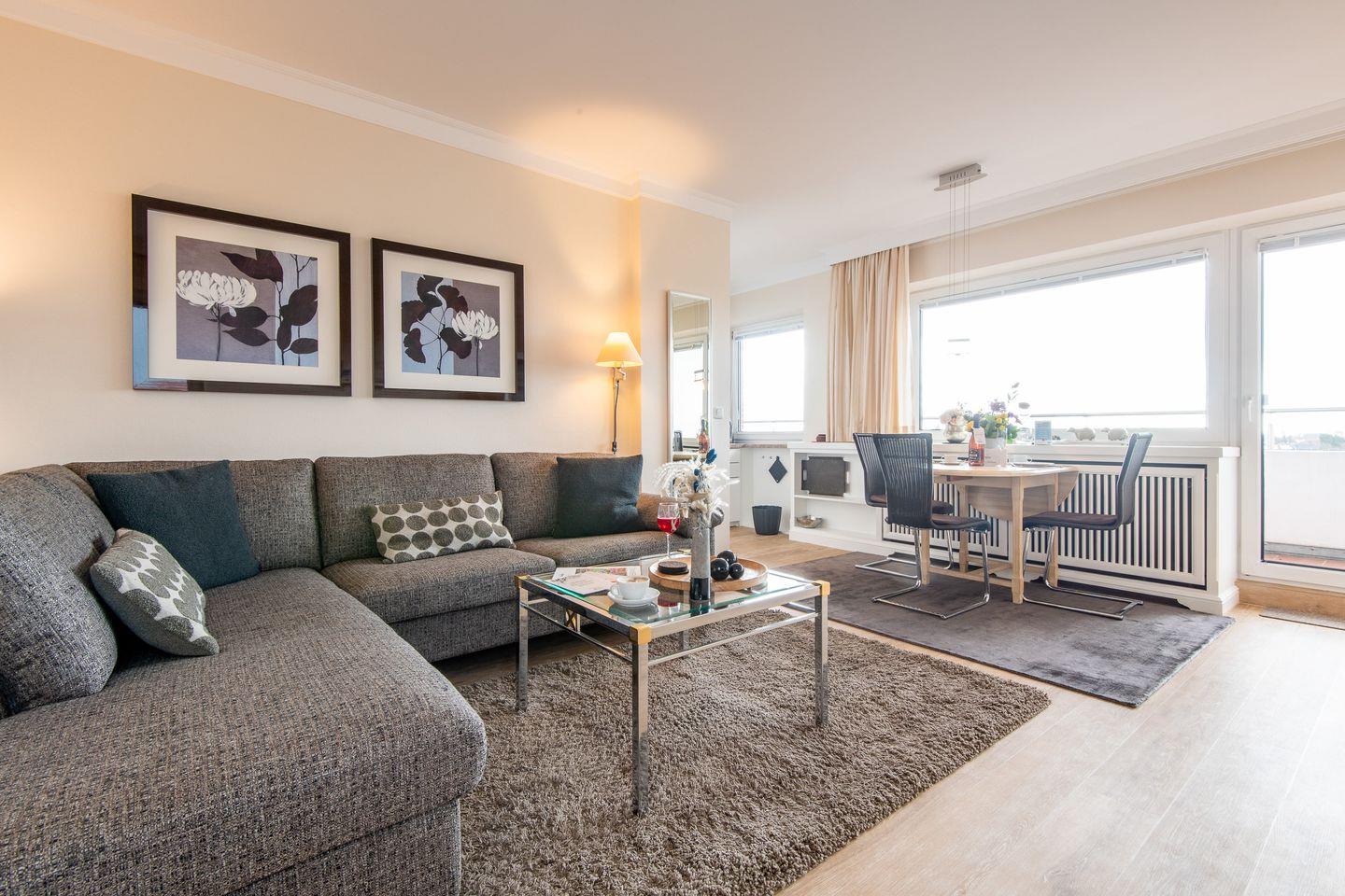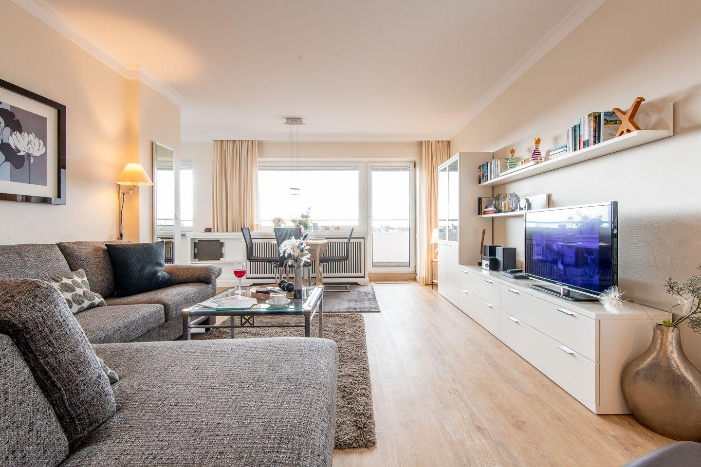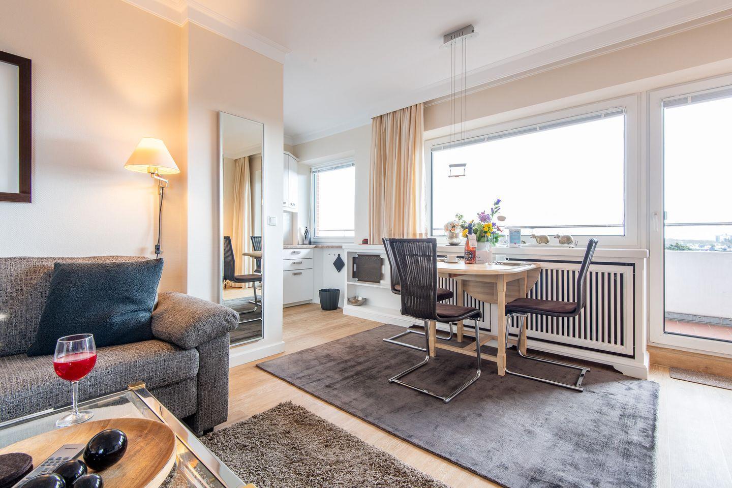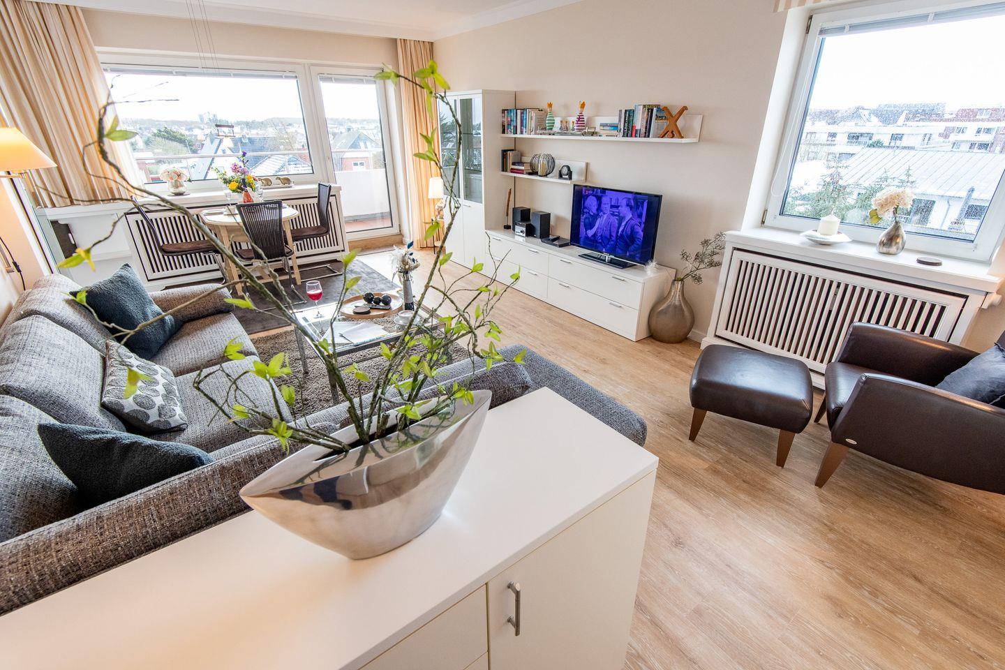 Das helle Wohnzimmer verfügt über ein komfortables Ecksofa, einen Entspannungssessel und einen TV. Der angrenzende Esstisch bietet Platz für 3 Personen. Vom Wohnzimmer aus haben Sie direkten Zugang zum möblierten Balkon, der Ihnen einen herrlichen Ausblick über den Süden von Westerland bis zu den Dünen bietet.