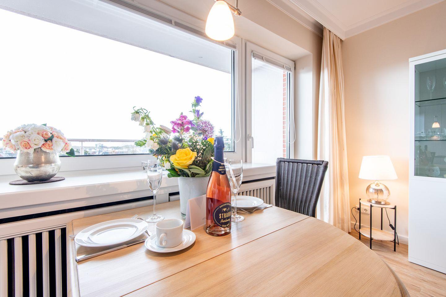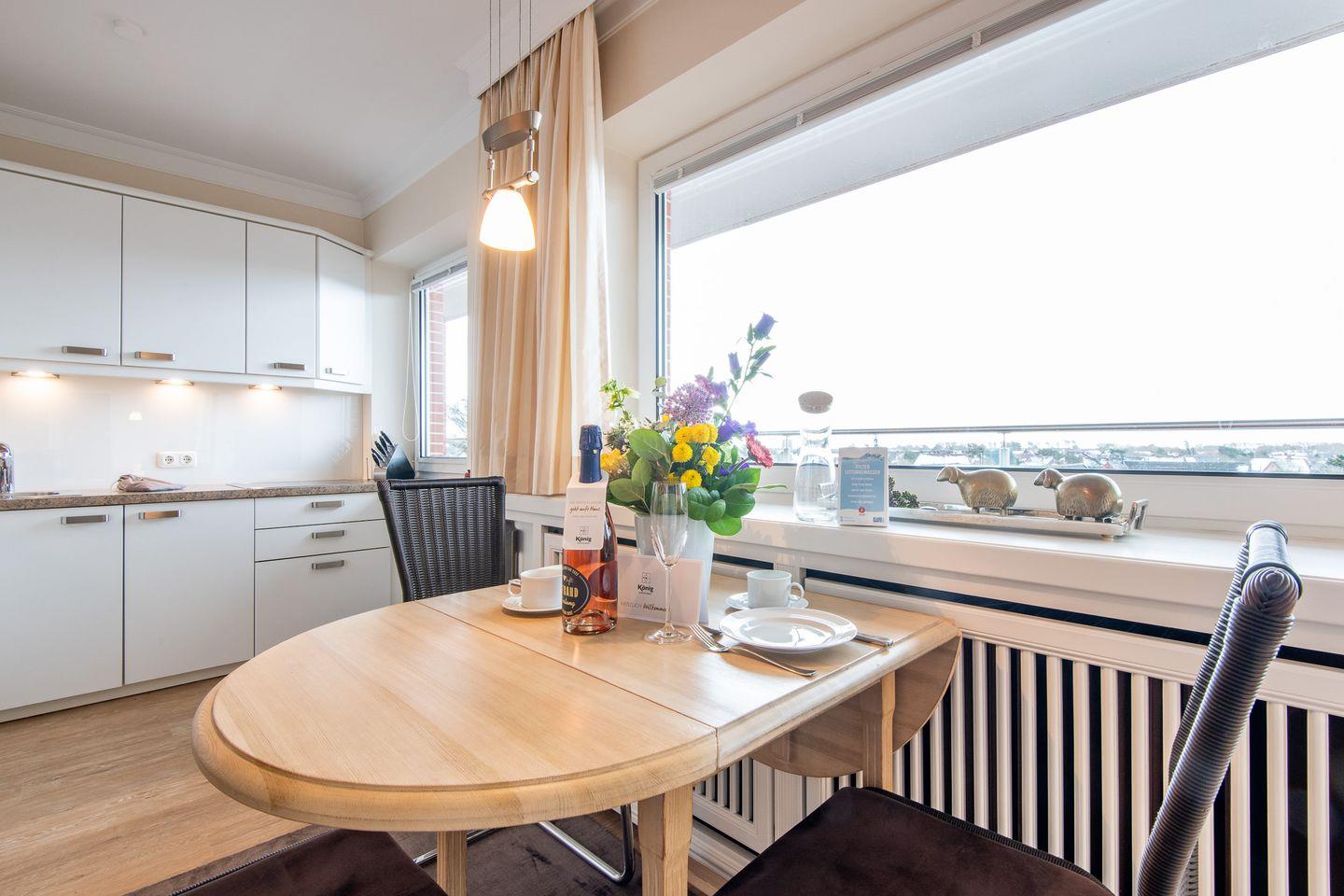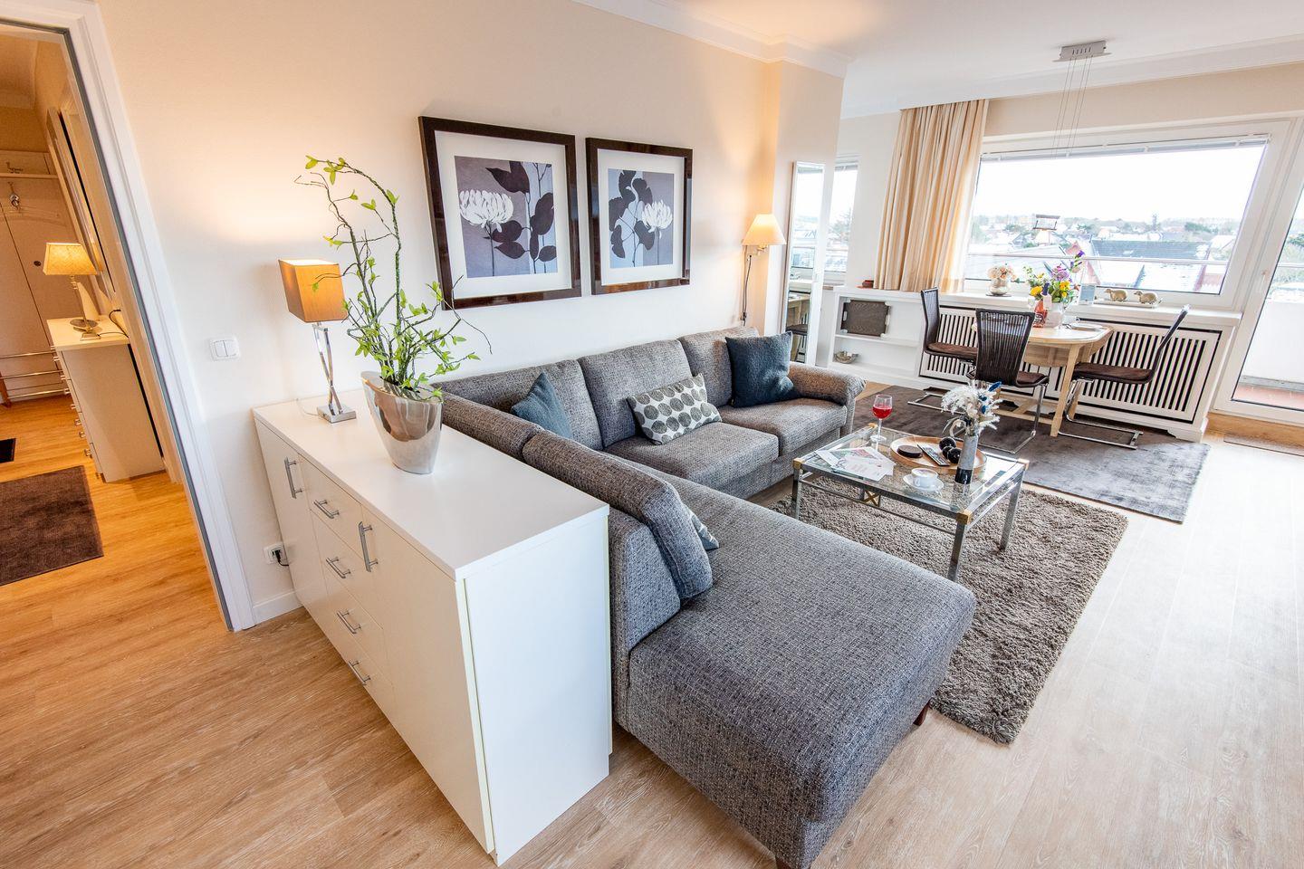 Das helle Wohnzimmer verfügt über ein komfortables Ecksofa, einen Entspannungssessel und einen TV. Der angrenzende Esstisch bietet Platz für 3 Personen. Vom Wohnzimmer aus haben Sie direkten Zugang zum möblierten Balkon, der Ihnen einen herrlichen Ausblick über den Süden von Westerland bis zu den Dünen bietet.