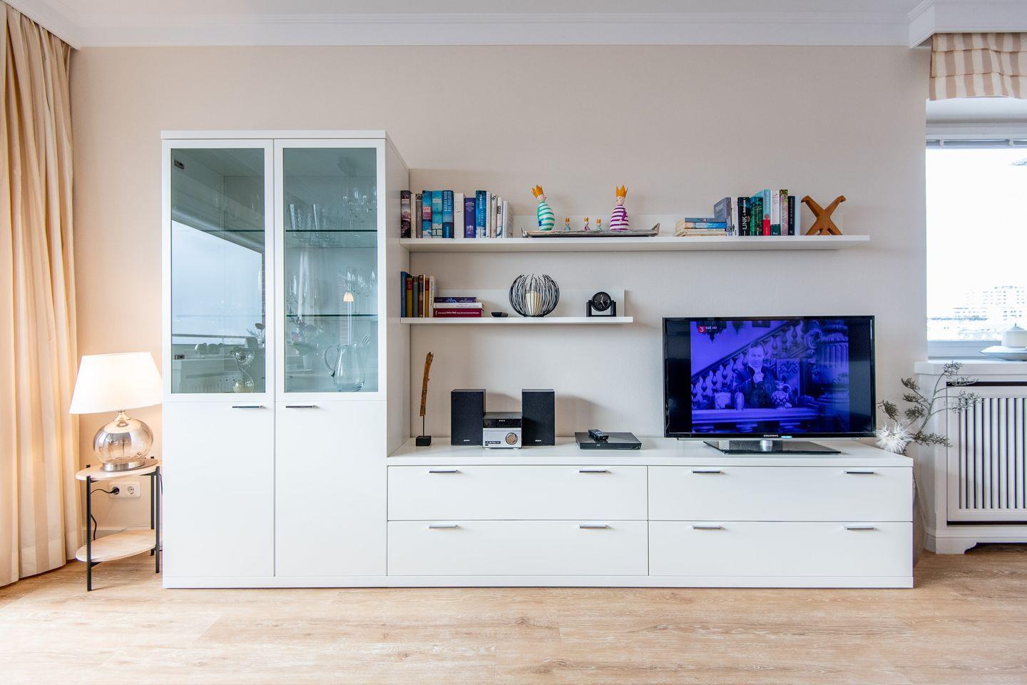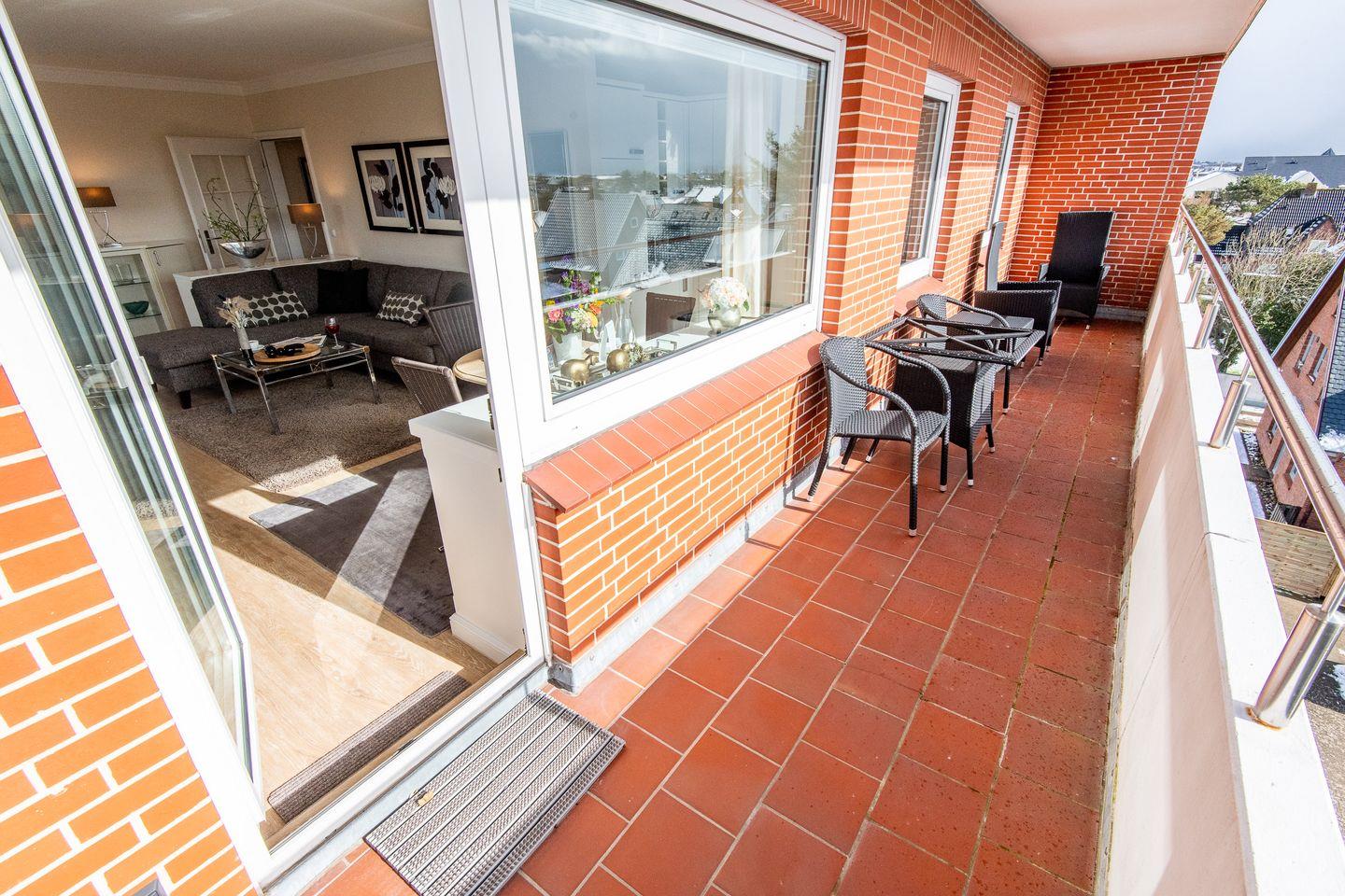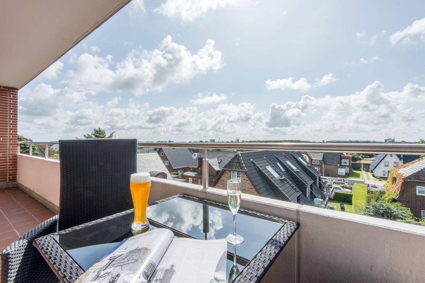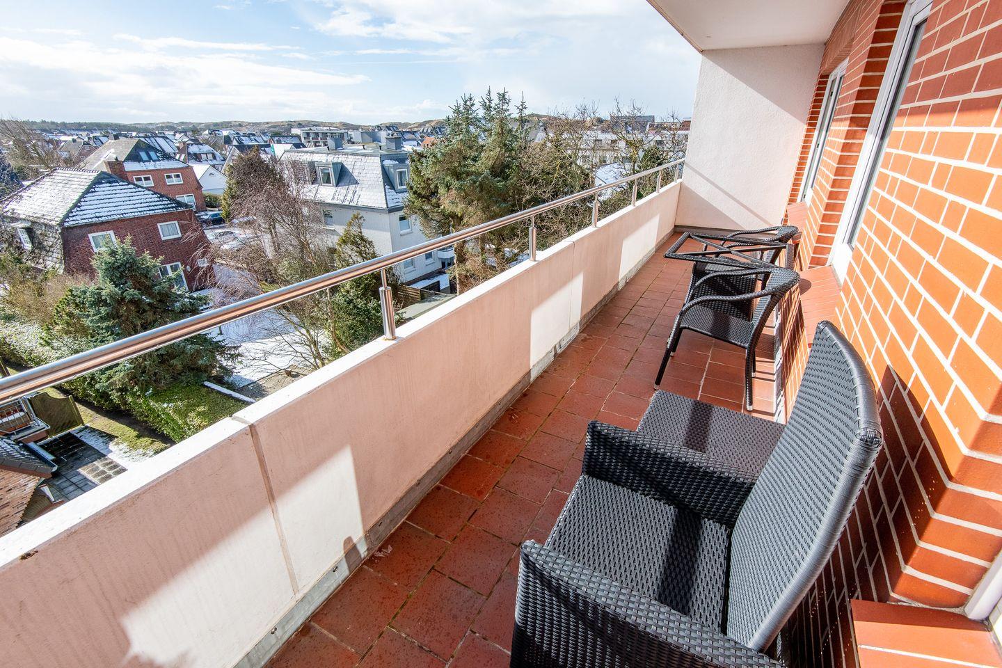 Das helle Wohnzimmer verfügt über ein komfortables Ecksofa, einen Entspannungssessel und einen TV. Der angrenzende Esstisch bietet Platz für 3 Personen. Vom Wohnzimmer aus haben Sie direkten Zugang zum möblierten Balkon, der Ihnen einen herrlichen Ausblick über den Süden von Westerland bis zu den Dünen bietet.