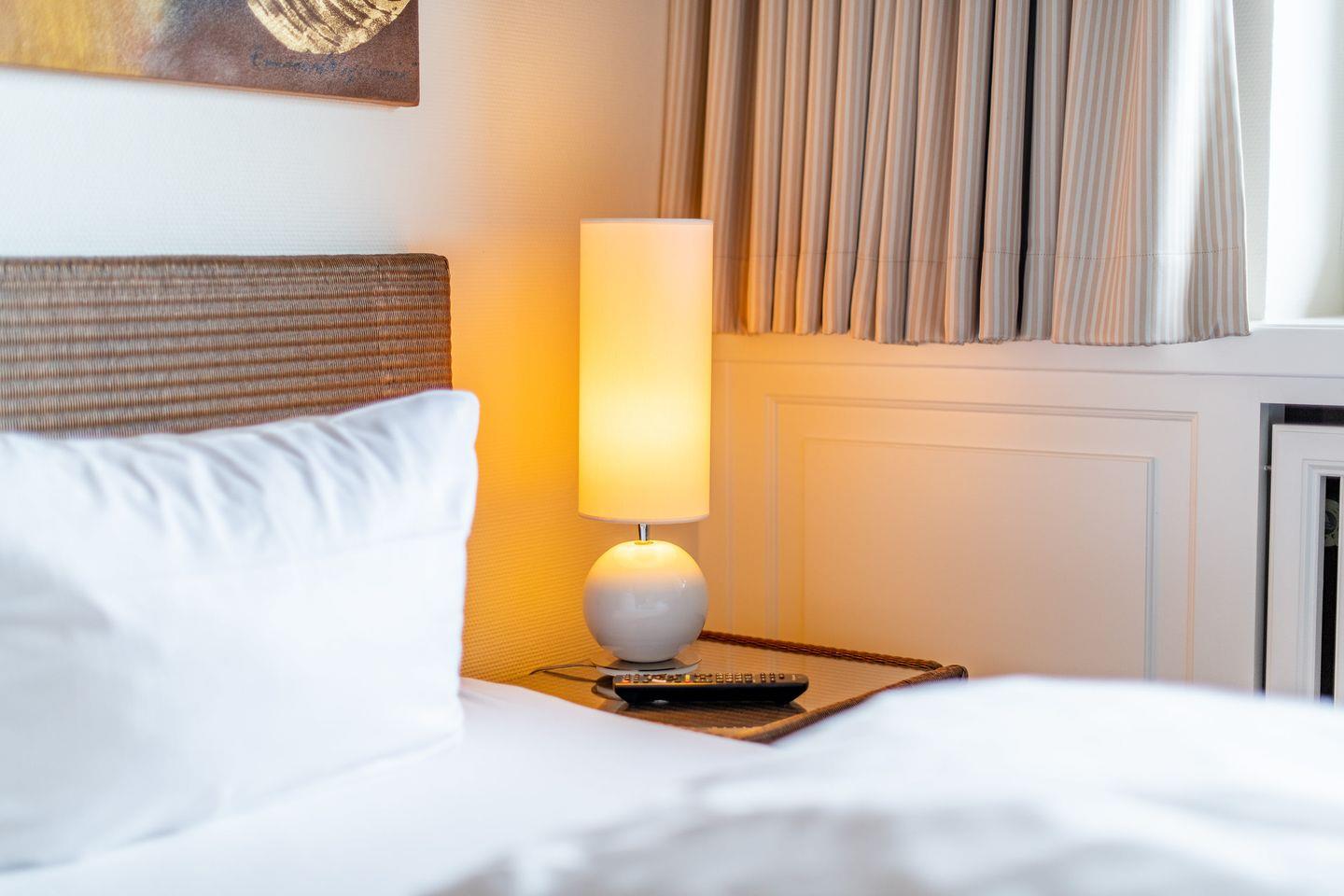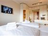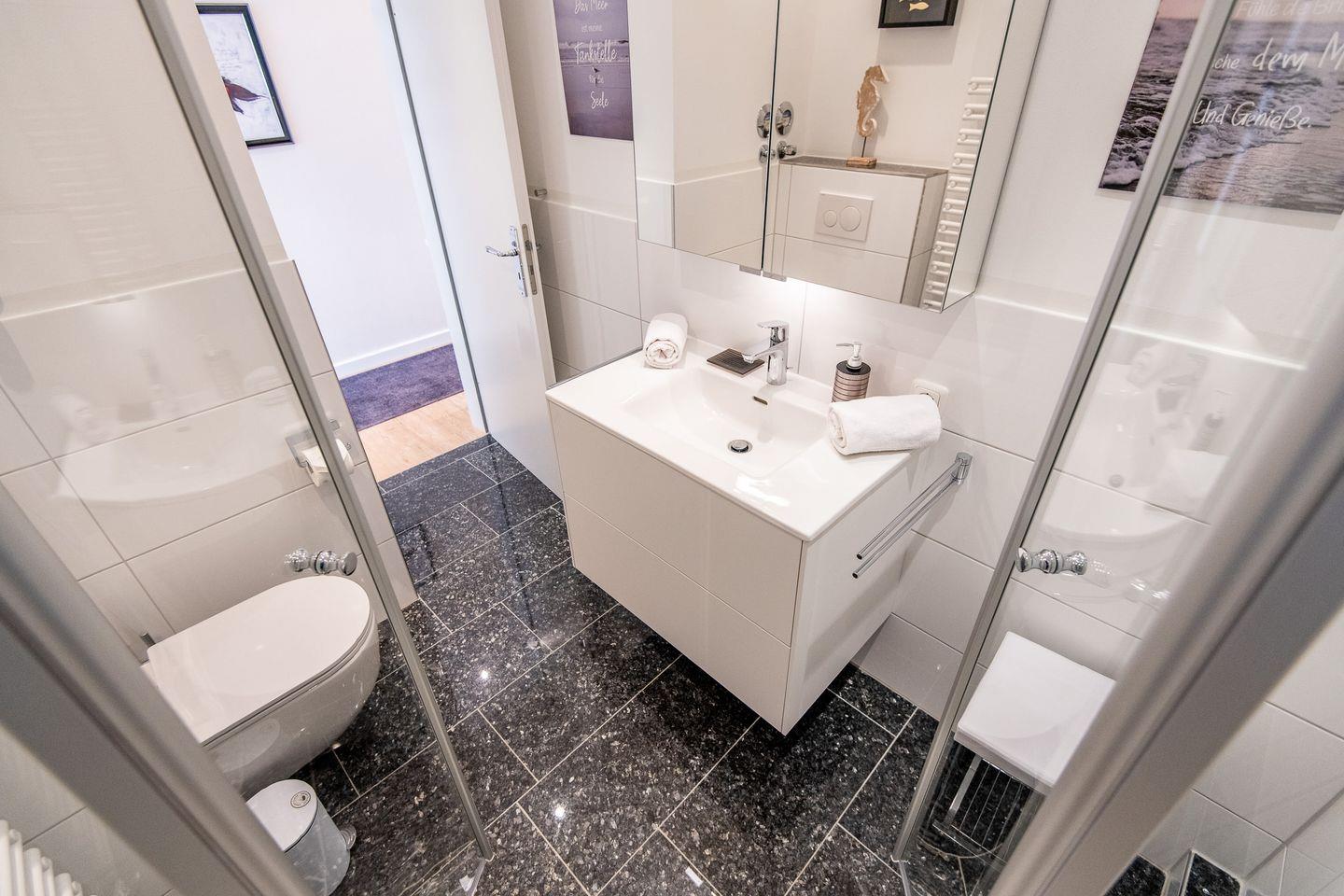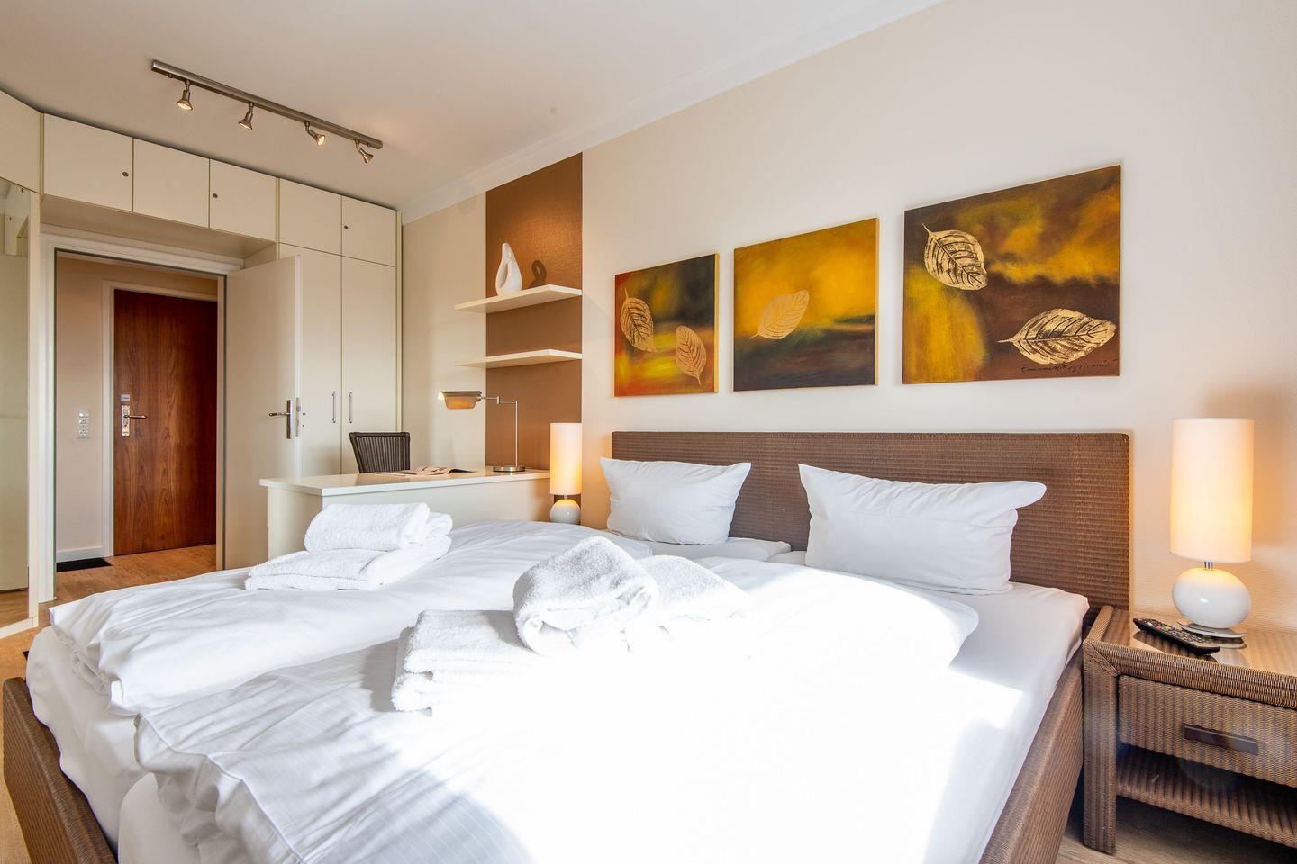 Das Schlafzimmer ist mit einem komfortablen Doppelbett (2x 90x190 cm), einem Schreibtisch, Einbauschränken und einem TV ausgestattet. Das Badezimmer verfügt über eine Dusche, ein WC und einen Handtuchwärmer.