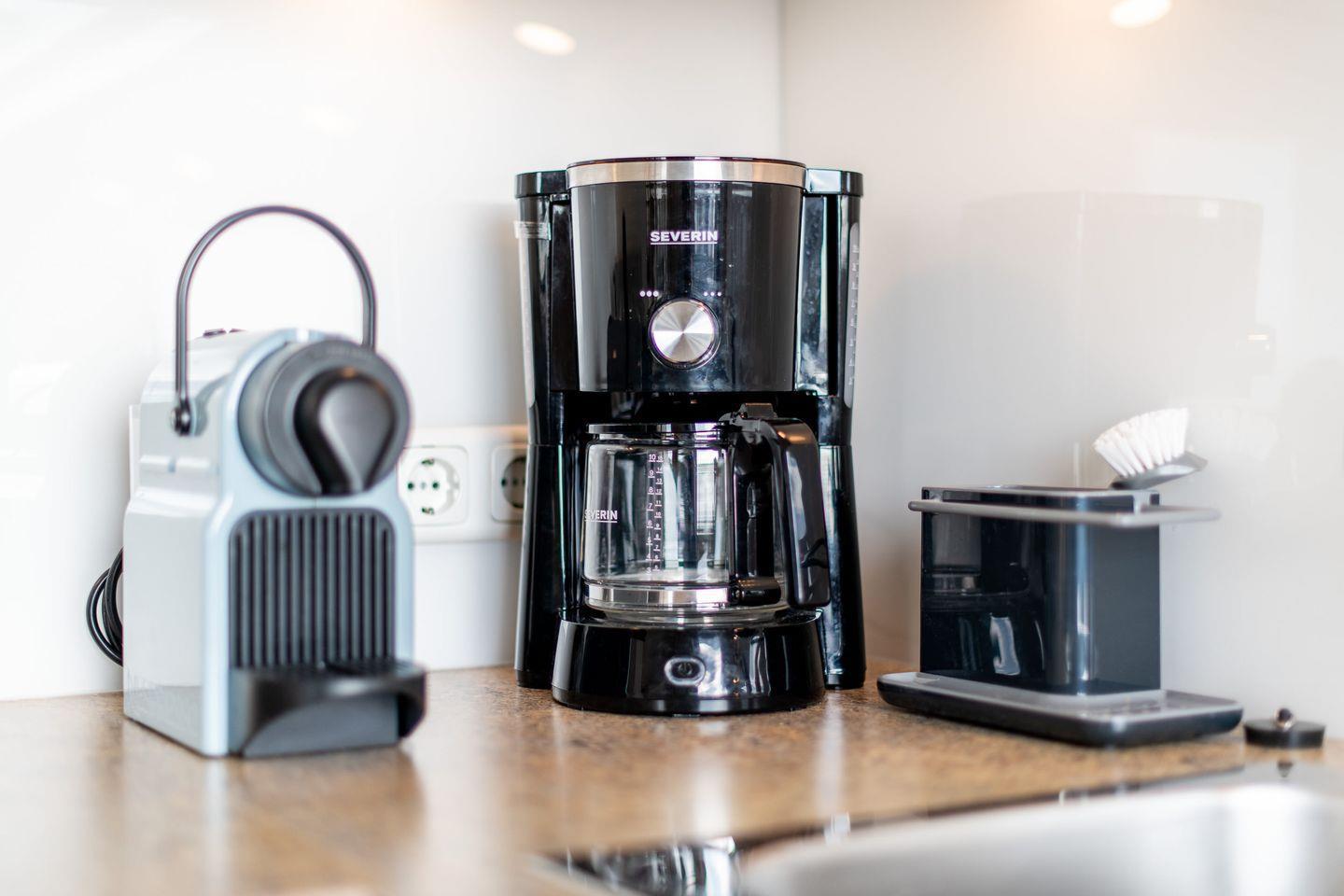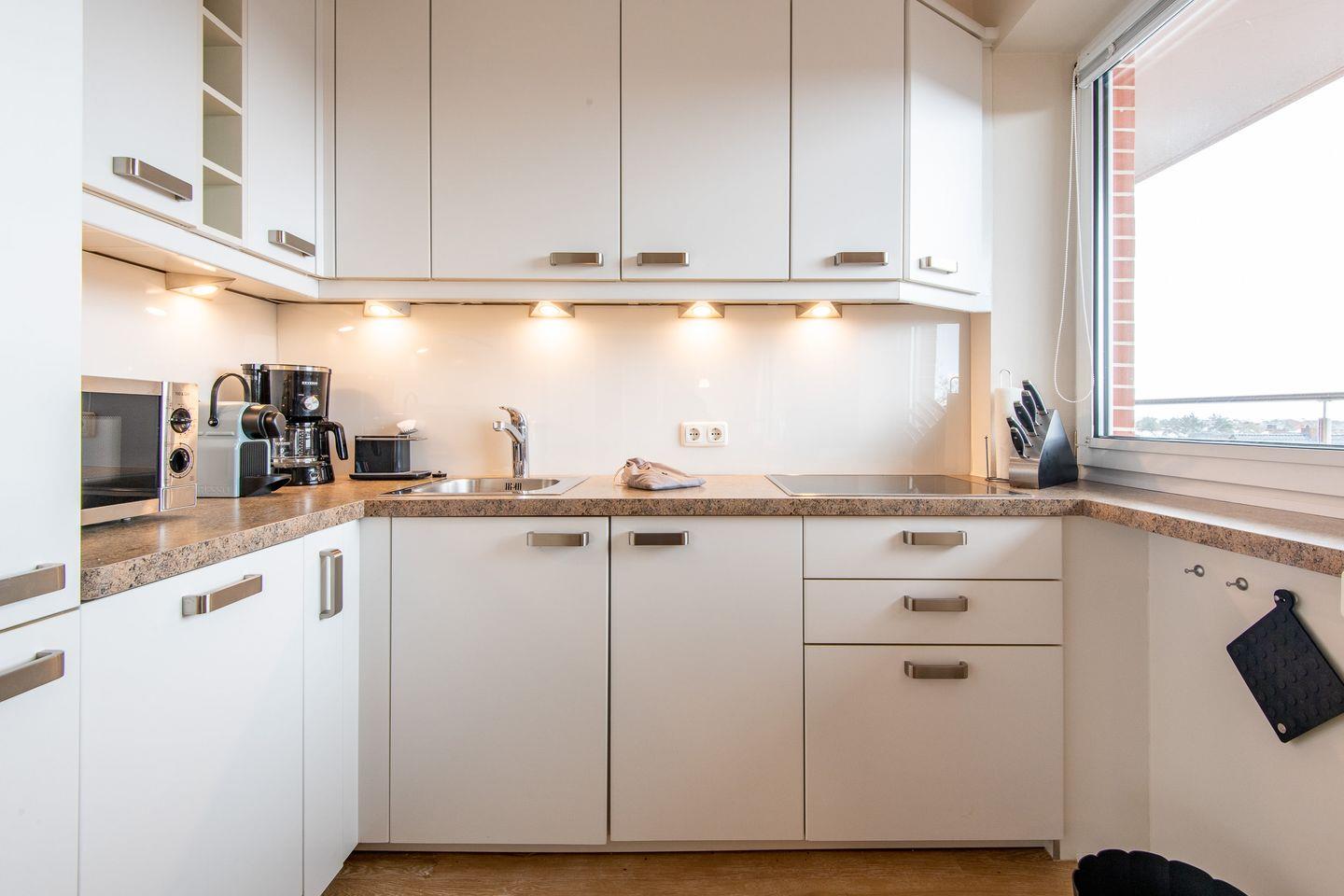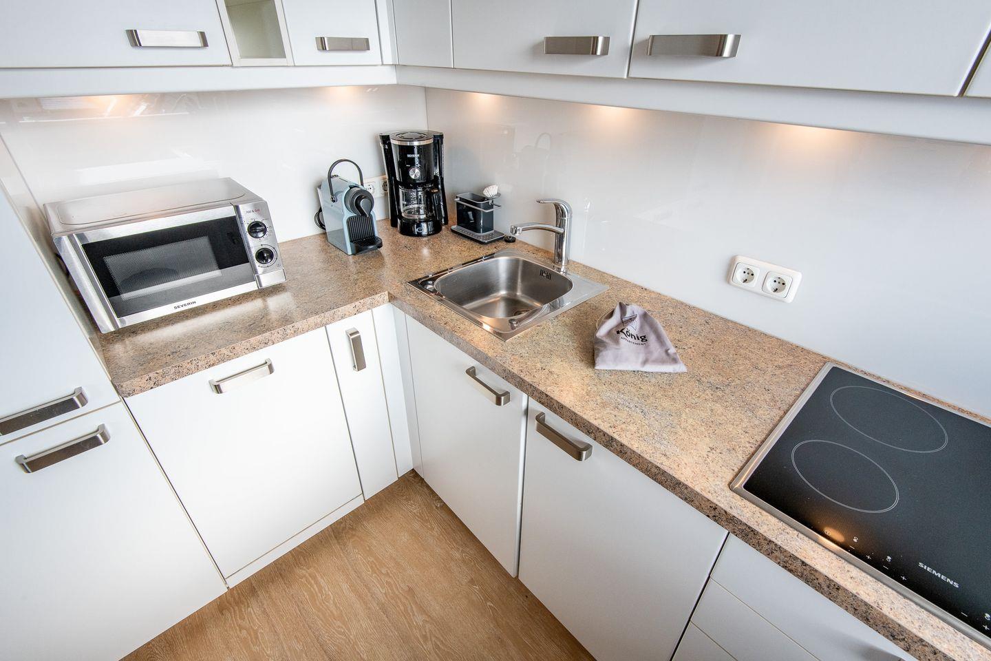 Die moderne, offene Küche ist vollständig ausgestattet und bietet alles, was Sie für Ihre Mahlzeiten benötigen. Zur Ausstattung gehören ein Cerankochfeld, ein Geschirrspüler, eine Filterkaffeemaschine sowie eine Nespresso-Maschine.