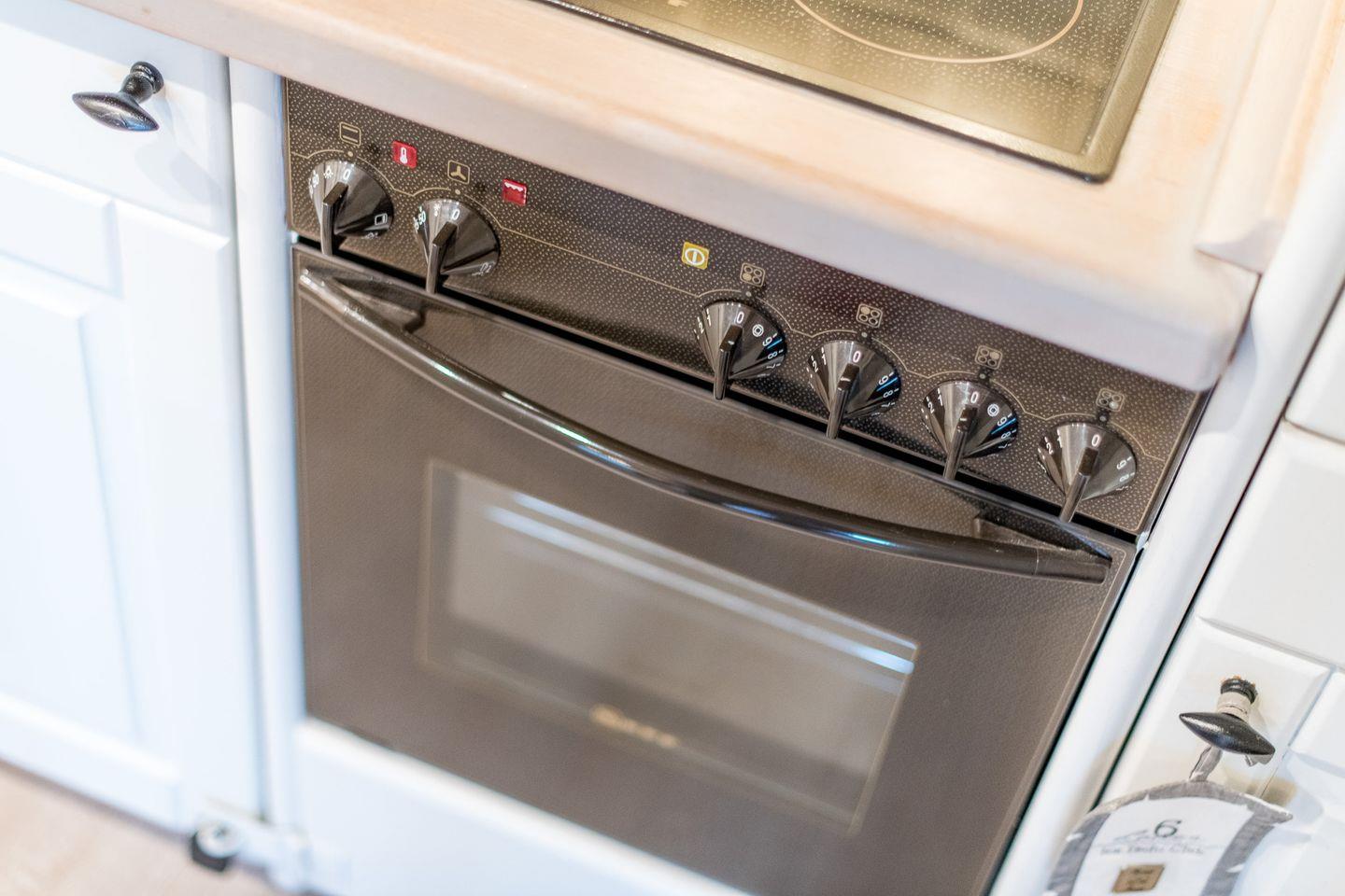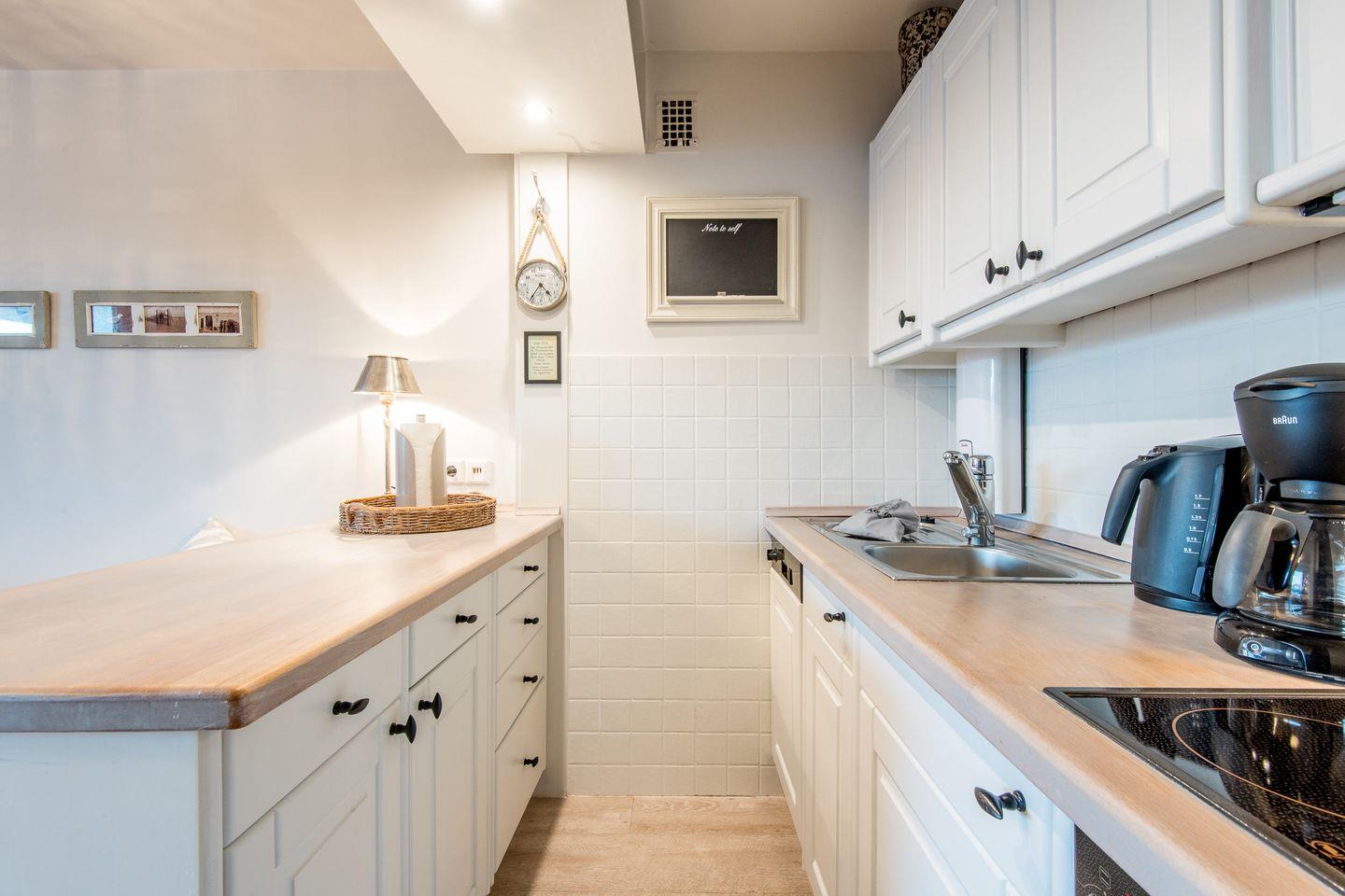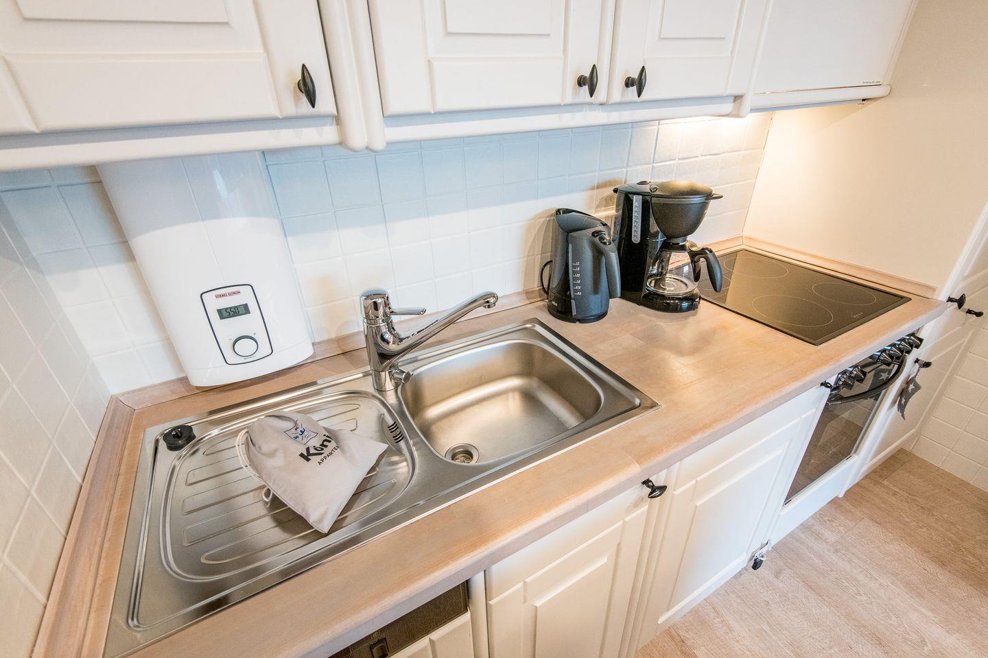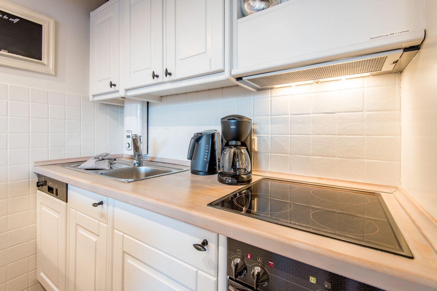 Die Küche ist offen gestaltet und mit allen modernen Annehmlichkeiten ausgestattet. Mit Cerankochfeld, Geschirrspüler und Filterkaffeemaschine ist sie bestens für die Zubereitung von Mahlzeiten eingerichtet.