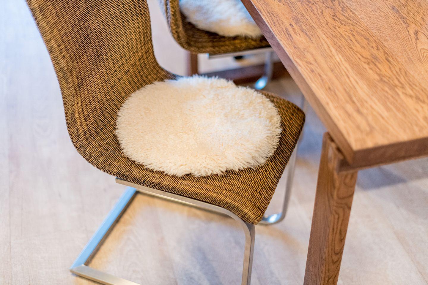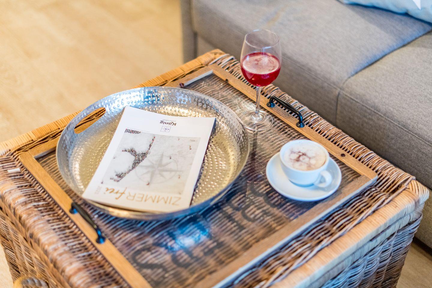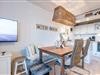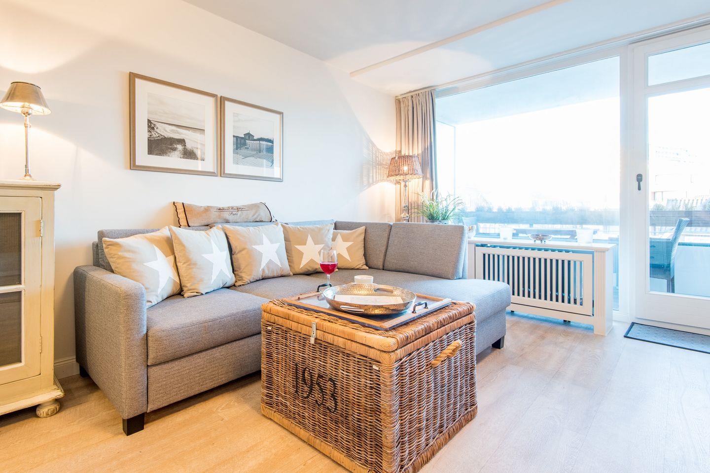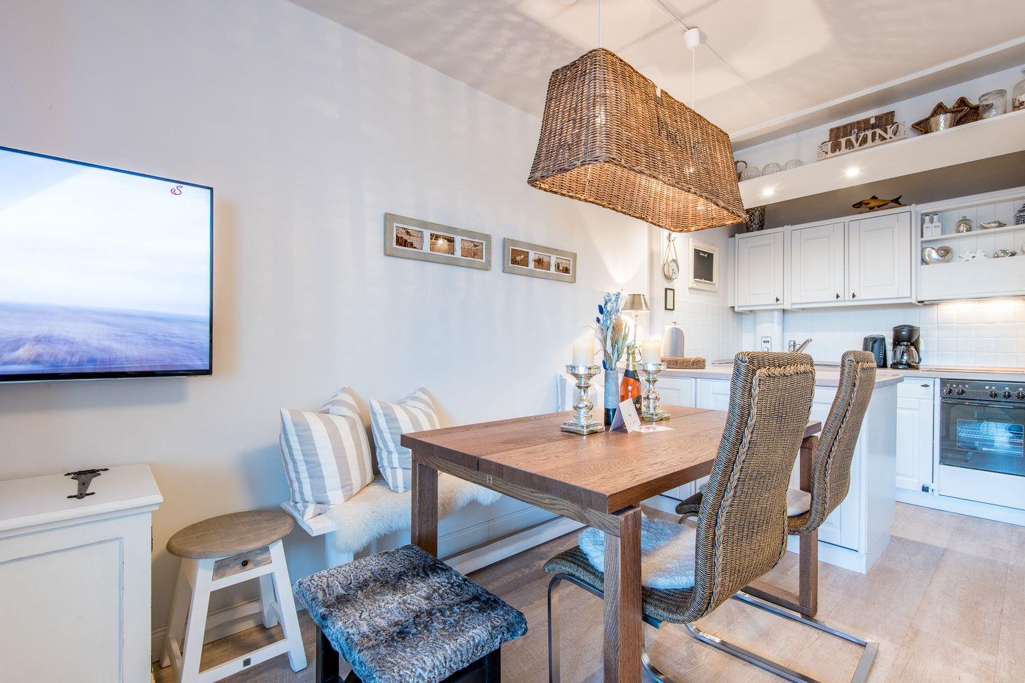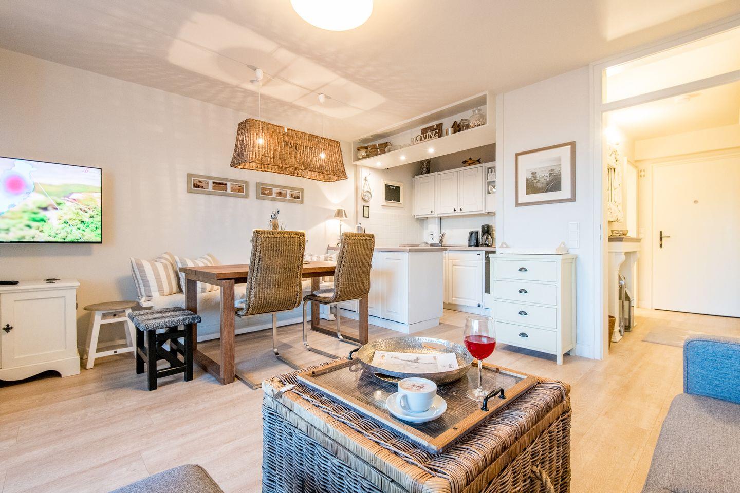 Das helle Wohnzimmer ist mit einem komfortablen Sofa, einem Sessel und einem Esstisch für bis zu 2 Personen ausgestattet. Ein TV sorgt für Ihre Unterhaltung. Der direkte Zugang zum Balkon nach Norden ermöglicht es, die frische Nordseeluft zu genießen – ideal für ein Frühstück oder eine entspannte Auszeit am Nachmittag.