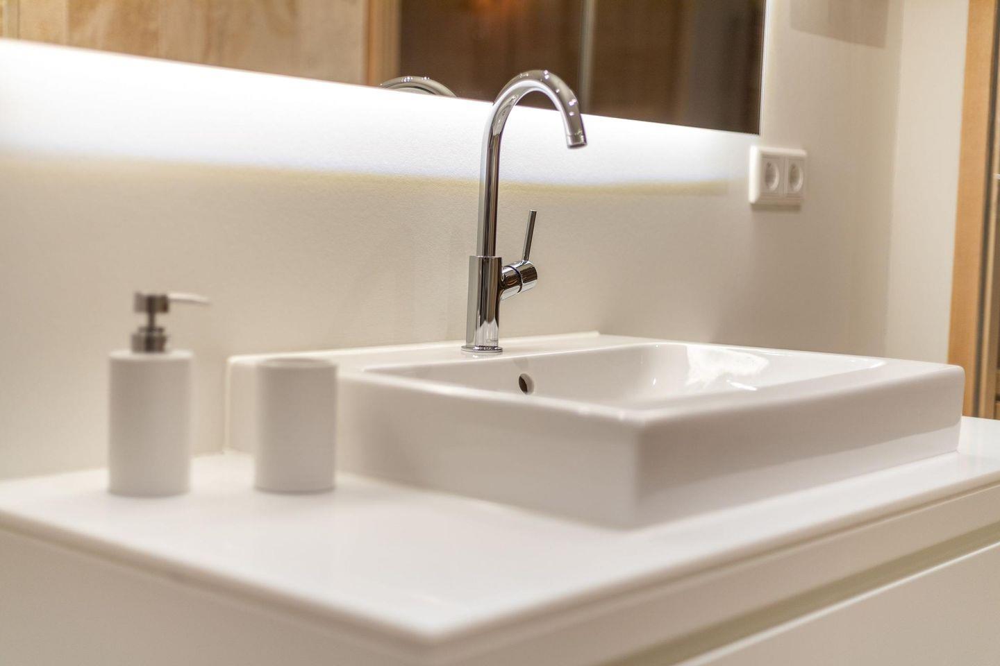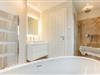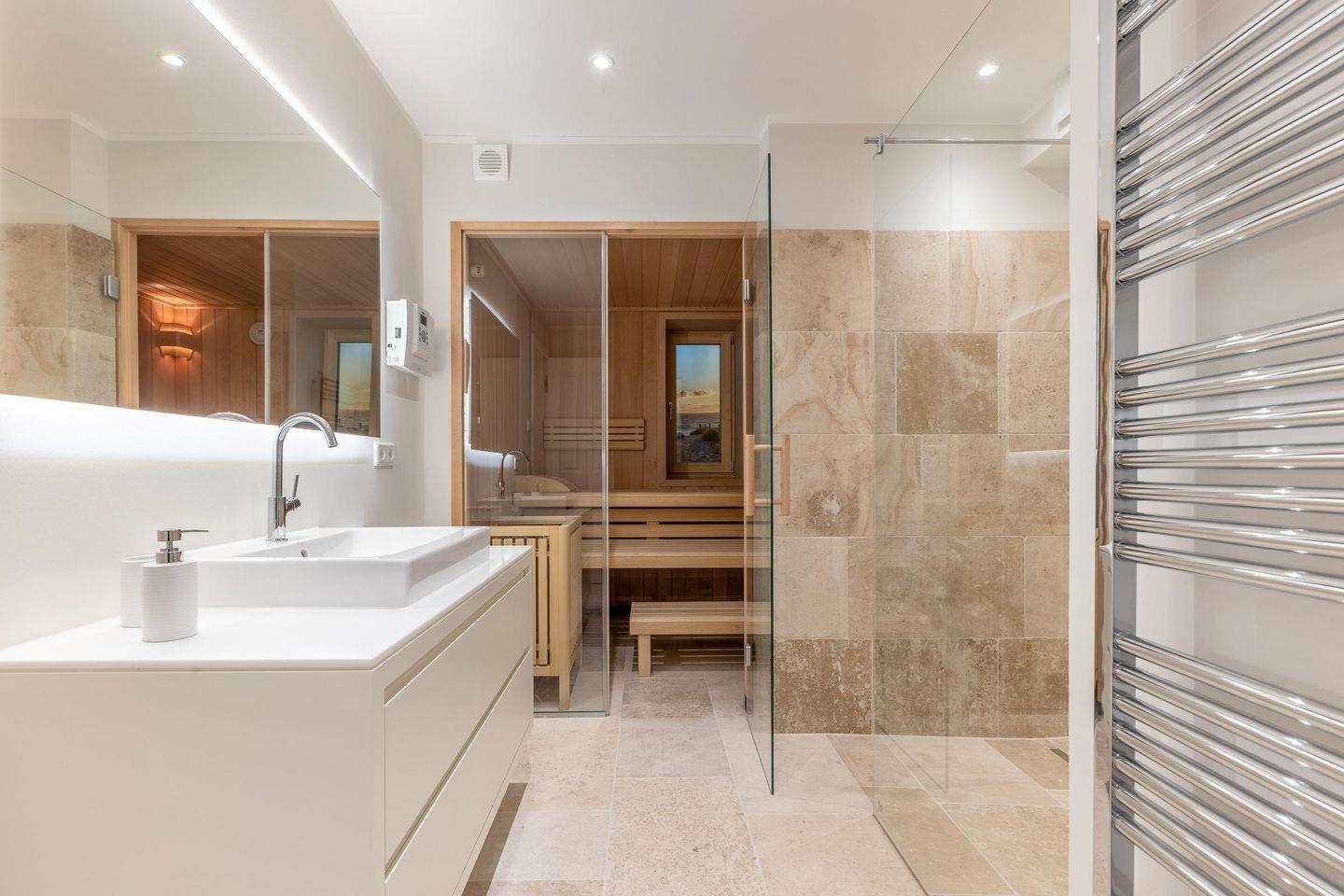 Das erste Badezimmer ist ein modernes Vollbad mit freistehender Badewanne, ebenerdiger Regendusche, WC, Handtuchwärmer und Föhn. Das zweite Badezimmer verfügt über eine weitere ebenerdige Regendusche und Handtuchwärmer. Zwei separate WCs und eine große Sauna bieten zusätzlichen Komfort.