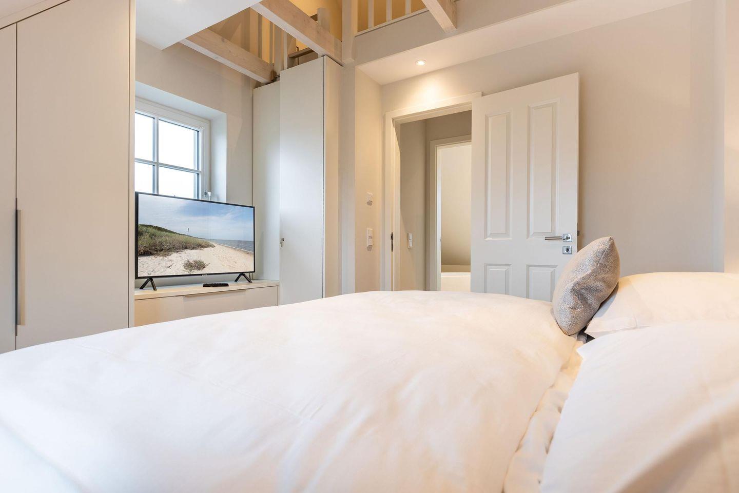 Das Haus verfügt über drei Schlafzimmer, die jeweils mit hochwertigen Hotelboxspringbetten (1x 200x200 cm, 2x 180x200 cm), Smart-TVs und Einbauschränken ausgestattet sind – ideal für erholsame Nächte.