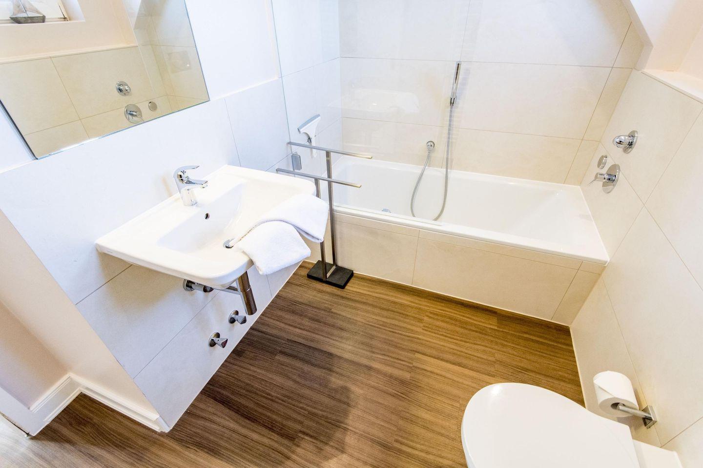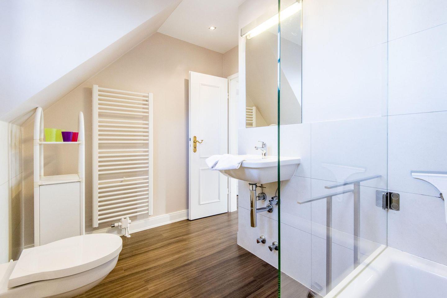 Das Badezimmer ist lichtdurchflutet und verfügt über eine Badewanne, eine Regendusche und ein WC.
